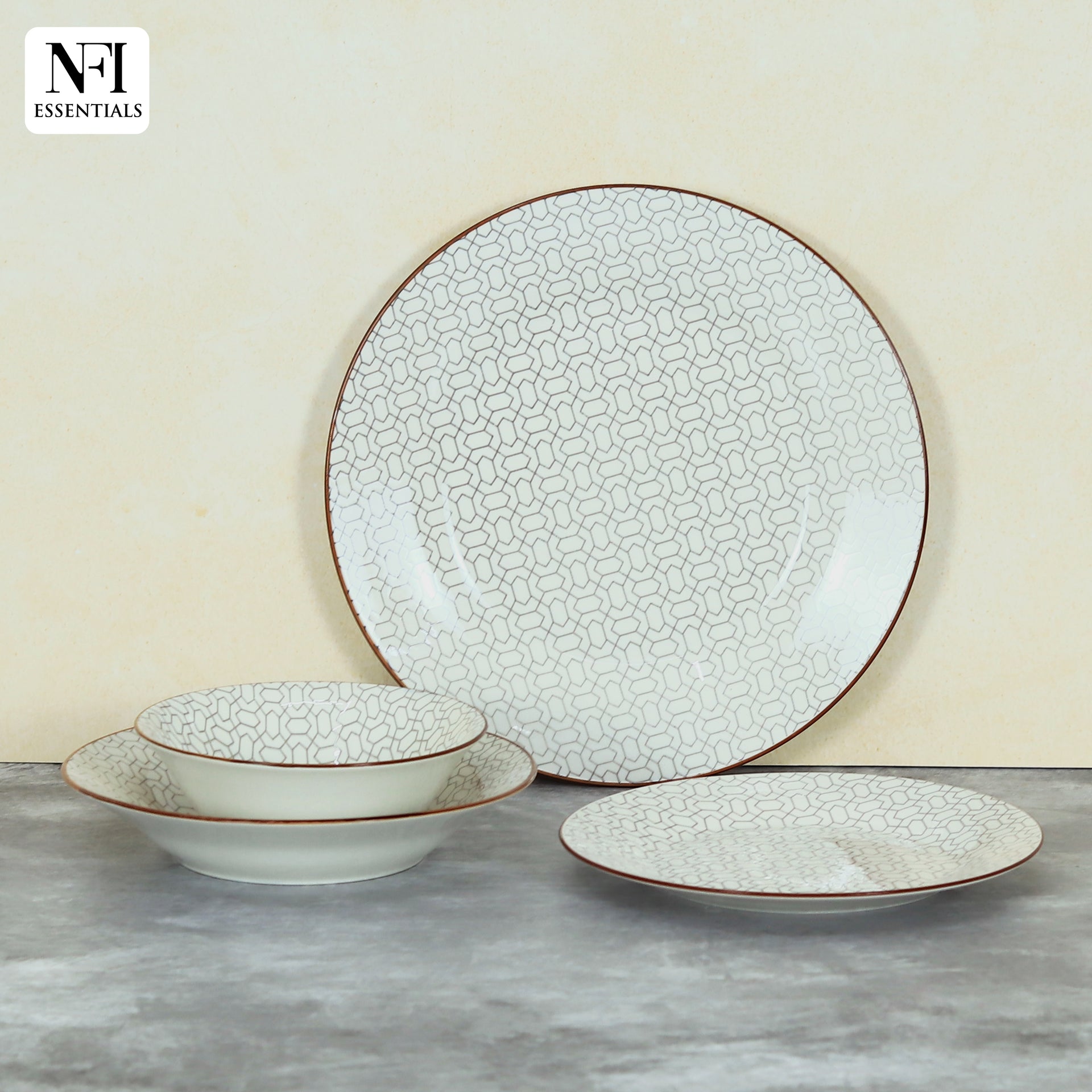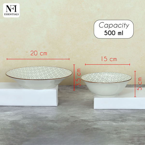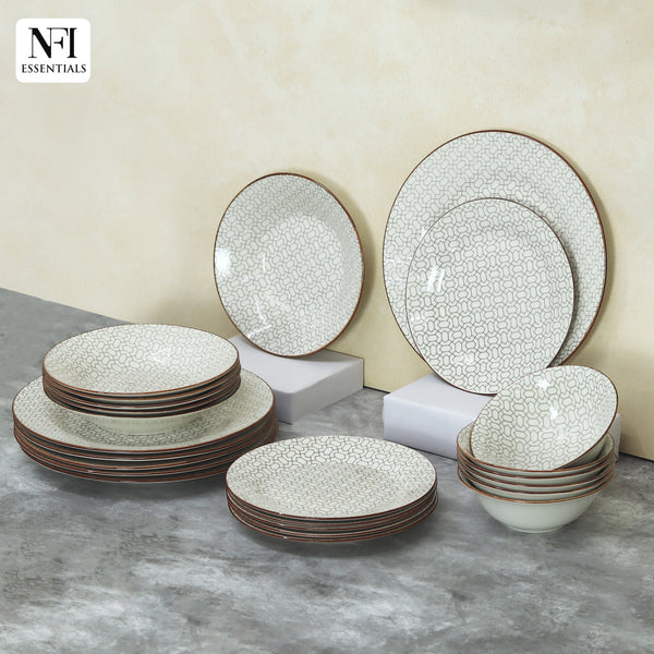 NFI essentials 24 pcs Ceramic Dinner Set for Dining Interlocking Pattern Microwave and Dishwasher Safe Crockery Set Quality Porcelain 6 Dinner Plates, 6 Quarter Plate, 6 Salad Plate & 6 Set Of Bowls