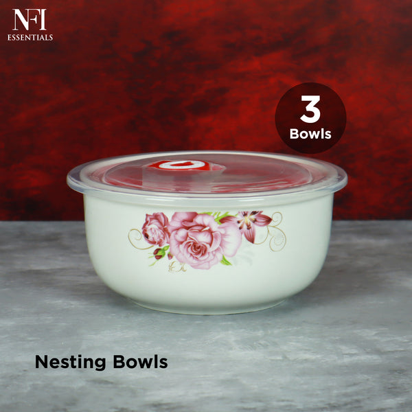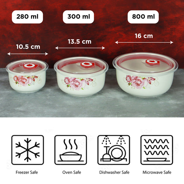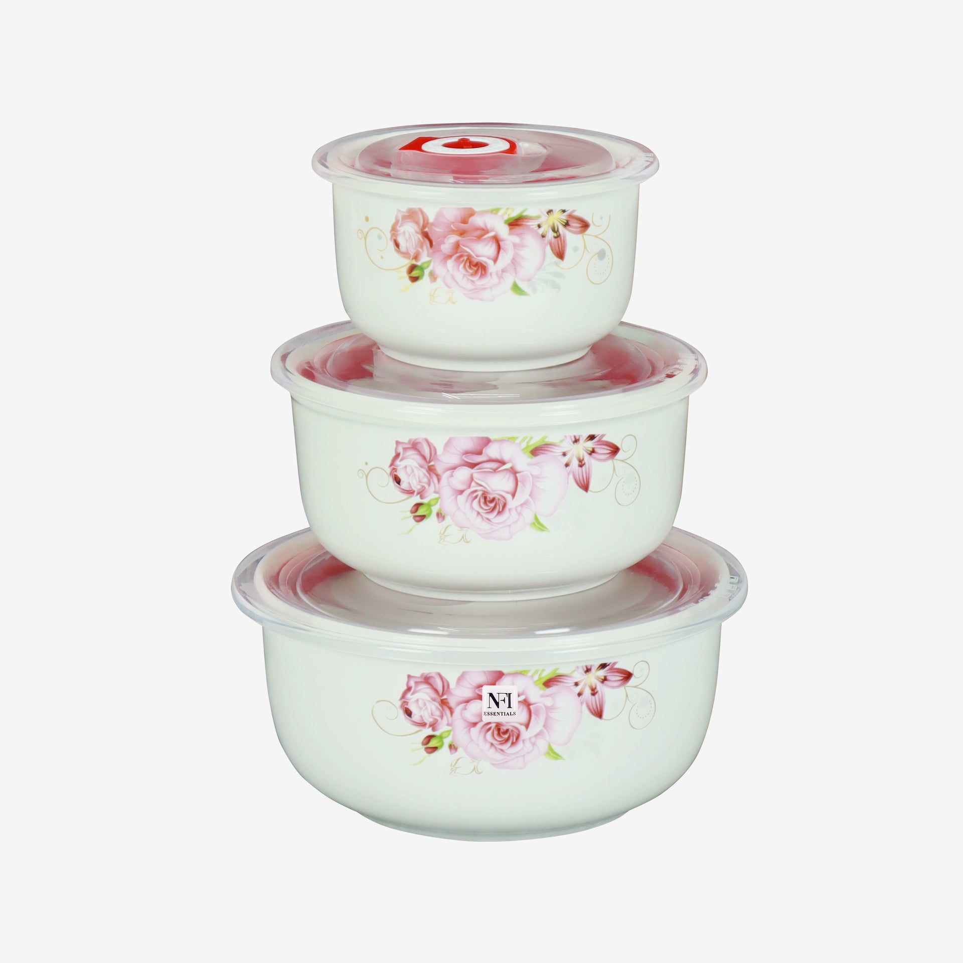 NFI essentials 3 Pcs Ribbed Ceramic Bowl Set with Airtight Lids Ideal for Food Storage, Serving, and Meal Prep Microwave Safe, Freezer Safe, Dishwasher Safe (Large- 800ml,Meduim- 500ml & Small- 280ml)