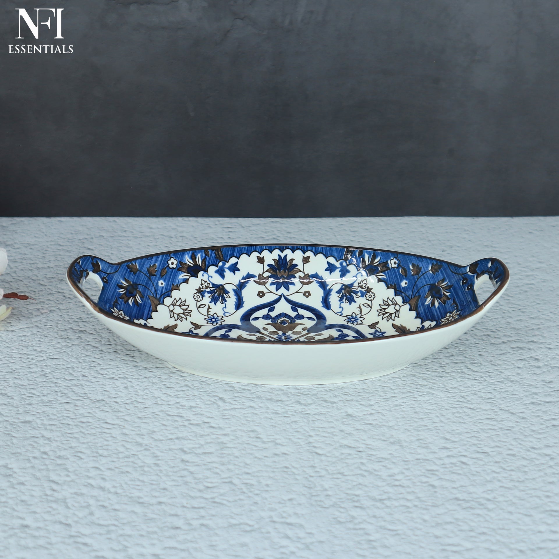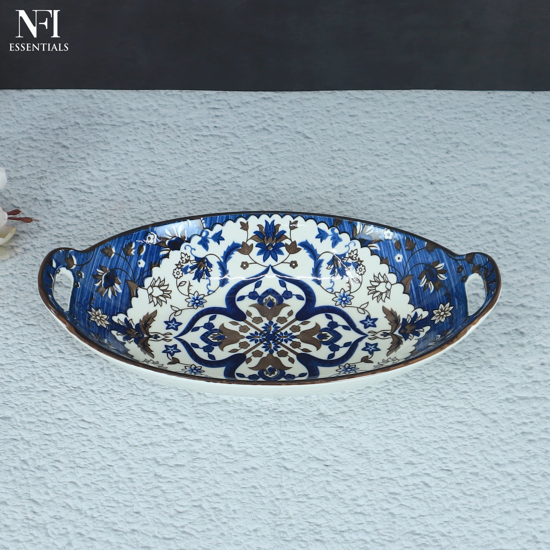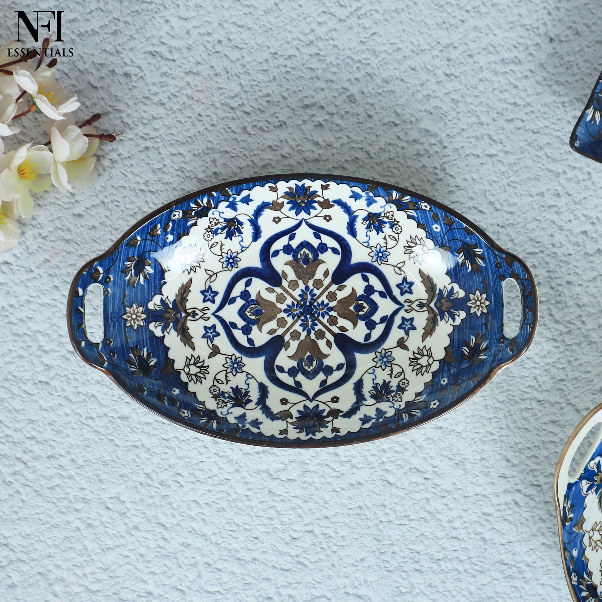 NFI essentials Ceramic Serving Platter with Handles Blue Mandala Design for Snacks, Appetizers, Salads, and Noodles | Safe for the Microwave and Dishwasher (10.8 inch)