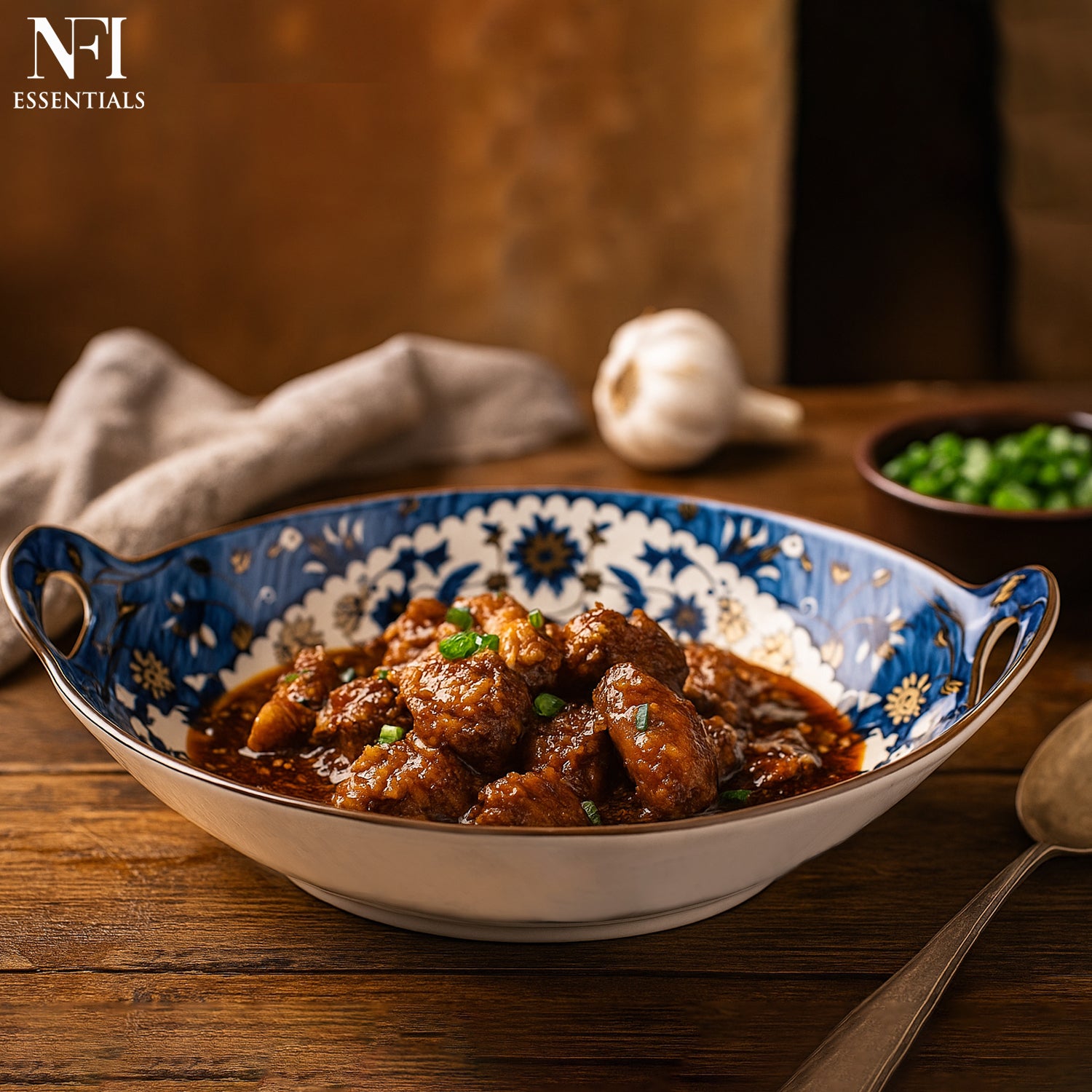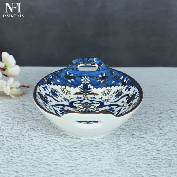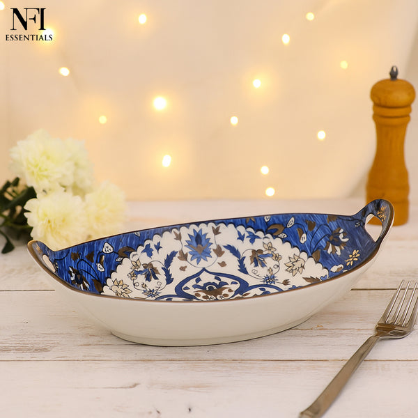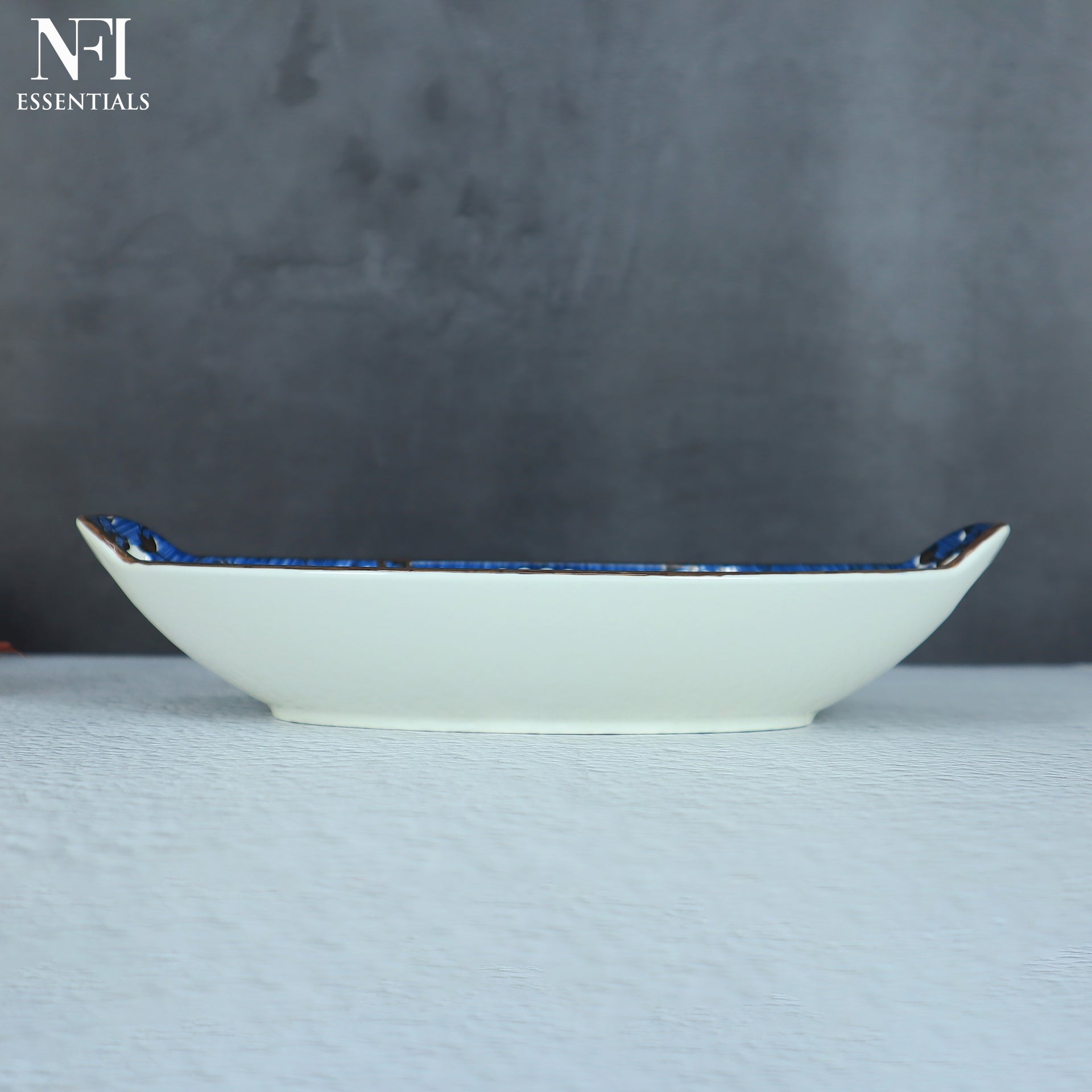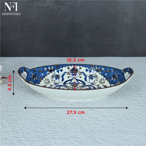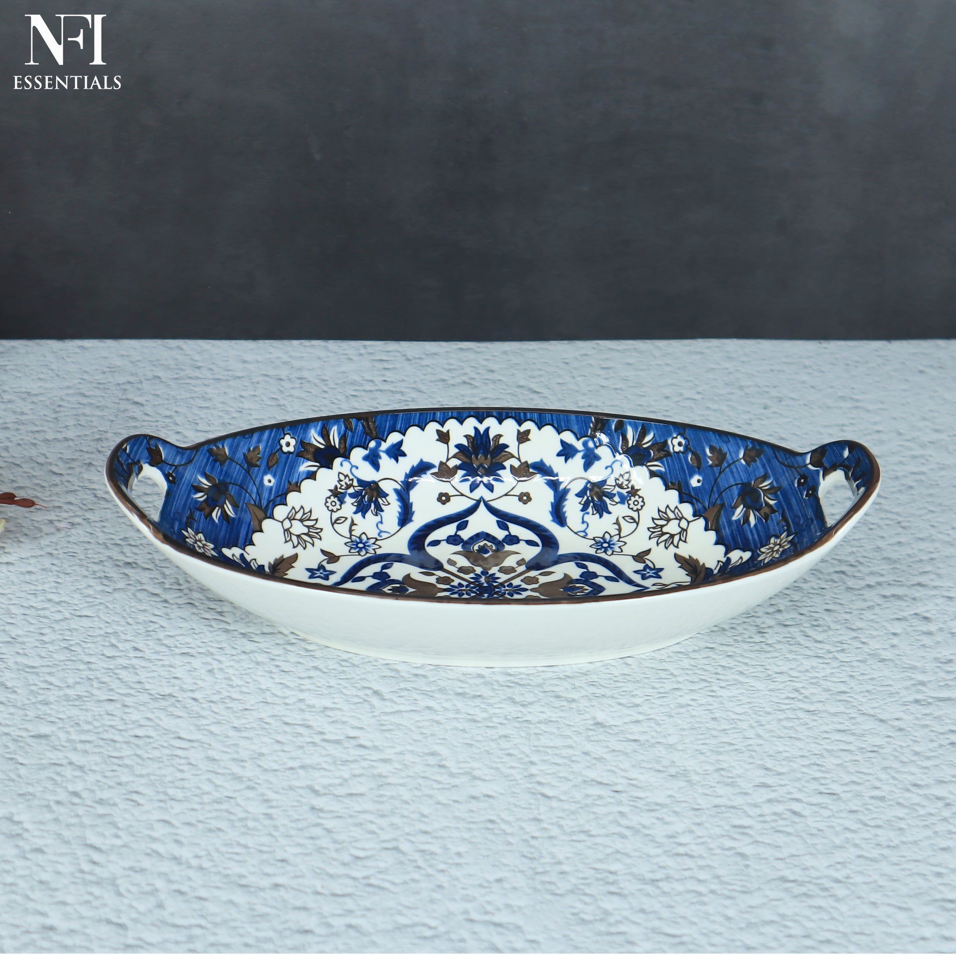 NFI essentials Ceramic Serving Platter with Handles Blue Mandala Design for Snacks, Appetizers, Salads, and Noodles | Safe for the Microwave and Dishwasher (10.8 inch)