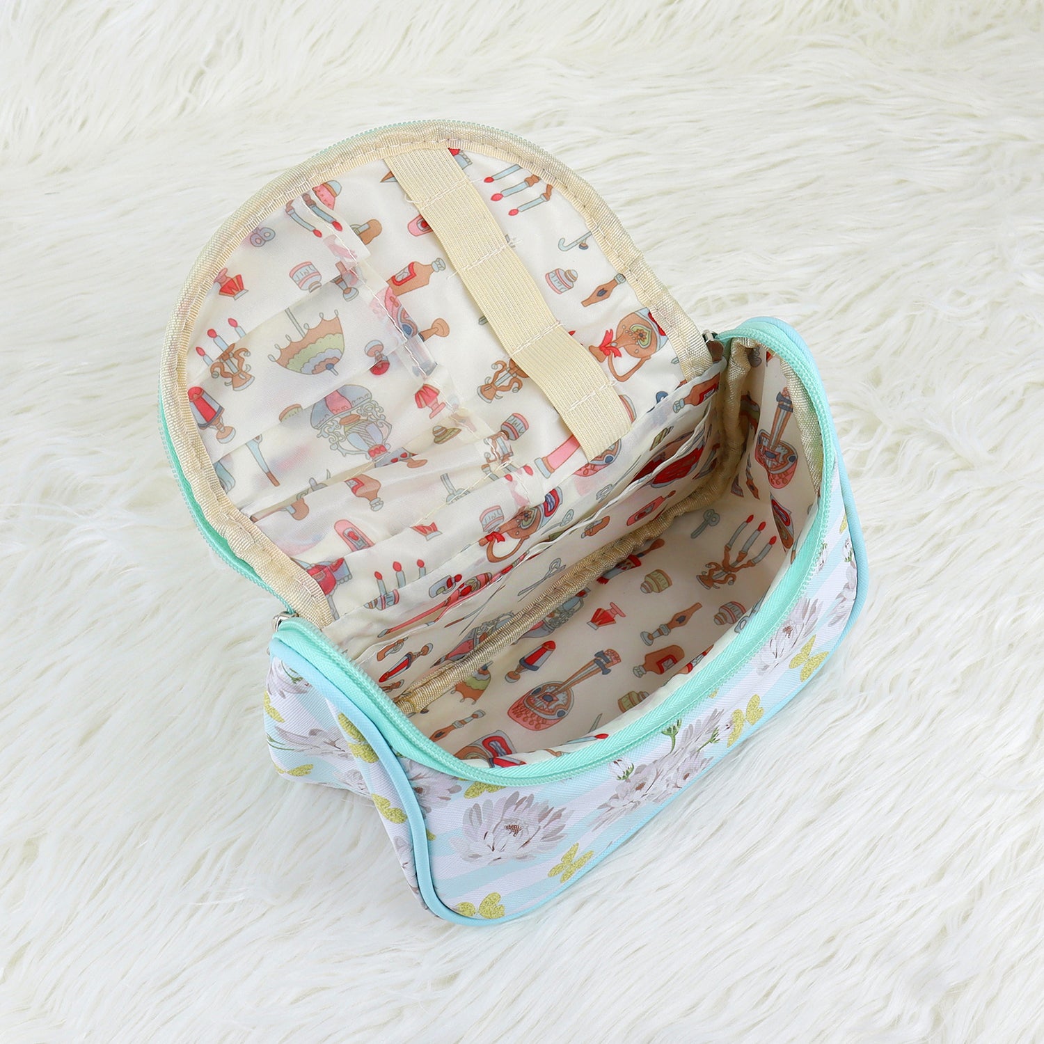 This beautiful looking Cosmetic / Vanity/Jewellery Bag is inspired by the European pattern. The Smart Makeup Organizer comes with 5 separate elastic loops for Makeup Brushes, Eyeliner or Shaver, it is easy to fix and access your accessories; An inner compartment pocket could help organize your small items like tissue or makeup cotton. This Multifunctional Cosmetic Bag not only can storage your cosmetics, but also Jewellery, Electronic Accessories, Camera, Essential oil, Toiletries, Shaving Kit, Valuable objects and so on. It has smooth zipper and durable handle and precise stitching. Classic and solid bright color make the toiletry bag very trendy & beautiful which adds shining stars to your personality.