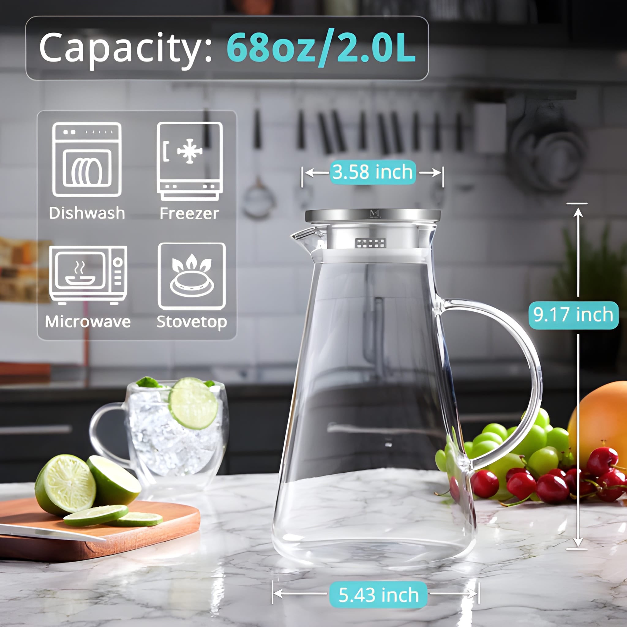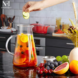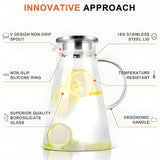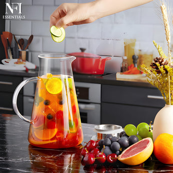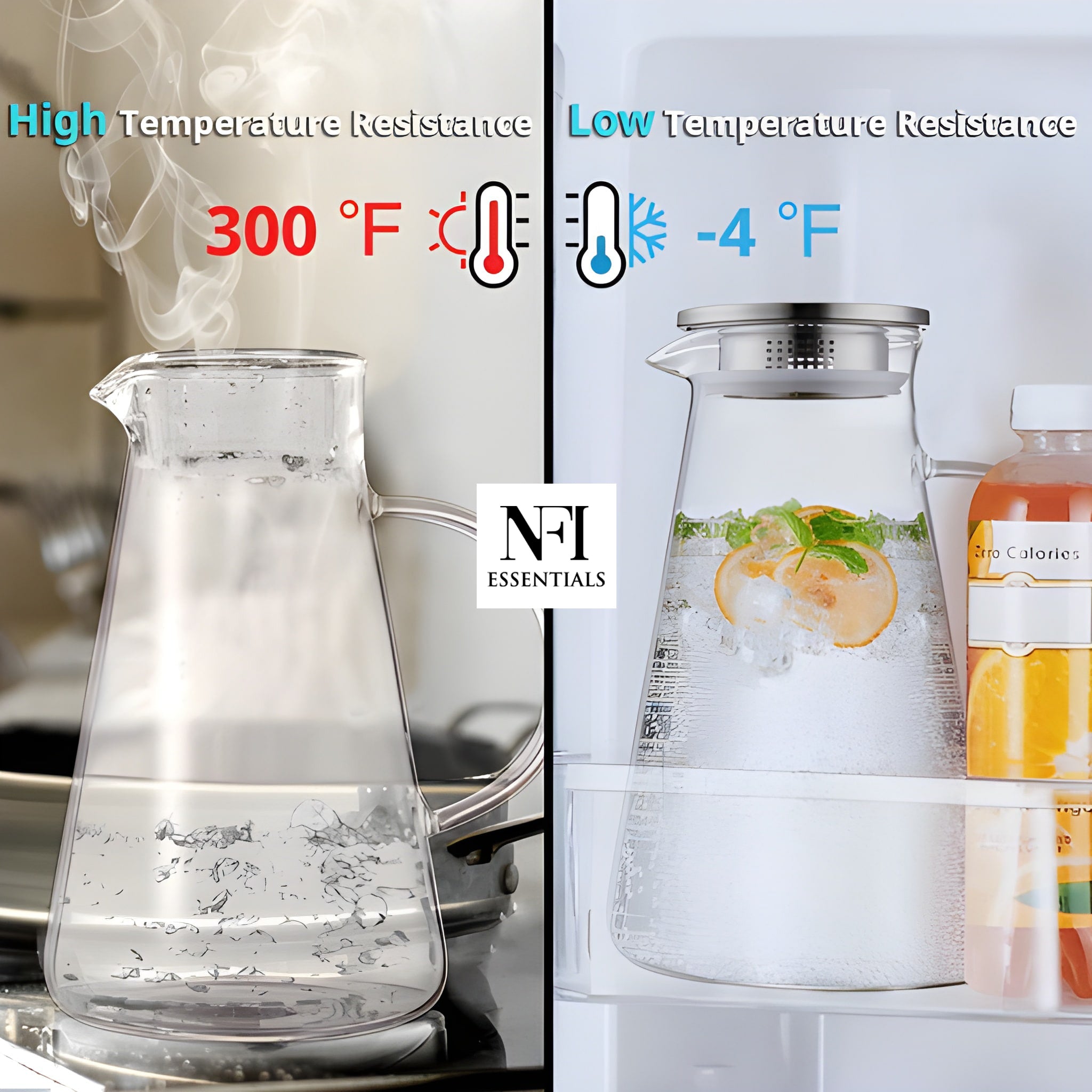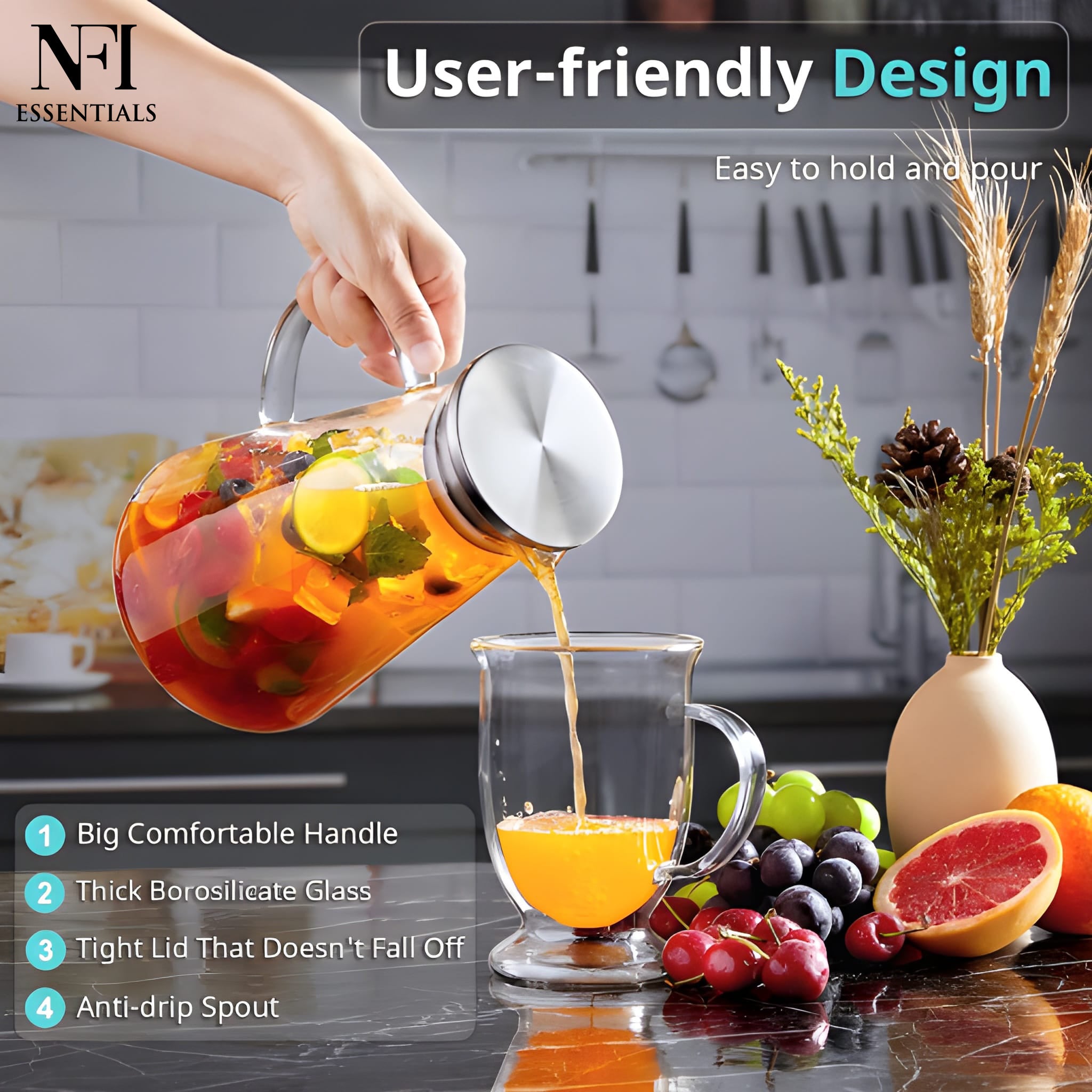 NFI essentials Water Pitcher Borosilicate Glass Jug with Air Tight Steel Lid & handle for Serving Water, Juices & Cool Beverages Freezer Safe (1800ml)