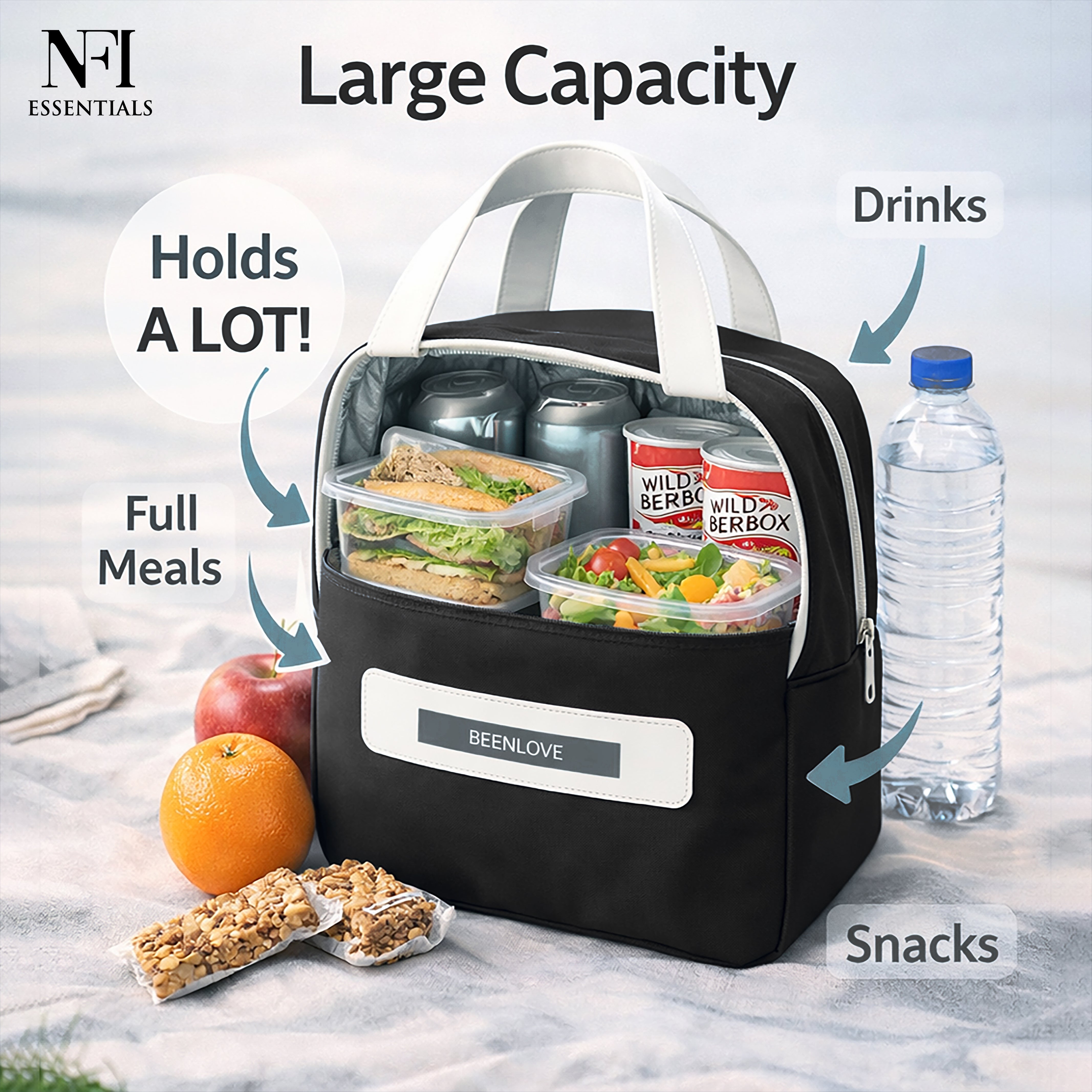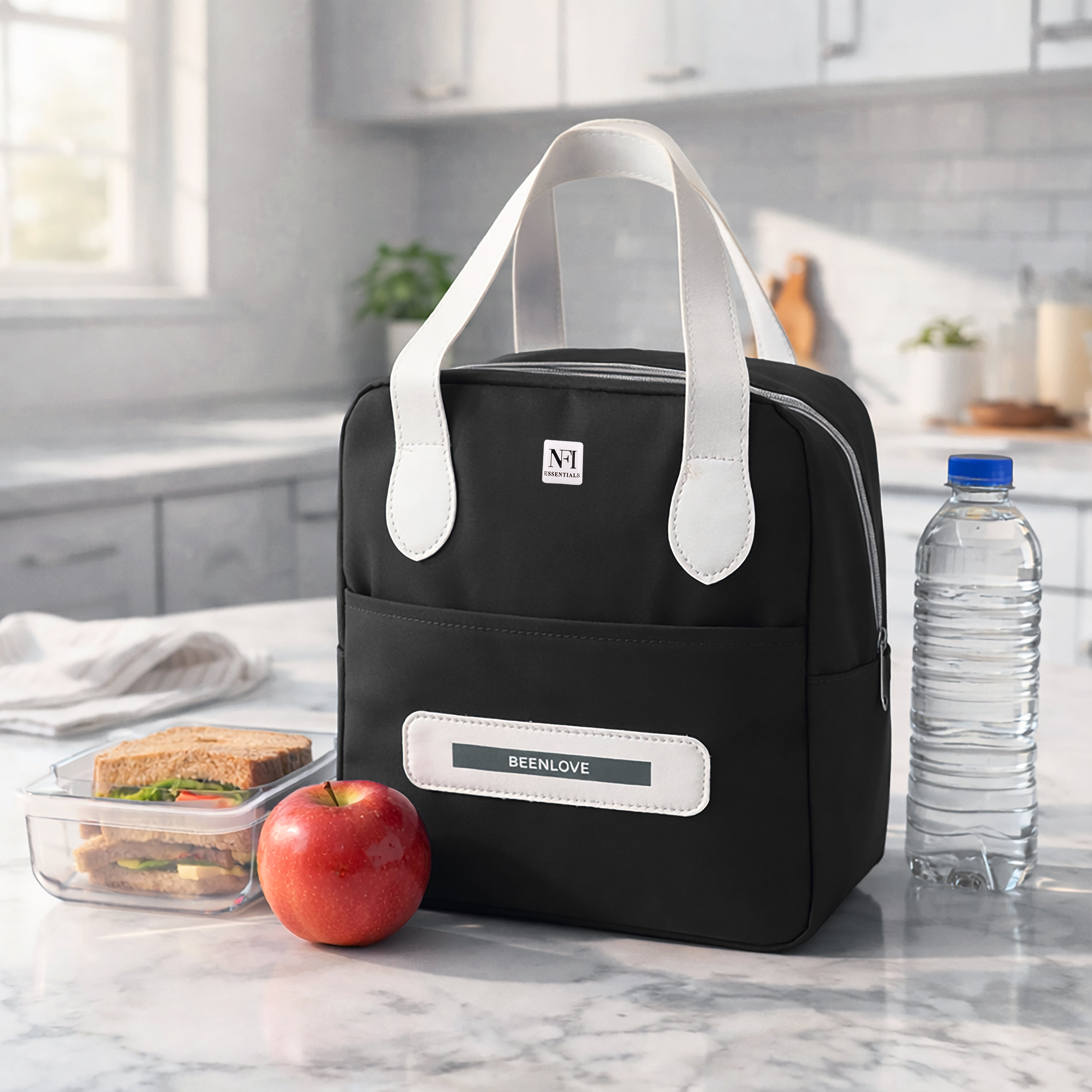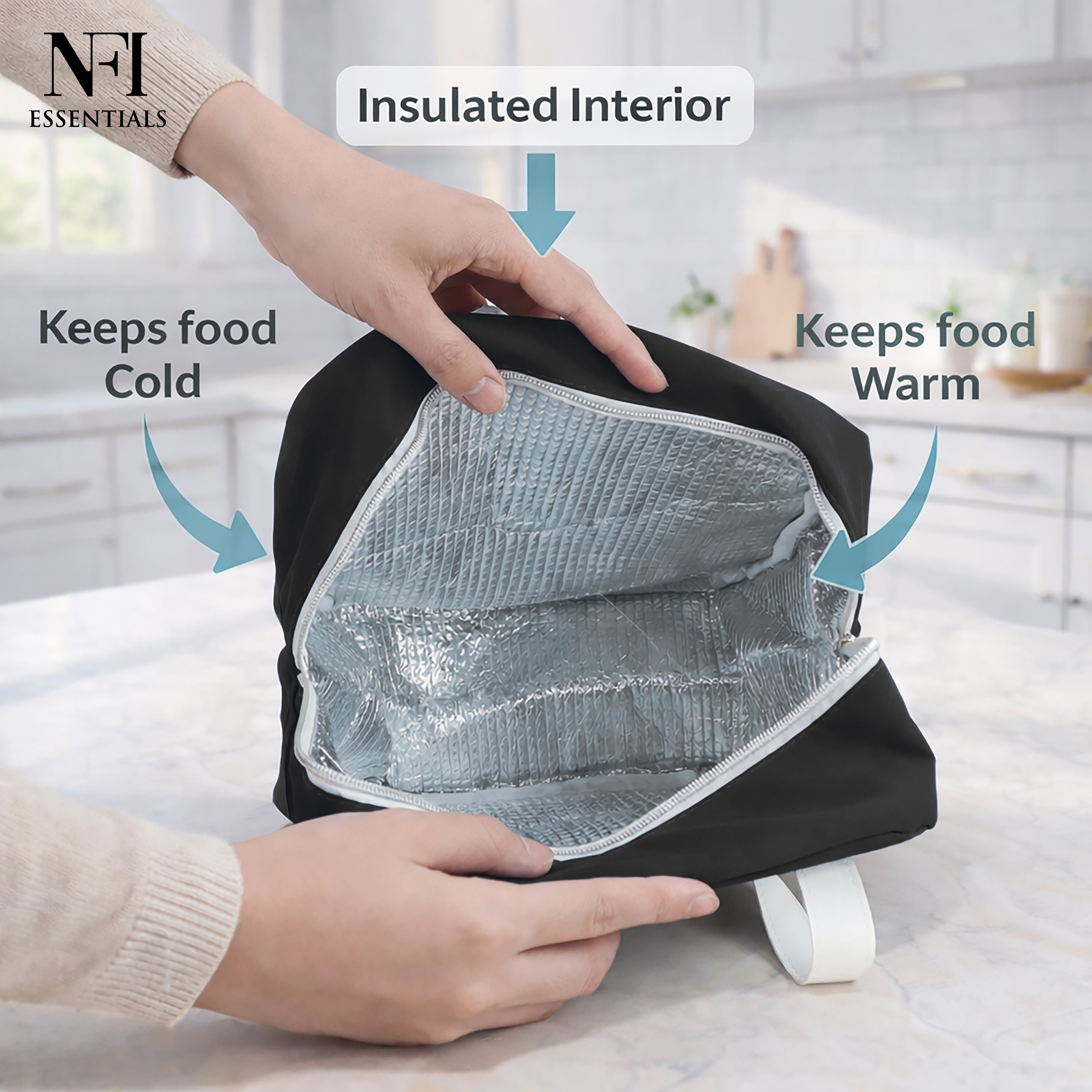 NFI essentials Insulated Lunch Bag for Men Women Large Tiffin Carry Bag Travel Lunch Box Organizer for Office, School, College, Leak-proof Lunch Cooler Bag (Black)