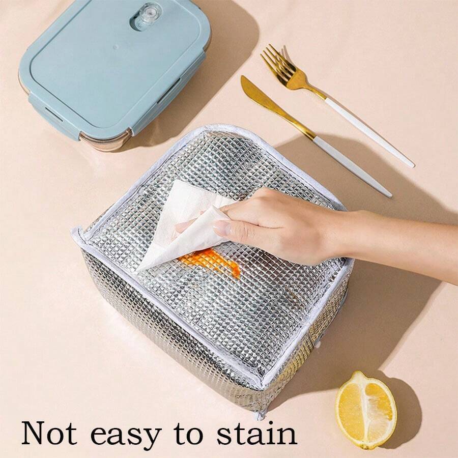 Stylish and portable lunch bag for women/men, can be used in any scene, such as office, outdoor, school, college, beach etc. Our high quality and durability cute insulated lunch bags are definitely worth giving it as a gift to your relatives and friends. Smooth zipper, high quality, secure zipper closure, and metal buckle ensure smooth to open. Wide opening design, make it easier for you to take food. The strong stitched handles makes the hand more comfortable when lifting heavy objects. It's strong and durable, not easy to slip off. Practical front pocket is designed for putting small issues like your cutlery, phone, keys, tissue, napkin paper and cards. High-quality Foil Lining is water and oil resistant. Easily cleaned by wiping with a damp cloth. It solves the problem of oil stains remaining on the lunch bag for a long time. The bag is constructed from durable materials that are designed to withstand daily use. It is easy to clean, allowing you to maintain cleanliness and hygiene by keeping the bag free from spills and food residues. This lunch bag is versatile and can be used for various occasions. Whether you're going to work, school, traveling, or having a picnic, the bag is designed to meet your needs for transporting meals and snacks. It solves the problem of oil stains remaining on the lunch bag for a long time. Features Large Capacity Wide-open Design Durable & Heavy Duty Excellent Thermal Insulation Leakproof & Easy-to-clean. Lunch bag equipped with extra thick waterproof liner, premium eco-friendly oxford fabric and built-in thick foam insulation material. So our insulated lunch bag will keep your food/drinks at the optimal temperature and enables excellent insulation effect up to many hours, so you can always recharge with warm tasty food and cold drinks! If you put the small lunch bag in a backpack, the insulation performance will be better.