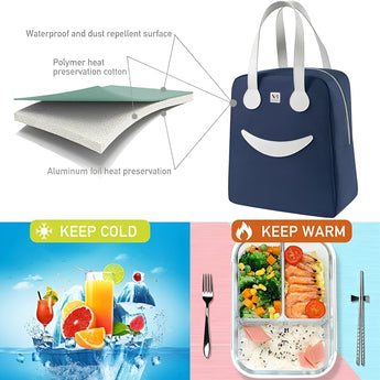 Stylish and portable lunch bag for women/men, can be used in any scene, such as office, outdoor, school, college, beach etc. Our high quality and durability cute insulated lunch bags are definitely worth giving it as a gift to your relatives and friends. Smooth zipper, high quality, secure zipper closure, and metal buckle ensure smooth to open. Wide opening design, make it easier for you to take food. The strong stitched handles makes the hand more comfortable when lifting heavy objects. It's strong and durable, not easy to slip off. Practical front pocket is designed for putting small issues like your cutlery, phone, keys, tissue, napkin paper and cards. High-quality Foil Lining is water and oil resistant. Easily cleaned by wiping with a damp cloth. It solves the problem of oil stains remaining on the lunch bag for a long time. The bag is constructed from durable materials that are designed to withstand daily use. It is easy to clean, allowing you to maintain cleanliness and hygiene by keeping the bag free from spills and food residues. This lunch bag is versatile and can be used for various occasions. Whether you're going to work, school, traveling, or having a picnic, the bag is designed to meet your needs for transporting meals and snacks. It solves the problem of oil stains remaining on the lunch bag for a long time. Features Large Capacity Wide-open Design Durable & Heavy Duty Excellent Thermal Insulation Leakproof & Easy-to-clean.