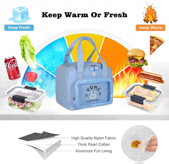 Stylish and portable lunch bag for women/men, can be used in any scene, such as office, outdoor, school, college, beach, etc. Our high quality and durability cute insulated lunch bags are definitely worth giving it as a gift to your relatives and friends. Smooth zipper, high quality, secure zipper closure ensure smooth to open. Wide opening design, make it easier for you to take food. The strong stitched handles makes the hand more comfortable when lifting heavy objects. It's strong and durable, not easy to slip off. High-quality Foil Lining is water and oil resistant. Easily cleaned by wiping with a damp cloth. It solves the problem of oil stains remaining on the lunch bag for a long time. The bag is constructed from durable materials that are designed to withstand daily use. It is easy to clean, allowing you to maintain cleanliness and hygiene by keeping the bag free from spills and food residues. This lunch bag is versatile and can be used for various occasions. Whether you're going to work, school, traveling, or having a picnic, the bag is designed to meet your needs for transporting meals and snacks. It solves the problem of oil stains remaining on the lunch bag for a long time. Features Large Capacity Wide-open Design Durable & Heavy Duty Excellent Thermal Insulation Leakproof & Easy-to-clean. Lunch bag equipped with extra thick waterproof liner, premium eco-friendly oxford fabric and built-in thick foam insulation material. So our insulated lunch bag will keep your food/drinks at the optimal temperature and enables excellent insulation effect up to many hours, so you can always recharge with warm tasty food and cold drinks! If you put the small lunch bag in a backpack, the insulation performance will be better.