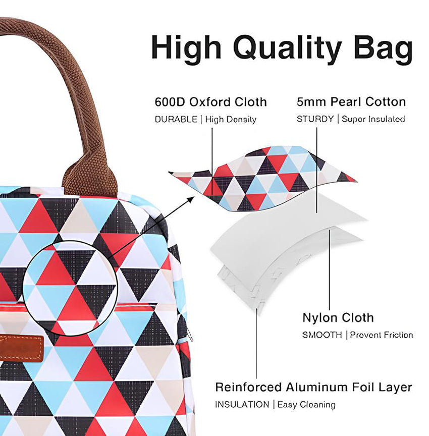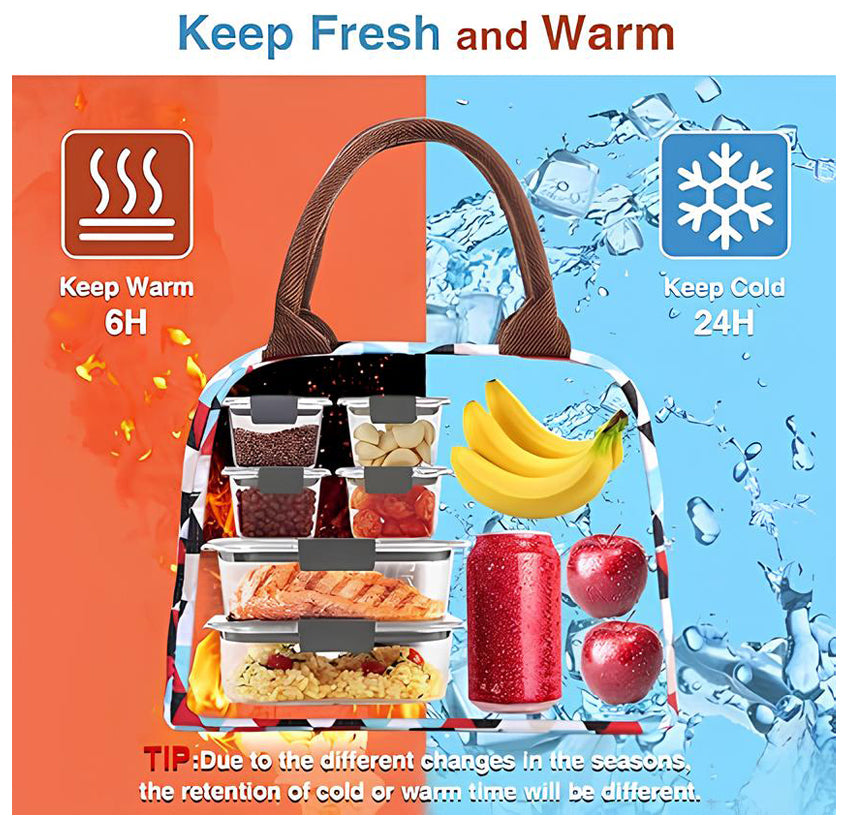 Stylish and portable lunch bag for women/men, can be used in any scene, such as office, outdoor, school, college, beach etc. Our high quality and durability cute insulated lunch bags are definitely worth giving it as a gift to your relatives and friends. Smooth zipper, high quality, secure zipper closure ensure smooth to open. Wide opening design, make it easier for you to take food. The strong stitched handles makes the hand more comfortable when lifting heavy objects. It's strong and durable, not easy to slip off. High-quality Foil Lining is water and oil resistant. Easily cleaned by wiping with a damp cloth. It solves the problem of oil stains remaining on the lunch bag for a long time. The bag is constructed from durable materials that are designed to withstand daily use. It is easy to clean, allowing you to maintain cleanliness and hygiene by keeping the bag free from spills and food residues. This lunch bag is versatile and can be used for various occasions. Whether you're going to work, school, traveling, or having a picnic, the bag is designed to meet your needs for transporting meals and snacks. It solves the problem of oil stains remaining on the lunch bag for a long time. Features Large Capacity Wide-open Design Durable & Heavy Duty Excellent Thermal Insulation Leakproof & Easy-to-clean. Lunch bag equipped with extra thick waterproof liner, premium eco-friendly oxford fabric and built-in thick foam insulation material. So our insulated lunch bag will keep your food/drinks at the optimal temperature and enables excellent insulation effect up to many hours, so you can always recharge with warm tasty food and cold drinks! If you put the small lunch bag in a backpack, the insulation performance will be better.