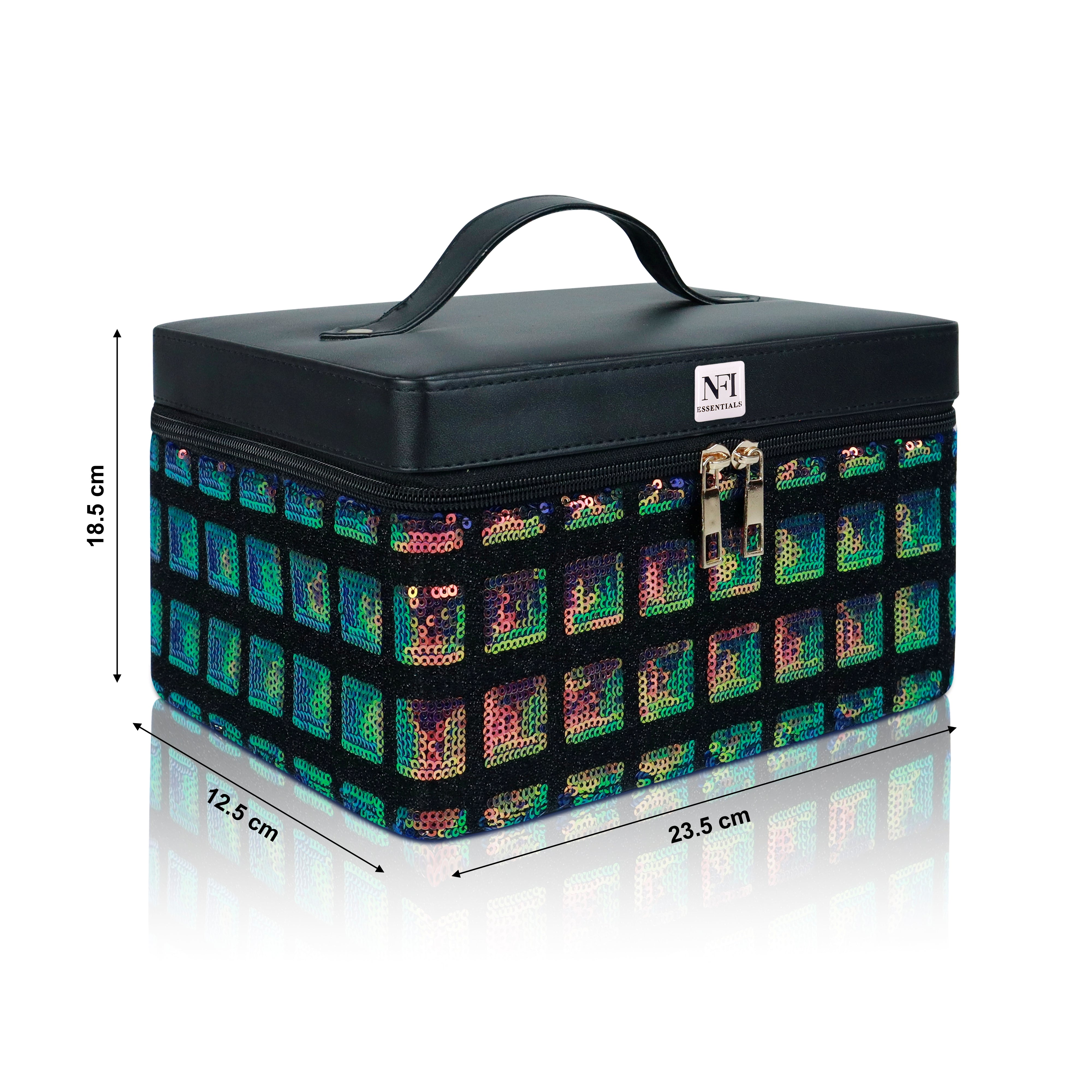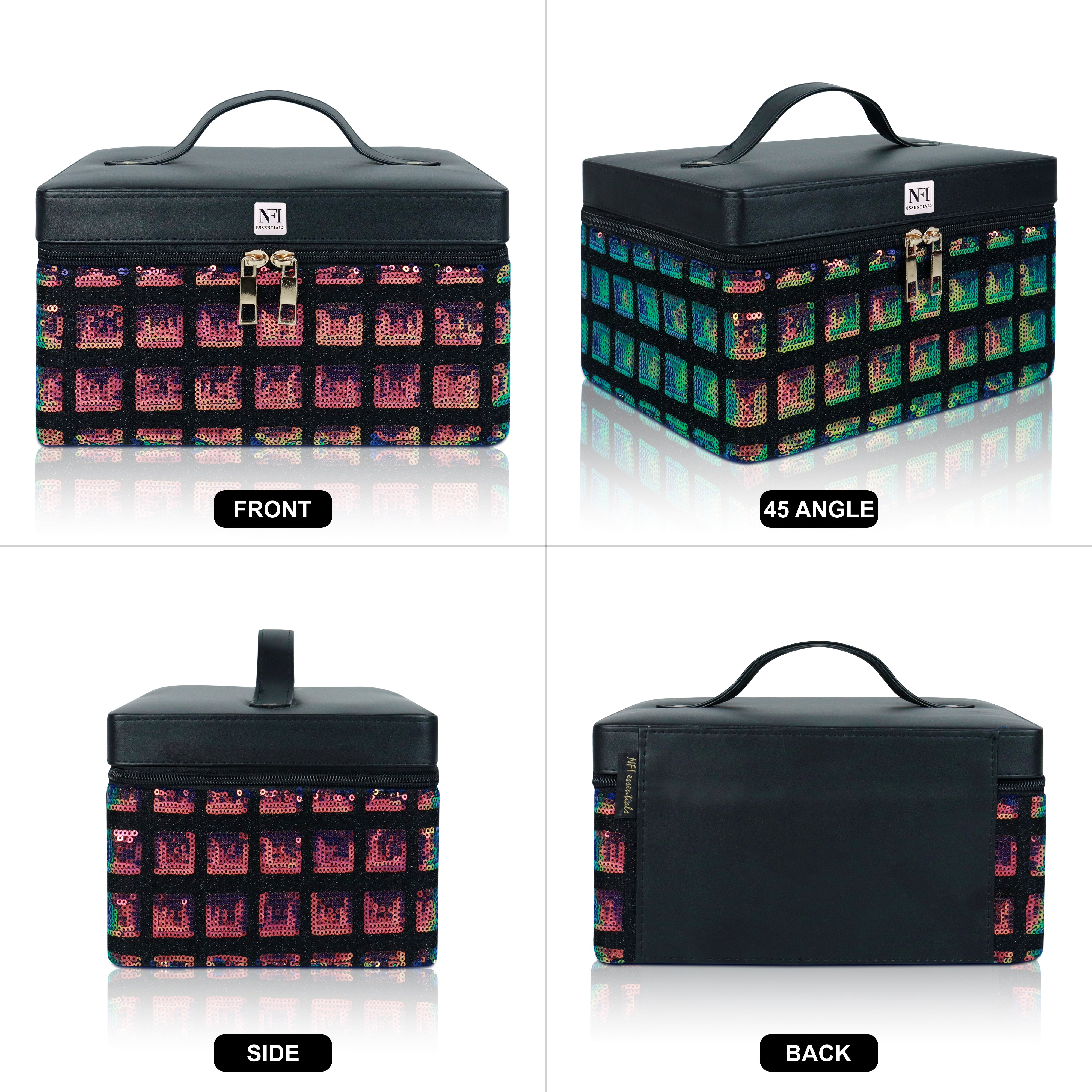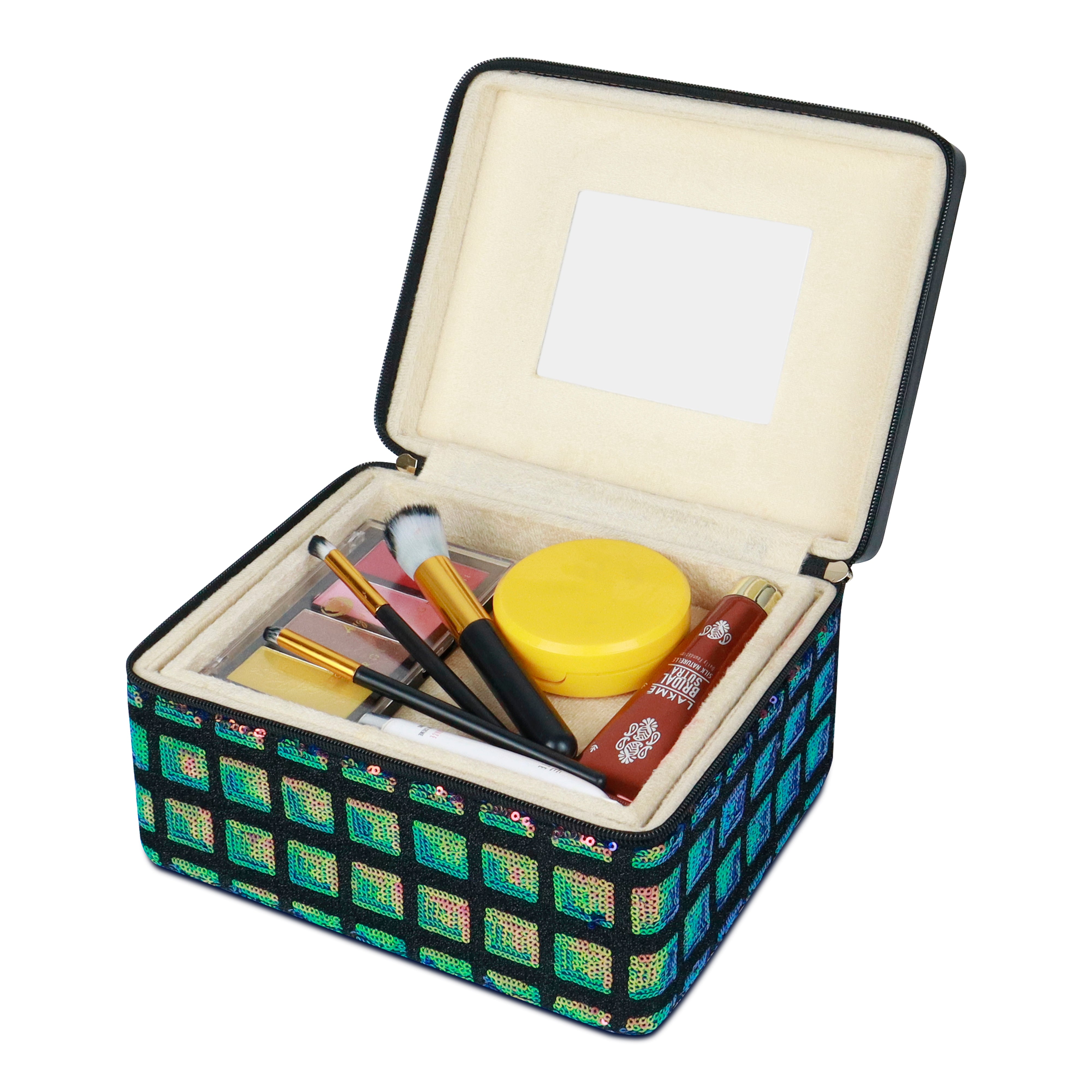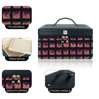 The made of Polyurethane material and Inner Velvet material Lightweight, water resistant durable easy to clean Jewellery Organizer Box, Extra-large Makeup Organizer Box elegant and stylish Double-layer deign, 1 Mirror for easily makeup. This makeup bag can not only store beauty essentials such as foundation, nail polish, eye shadow, lipsticks, mascaras, eyeliner, powder, concealer, essential oil, etc. storing all your cosmetic. great professional makeup case, perfect for makeup artist or beginner. Portable Design With a Hand Strap, You can keep your makeup tools is neat and tidy. Special design, you can adjust as needed. You Can Take It Anytime and Anywhere, a Perfect Accessory For Your travel. Great Gifts for Valentine's Day, Mother's Day, Birthdays, Wedding, Anniversary, Diwali, Christmasor Just Share Them With Your Family And Friends. You Can Also Take It With You Whenever You Travel, Which Will Bring You More Convenience.