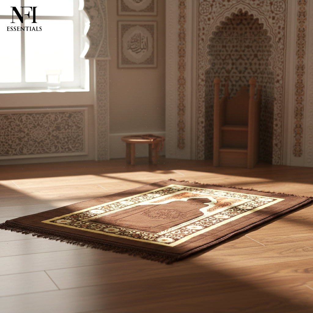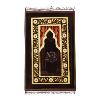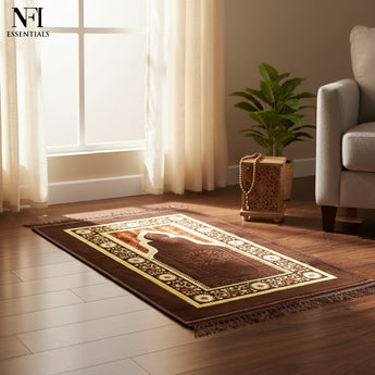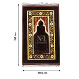 Experience the perfect blend of tradition, comfort, and elegance with this beautifully crafted Islamic prayer mat. Designed with both spirituality and practicality in mind, this prayer rug offers a peaceful and comfortable surface for your daily salah, helping you stay focused and grounded during every moment of prayer. Made from soft, high-quality materials, this mat offers a luxurious texture that feels gentle on your skin and provides extra support to your knees, feet, and forehead. Whether you're praying at home, in the mosque, or while traveling, the plush fabric adds an element of physical comfort to your spiritual practice, making it ideal for both adults and youth. The design features a traditional mihrab (arch) motif, intricately bordered with elegant patterns inspired by Islamic art and architecture. This timeless design not only enhances the visual appeal of the mat but also helps create a spiritually focused environment, promoting deeper reflection and connection during prayer. Built to last, the prayer mat features finely stitched edges and a non-slip base to keep it stable on different surfaces, including hardwood, tile, or carpet. Its durable construction ensures that it maintains its beauty and functionality even with daily use, making it a reliable companion for your long-term worship. Perfectly sized to provide ample space for comfortable movement during each stage of prayer, the mat remains easy to fold and carry, making it an excellent option for travel, work, or school. It’s a wonderful gift for special occasions such as Ramadan, Eid, Hajj, Umrah, or as a heartfelt gesture for someone beginning their spiritual journey. Whether for personal use or as a gift, this prayer mat serves as a meaningful addition to any Muslim household — blending faith, tradition, and quality craftsmanship into one essential piece.