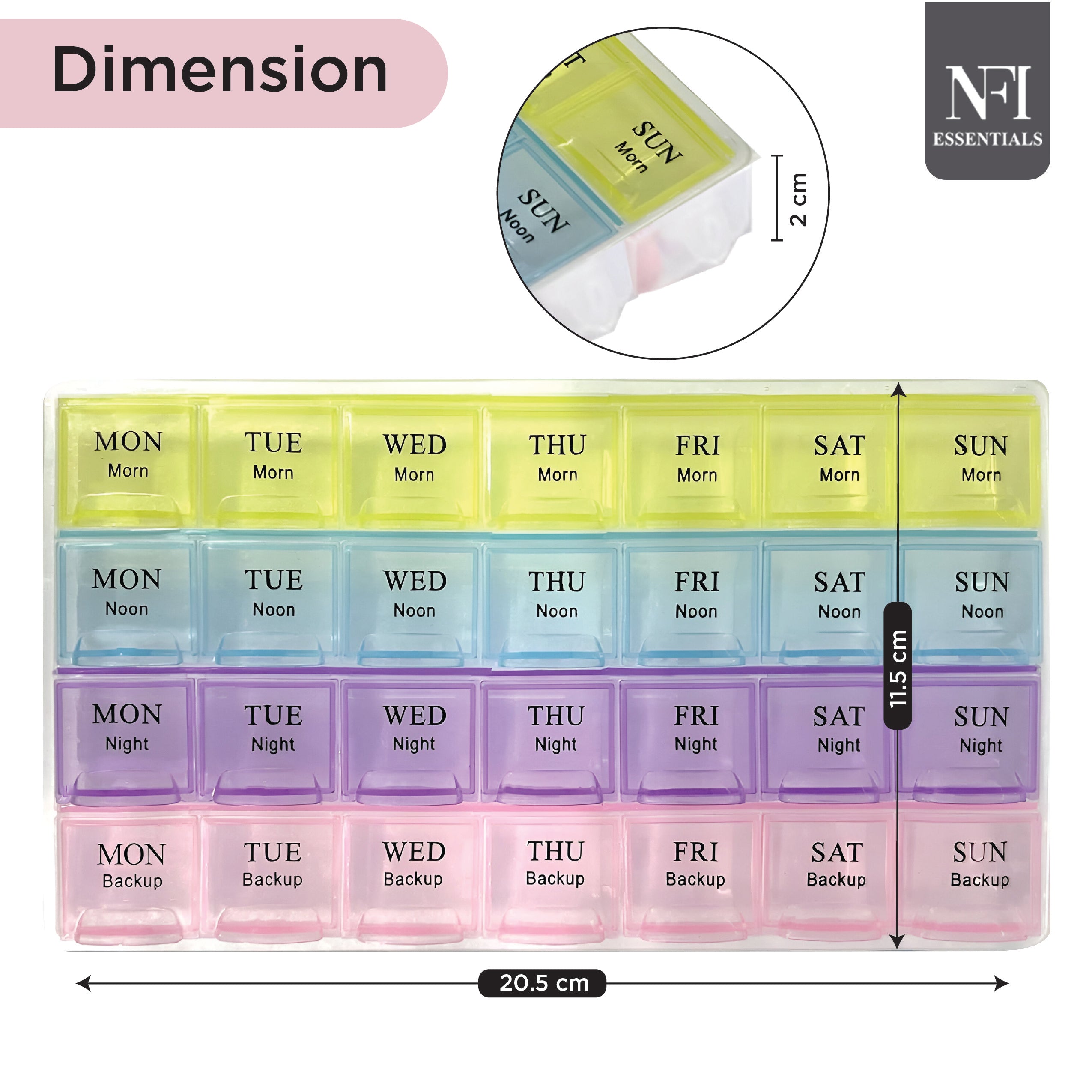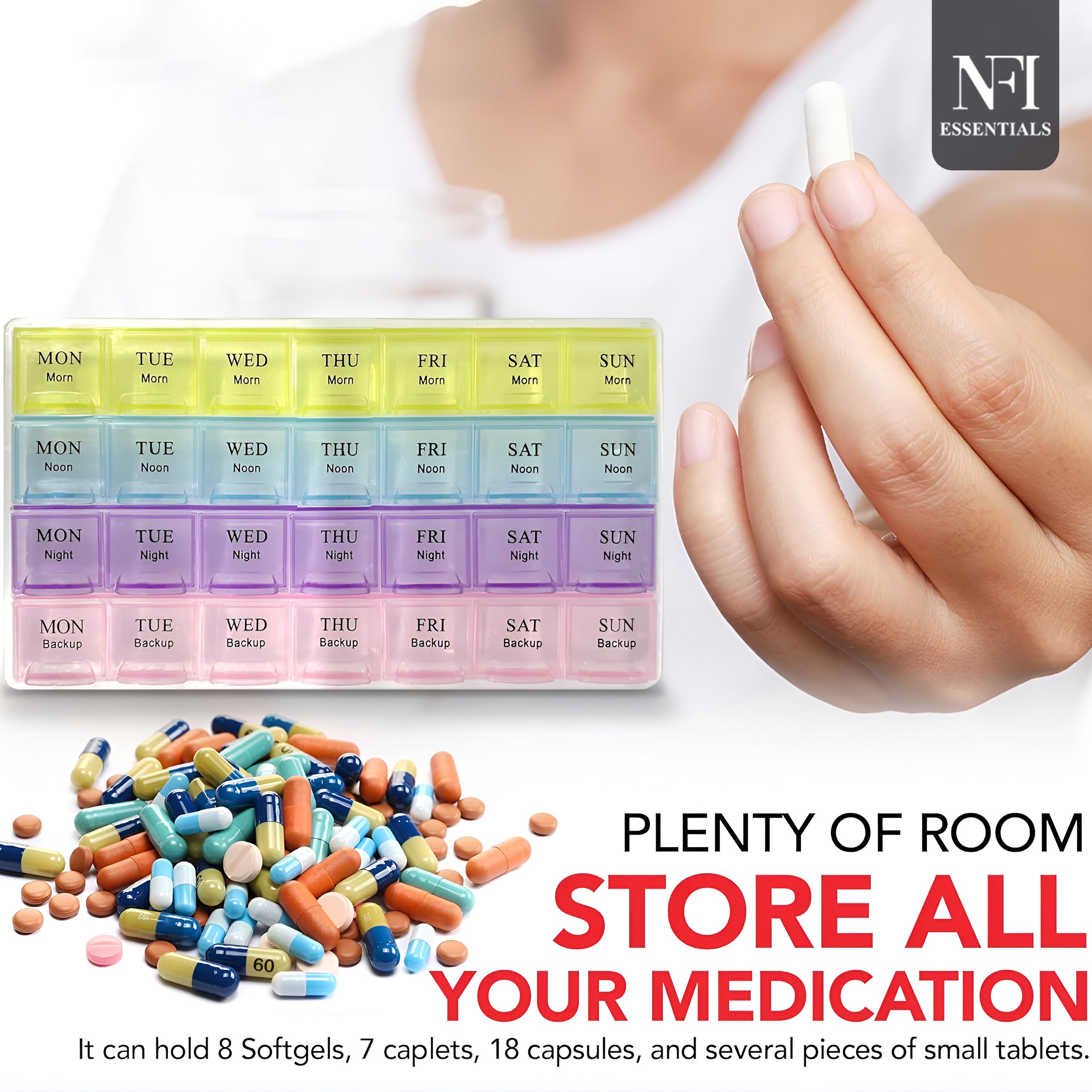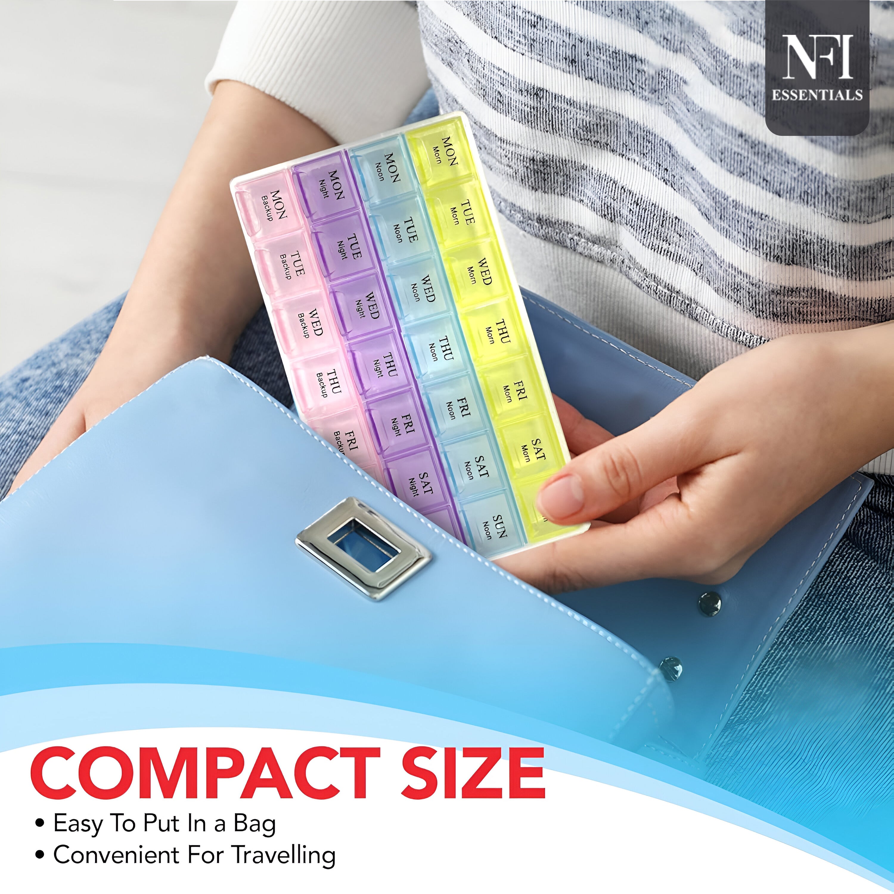 NFI essentials Pill Box Weekly 7 Days 4 Times Storage 28 Compartments, Durable Medicine organizer box, Portable Travel Pill Box for Home with Compartments Moisture-Proof Pill case