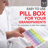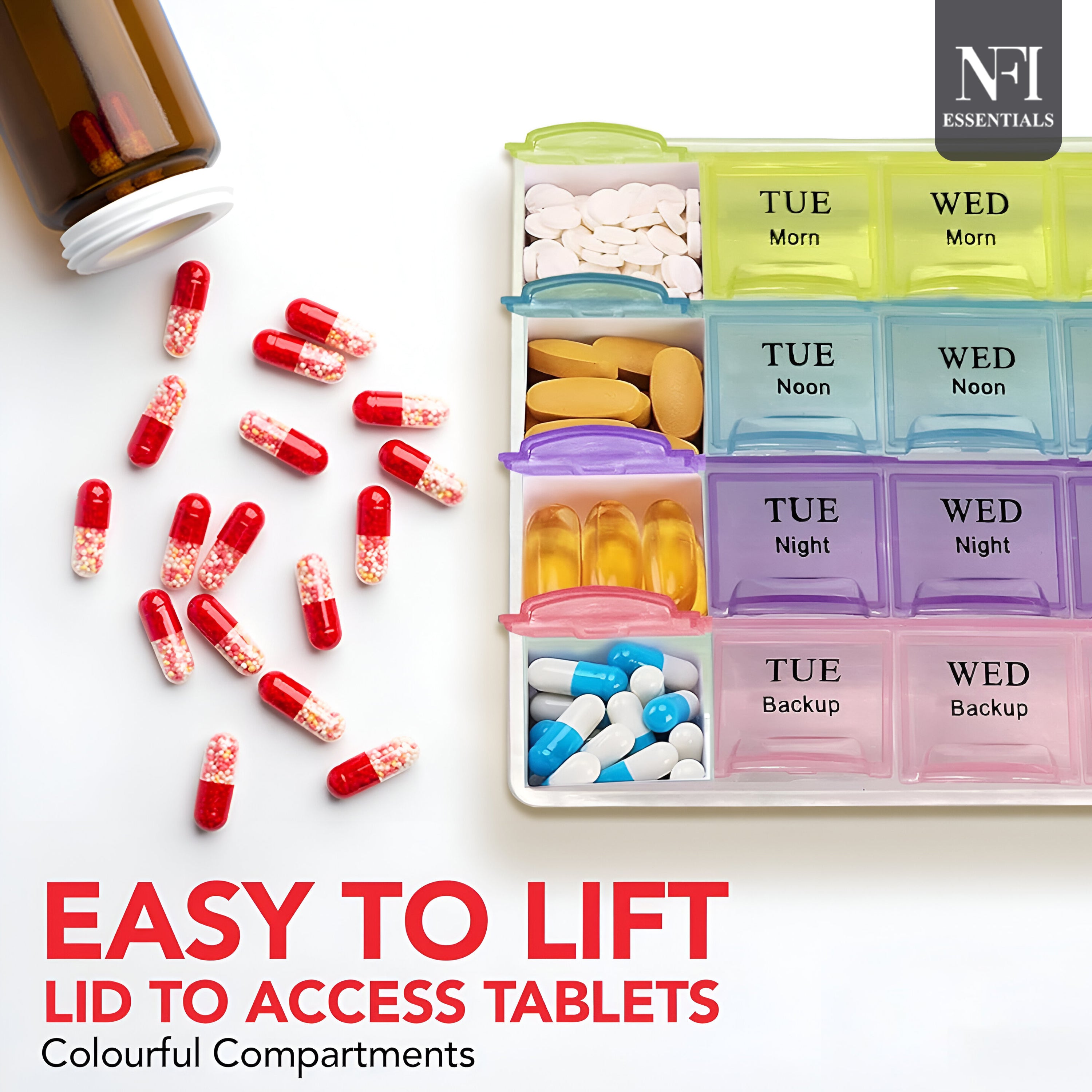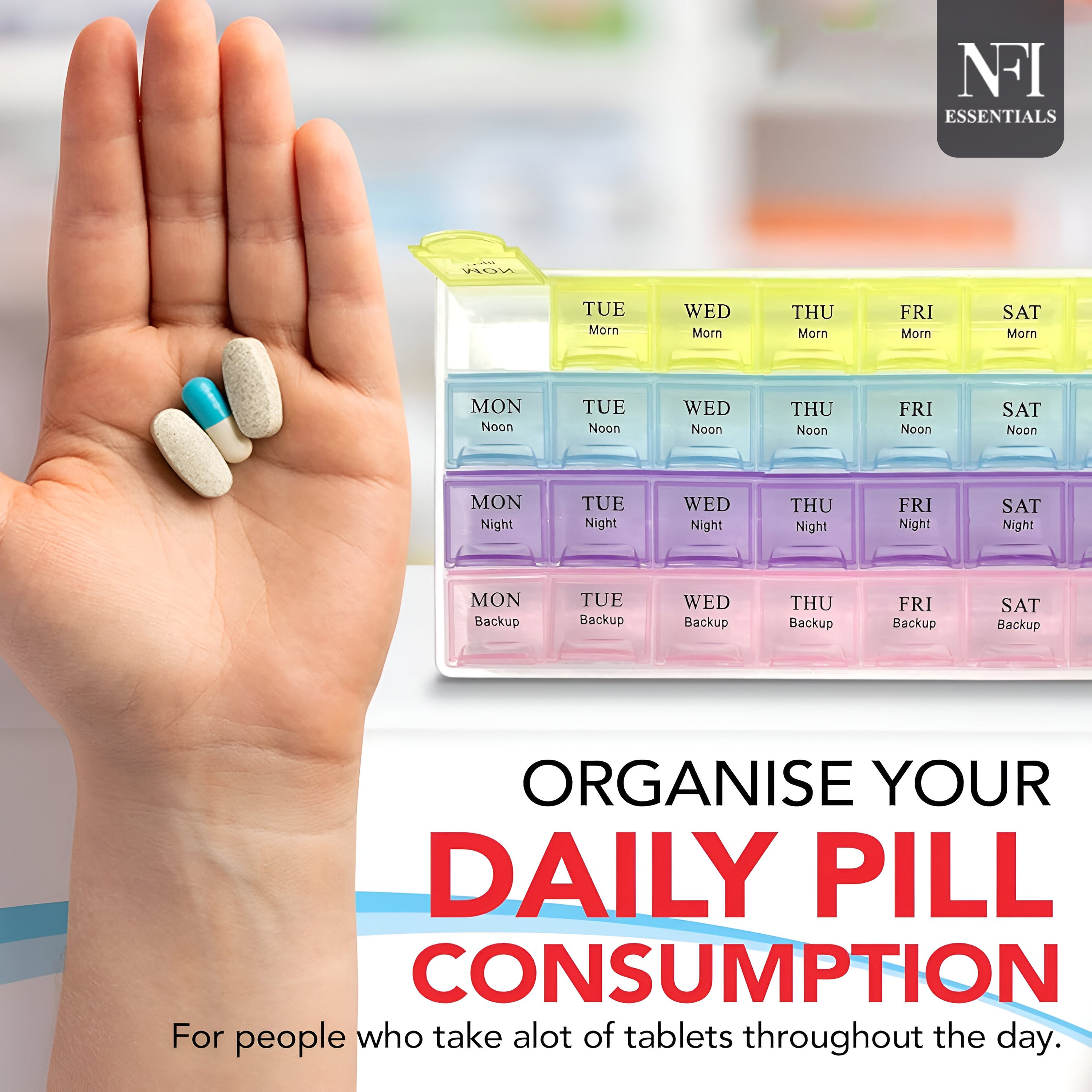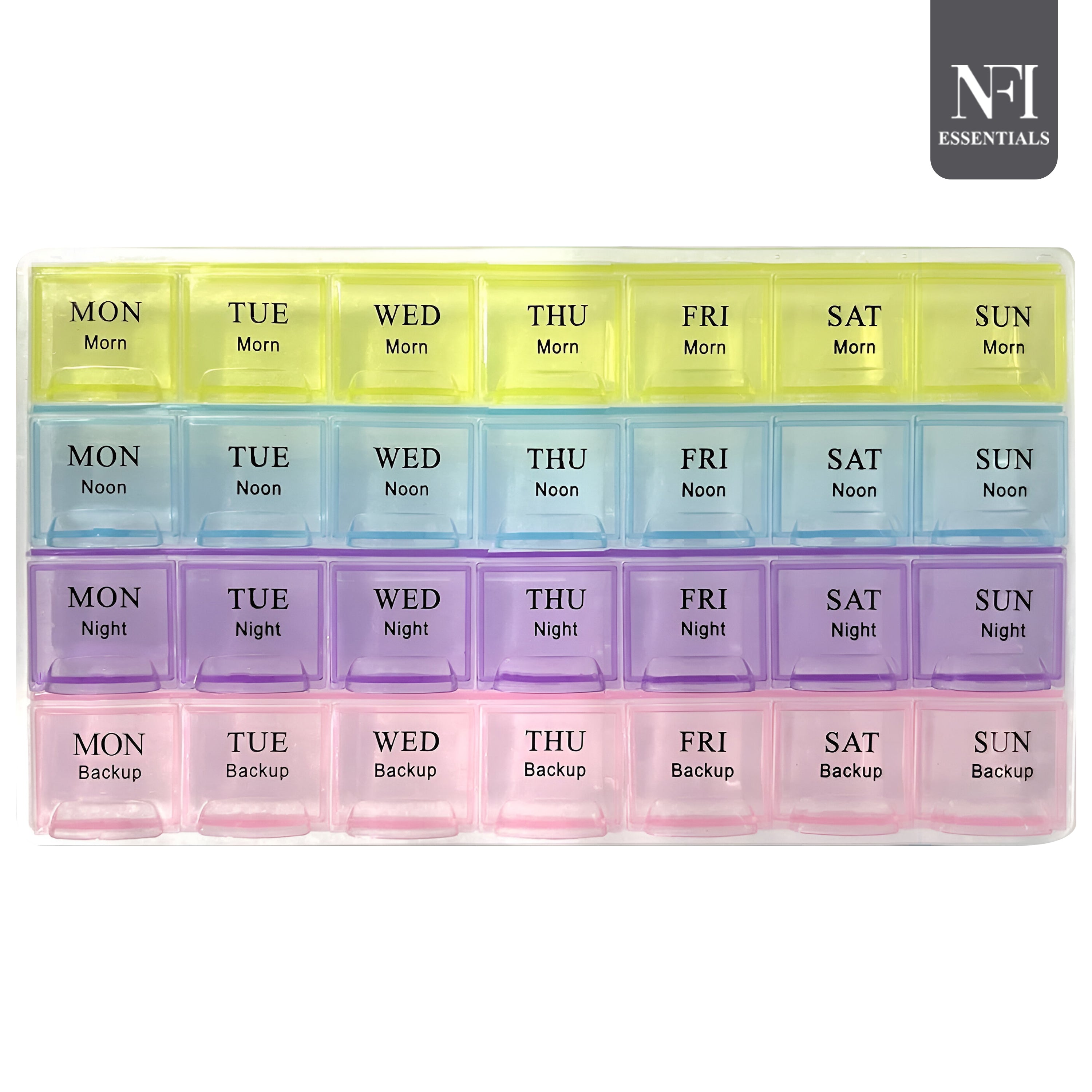 NFI essentials Pill Box Weekly 7 Days 4 Times Storage 28 Compartments, Durable Medicine organizer box, Portable Travel Pill Box for Home with Compartments Moisture-Proof Pill case