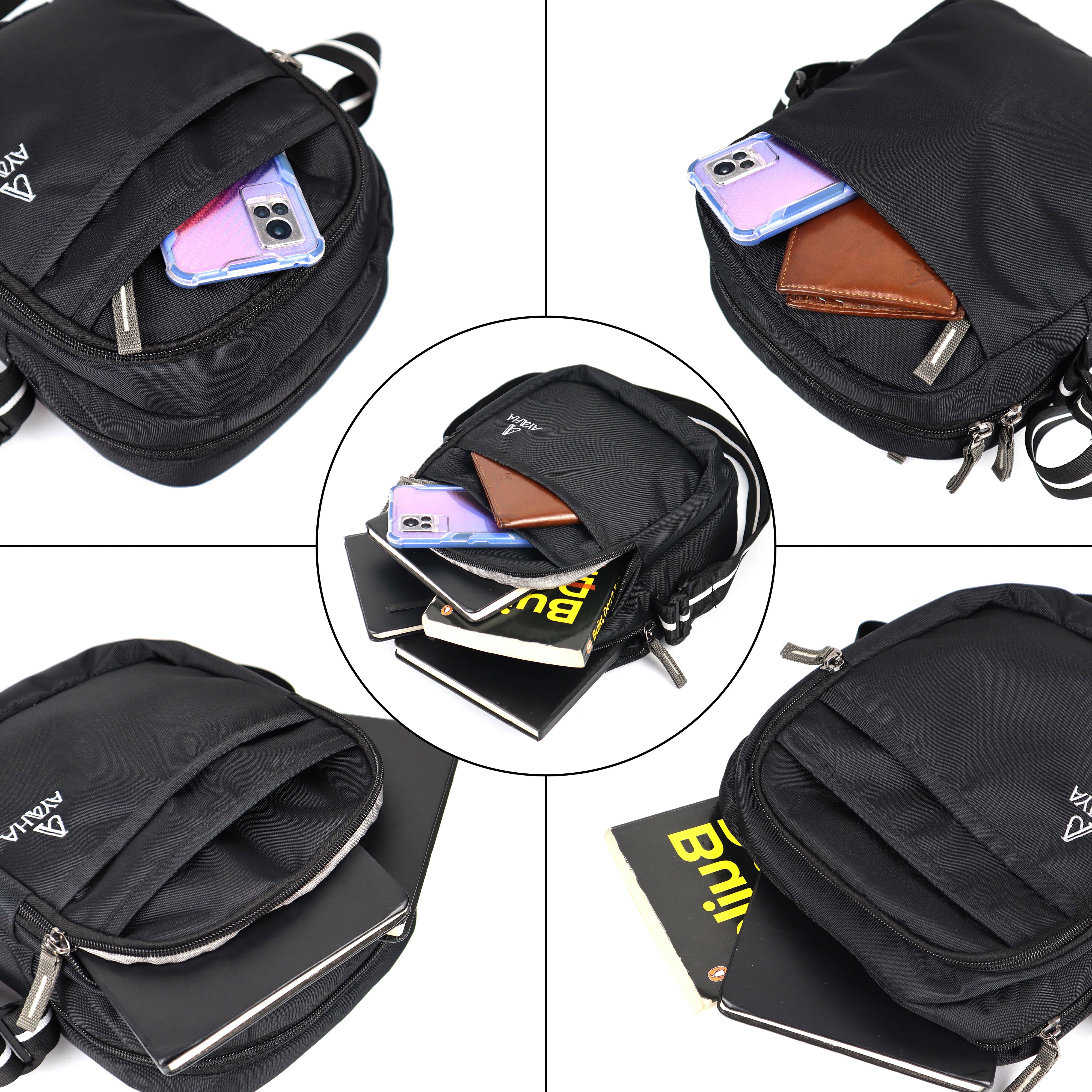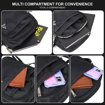 Made of Polyester Material, Use this Sling bag as a one side bag, messenger Sling bag, shoulder Sling bag, suitable for your office, college, outdoor travels, meeting, and business for everyday use. Total 5 Compartment ( 2 Main Compartment + 1 Front side pocket with zipper + 1 Back Side Pocket with zipper + 1 Pocket without zipper ). Shoulder Strap To Fit Our Body, And Make Our Trip Or Daily Using More Comfortable. premium quality stitching and grade zippers, this sling ensures long lasting durability & strength. Best for carrying valuables like cards, keys, earphones, power bank, coins, pen, Money, Passport, card holders etc. With an adjustable shoulder strap this messenger bag is perfect for college students, school, basic traveling, and everyday use. The strap is not removable and provides comfortable carrying, making it suitable for adults. It also makes for a great gift for friends and family.