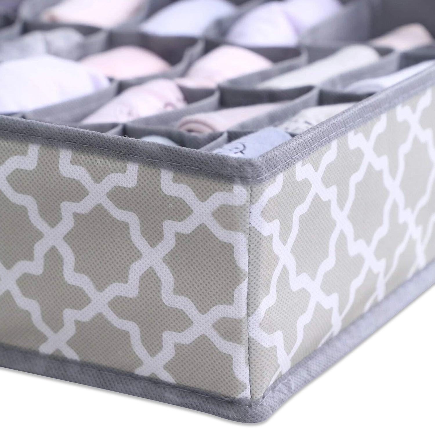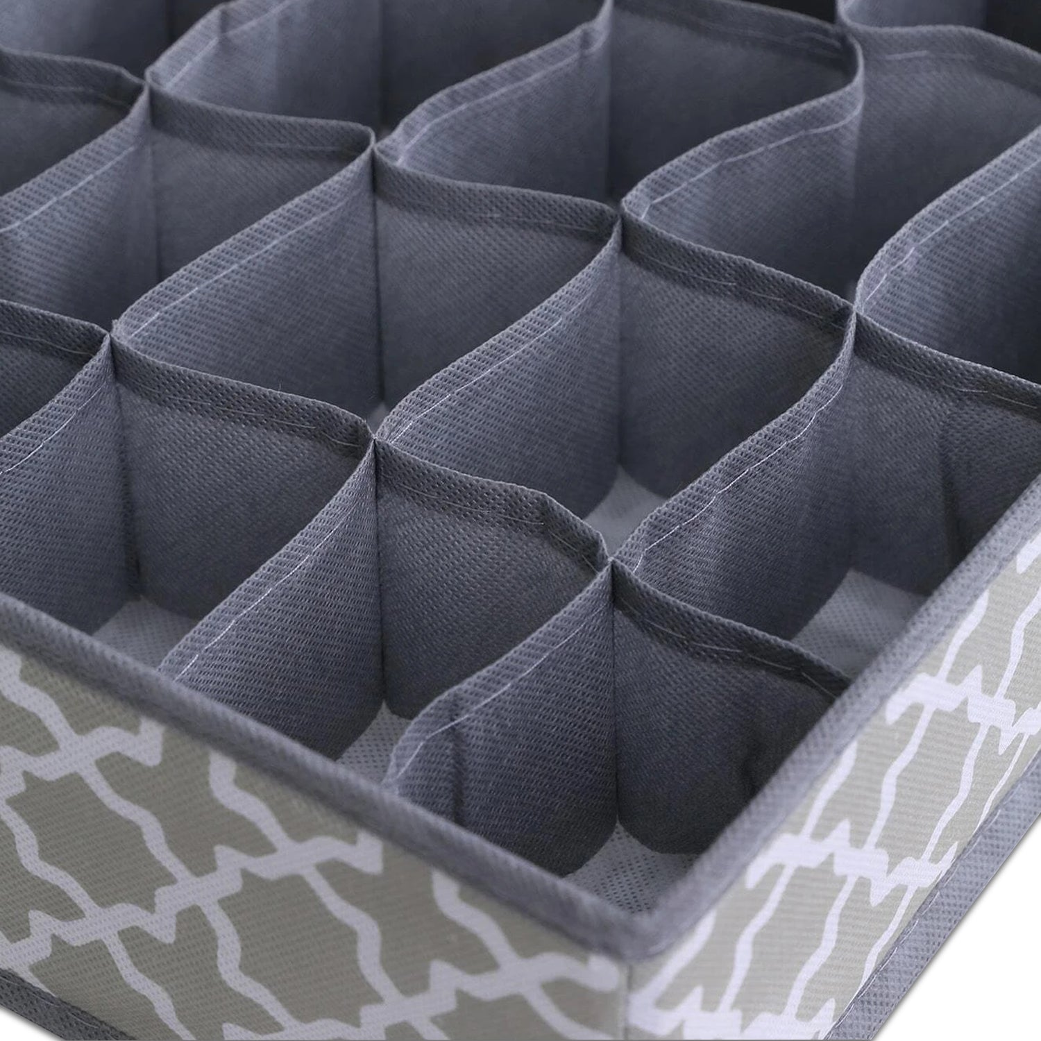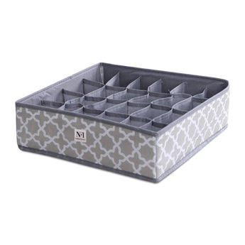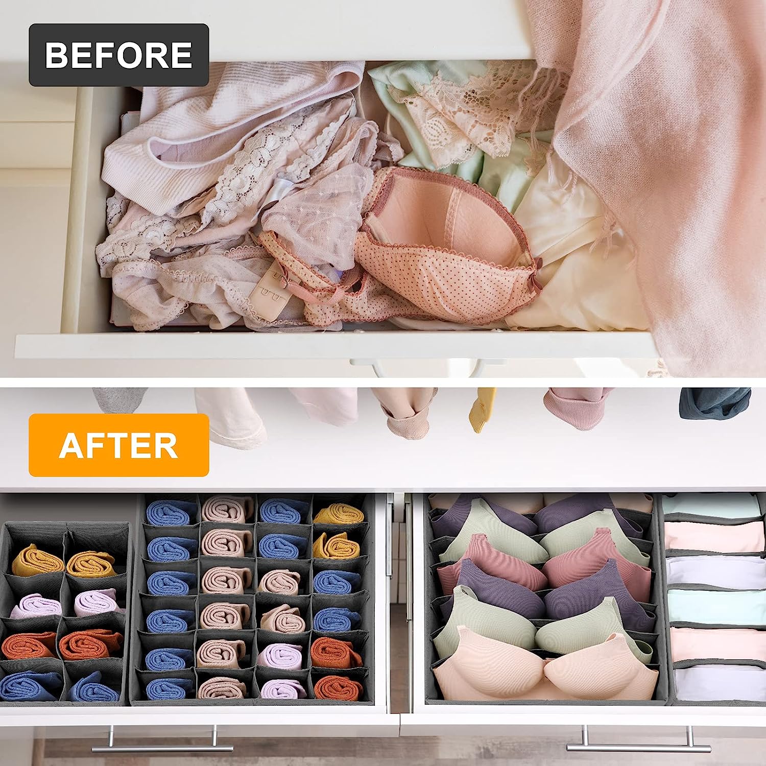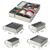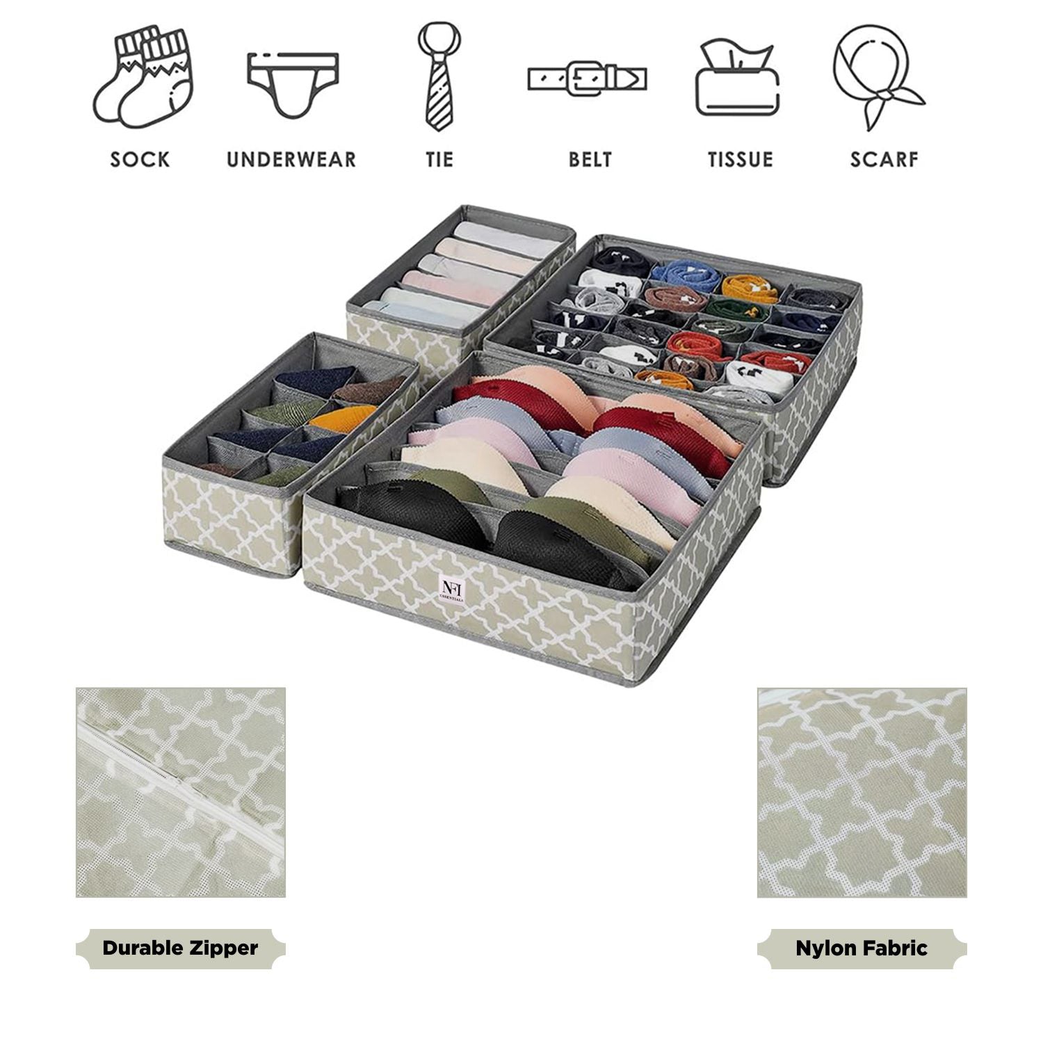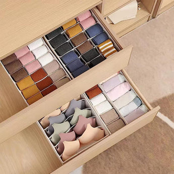 "High-quality non-woven nylon fabric used in a long-lasting product that will keep your drawers organised at all times. the storage organizers resists to dust, moisture and tear than non-woven cloth. And the high-density PP insert boards is sturdy and resists to bend, deform or crack. The mesh pocket squares are breathable and help the air circulation. Drawer organisation aids in home organisation by establishing a productive and well-organized storage system. Smooth Zippers & Foldable that are resistant to harm are seen on organisers. Additionally, they are simple to fold or unfold for usage or storage. can be applied to several articles of clothes, pants and personal goods. Sort socks, ties, bras, and undergarments into categories. 8-compartment underwear organizer, 6-compartment Tie, shirts and scarf, 7-compartment bra organizer, 24-compartment sock organizer. the ideal home storage solution that also helps you save time and effort when looking for your clothing. a great choice for gifts on a variety of occasions.