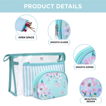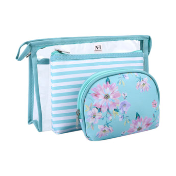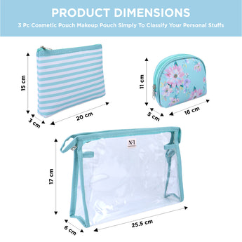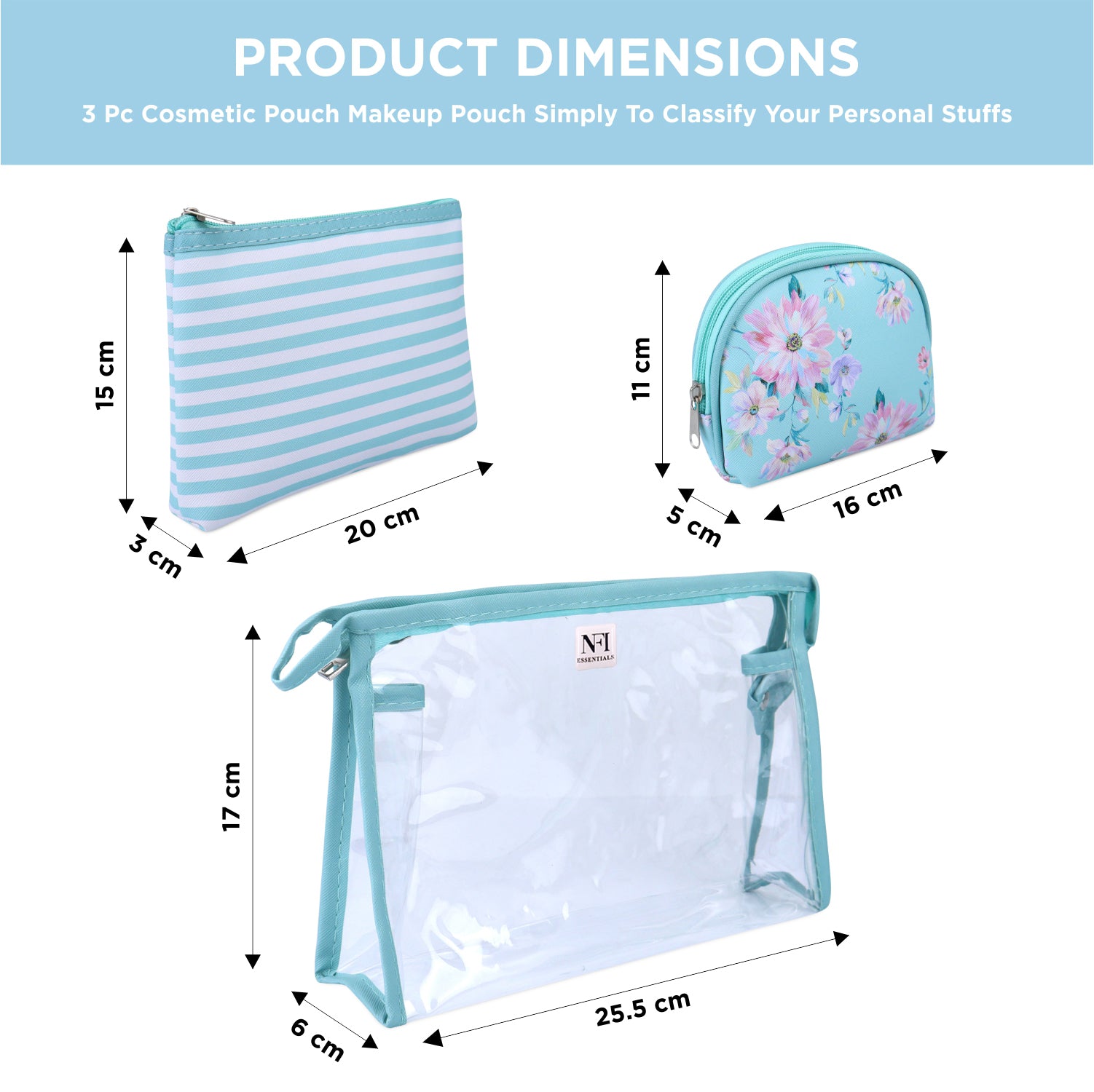 Dimension :- Large: 26 x 17 x 6.5 cm, Medium: 20 x 14 x 4 cm, Small: 15.5 x 11 x 6 cm. Add a colorful touch to your vanity or carry on with these beautiful patterned makeup pouch that will house your beauty essentials. <br> Your accessories and makeup will stay clean and organized in these waterproof, easy to clean PU lined bags.<br> This set includes 3 sizes that will accommodate all your beauty products at home or on the go! Once you have them you will find so many convenient ways to fill them up. <br> Give this set as a gift to someone special in your life and they will love organizing their cosmetics and toiletries in these pretty pouch! For best results, spot clean these pouch with a wipe. <br> Stay organized and avoid searching for what you need in your purse, bag or suitcase with a set of these beautifull designed bag.