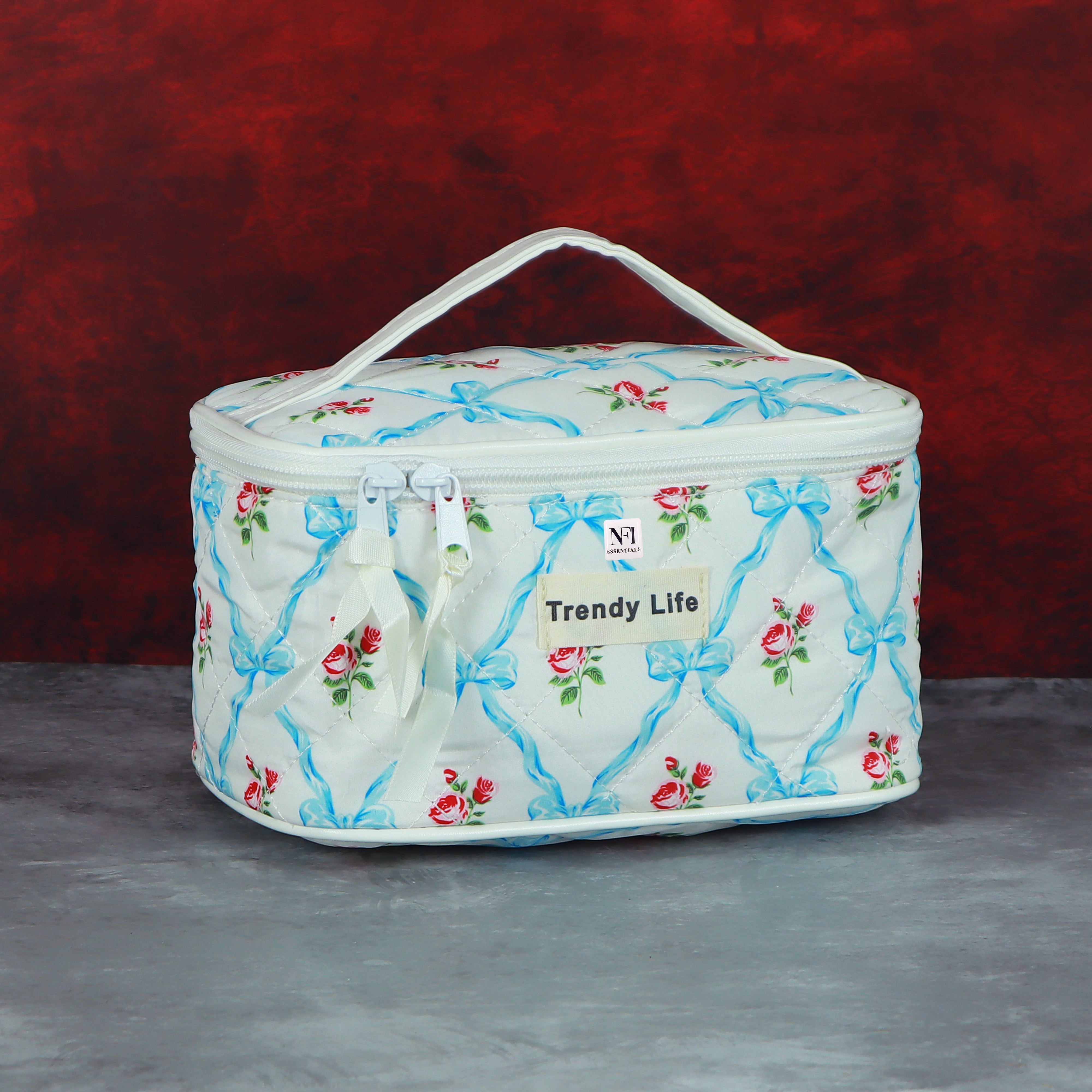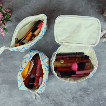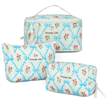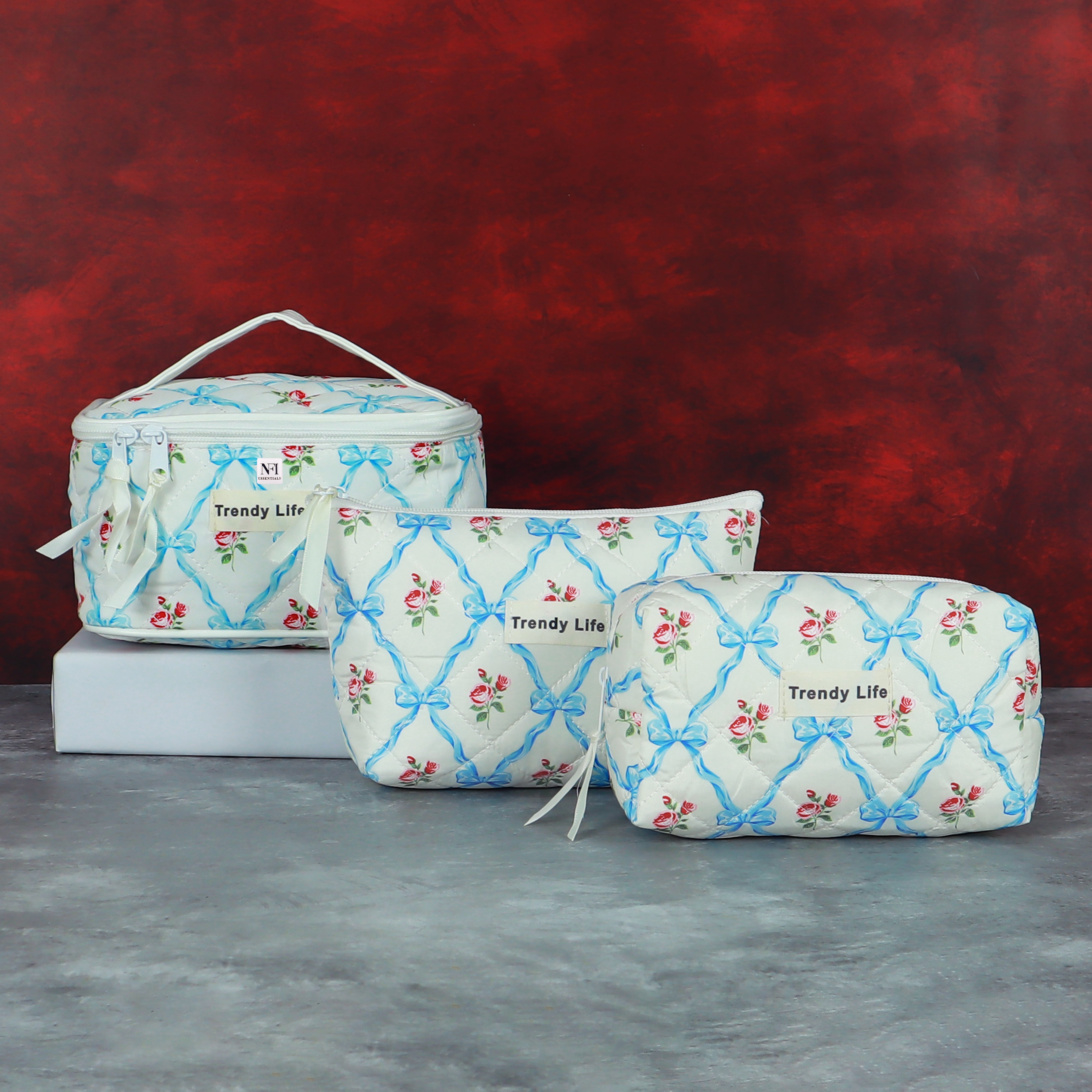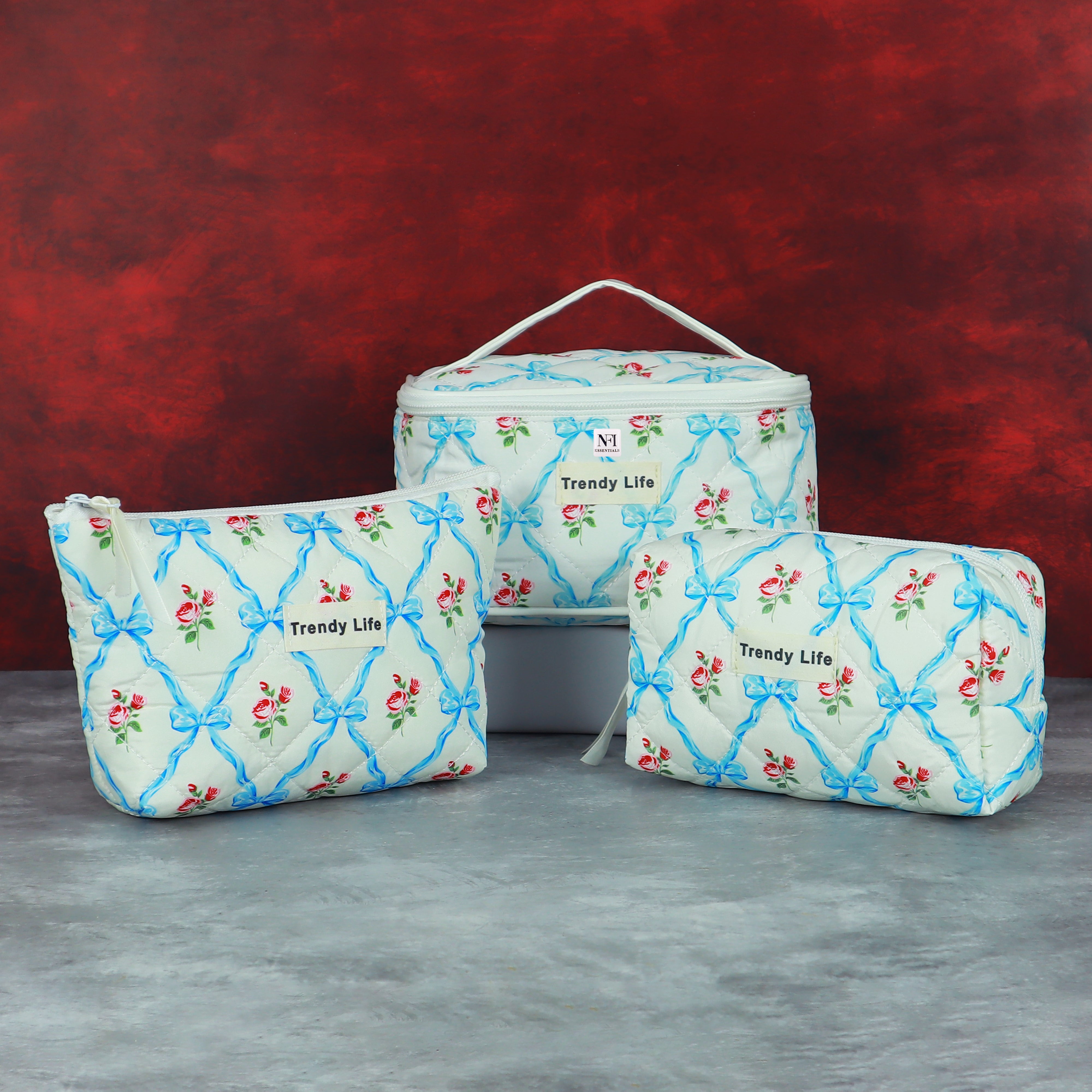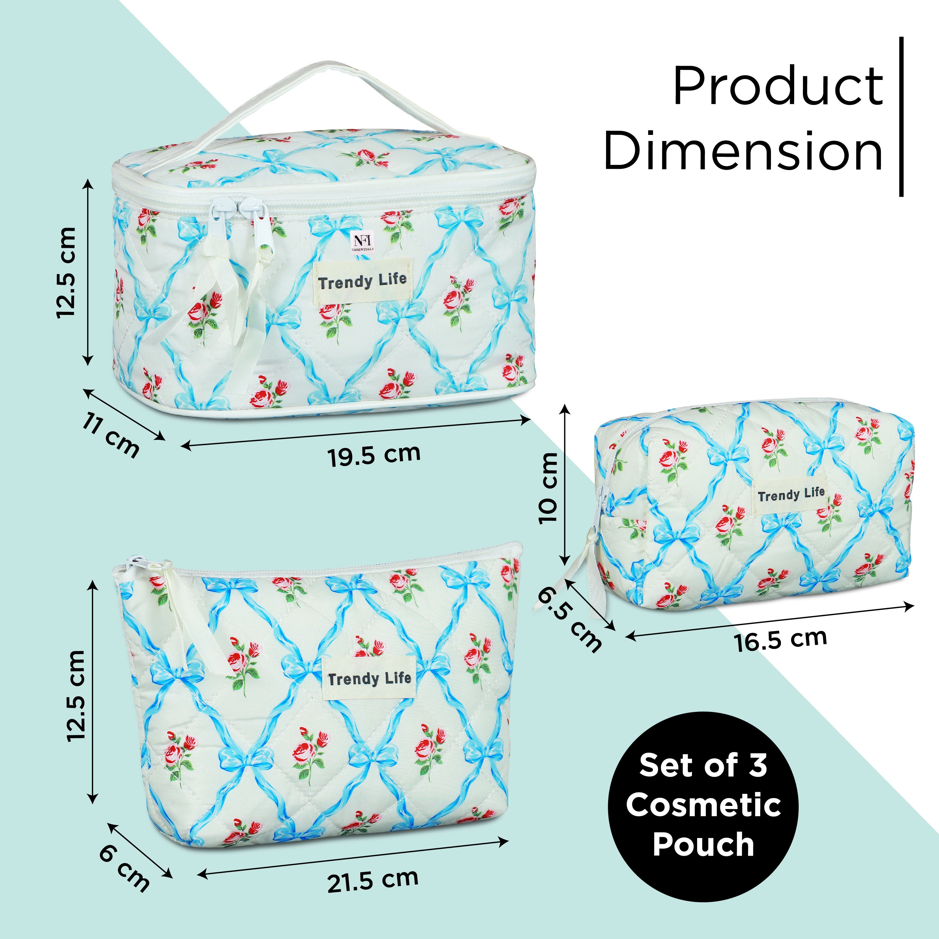 NFI essentials 3 Pcs. Cotton Quilted Makeup Bag for Women, Portable Cosmetic Pouch Set for Girls Travel Toiletry Organizer Bag, Accessories Storage Zipper Bag
