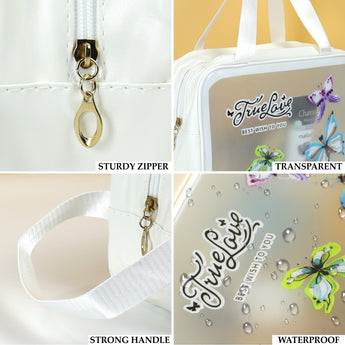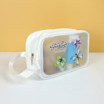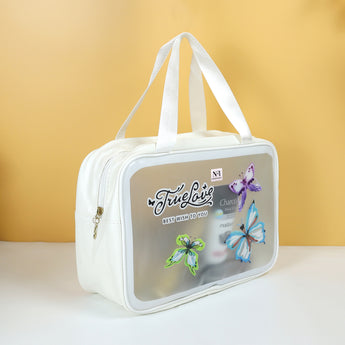 This beautiful looking PU Butterfly Printed Makeup Pouch for Women, Cosmetic Pouch It is easy to fix and access your accessories. This Multifunctional Cosmetic Bag not only can storage your cosmetics, but also Jewellery, Shaving Kit, Valuable objects and so on. It has smooth zipper and precise stitching. Classic and bright color make the toiletry bag very trendy & beautiful which adds shining stars to your personality. This portable travel toiletry bag to carry your toiletries or cosmetics on the go, and protect your items from moisture or sand. Our transparent toiletry bag is designed with 1 zipper, which can be opened and closed smoothly and conveniently. Nylon zipper with fine workmanship better protects internal items from water and dust. You can use one at the beach and it will keep all your items clean and dry. The color is a beautiful pink. The travel wash bag material is very soft and can be easily folded up for storage when not in use, wash bag women. When used, the handle strap makes things more convenient. You may carry it with you or hang it wherever you need it, such on a towel rack or shower rod. When used, the handle strap makes things more convenient.