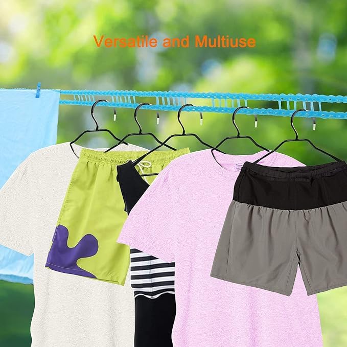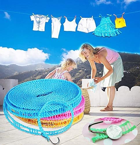Multiple uses: ideal for airing, camping, hanging, and binding; lightweight, non-slip, windproof cloth line. FIXED HANGER: Unfazed by the intense wind. LENGTH: There is one nylon clothes line in the package. 10 meters. Unexpected Colors Anti-slip and windproof features Stops Blowing and Falling Off of Clothes. Two hooks to secure to trees, bars, or rods when traveling or camping. DURABILITY: Made of sturdy nylon that can withstand the weight of hangers and clothing, this item is foldable and portable and has an adjustable length to save you from having to twist and knot things.
