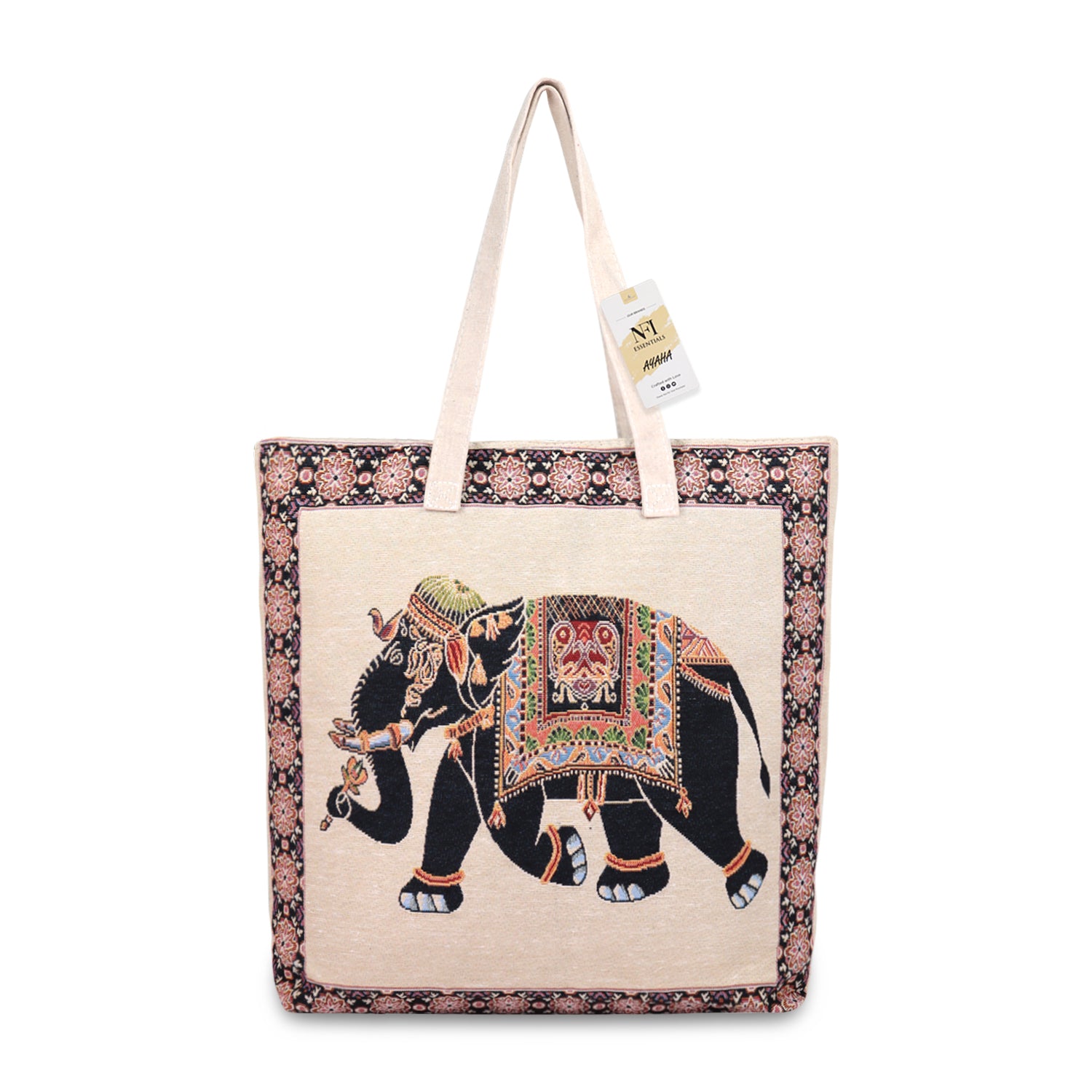 NFI essentials Canvas Elephant Printed Shopping Bag, Foldable Shopping Handbag