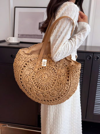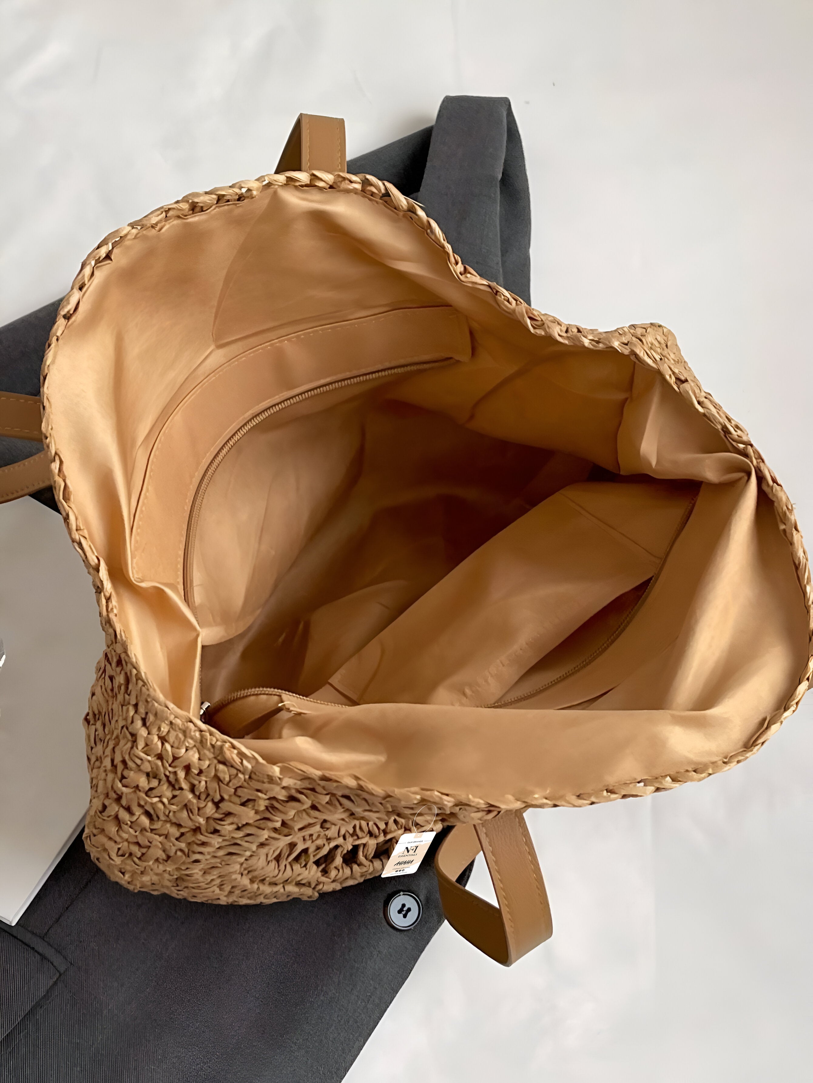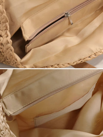 Please note: This bag is crafted from delicate straw and woven fabric — to preserve its shape and quality, keep away from water and store in a dry place.