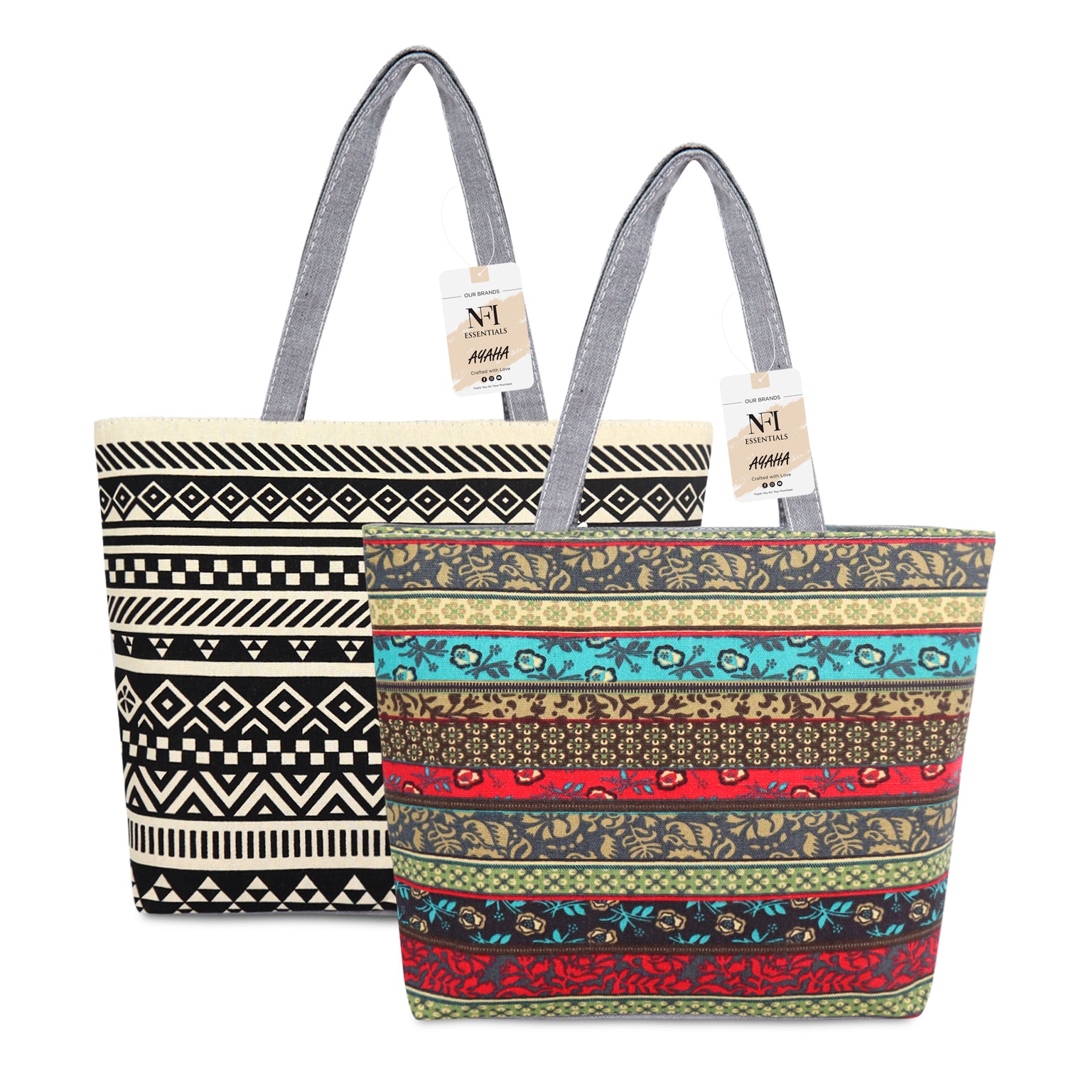 NFI essentials Canvas Printed Pack of 2 Tote Bag for Women with Zipper, Casual Handbag Shopping, Tote Grocery Portable Bag Eco-friendly Hobo Bag