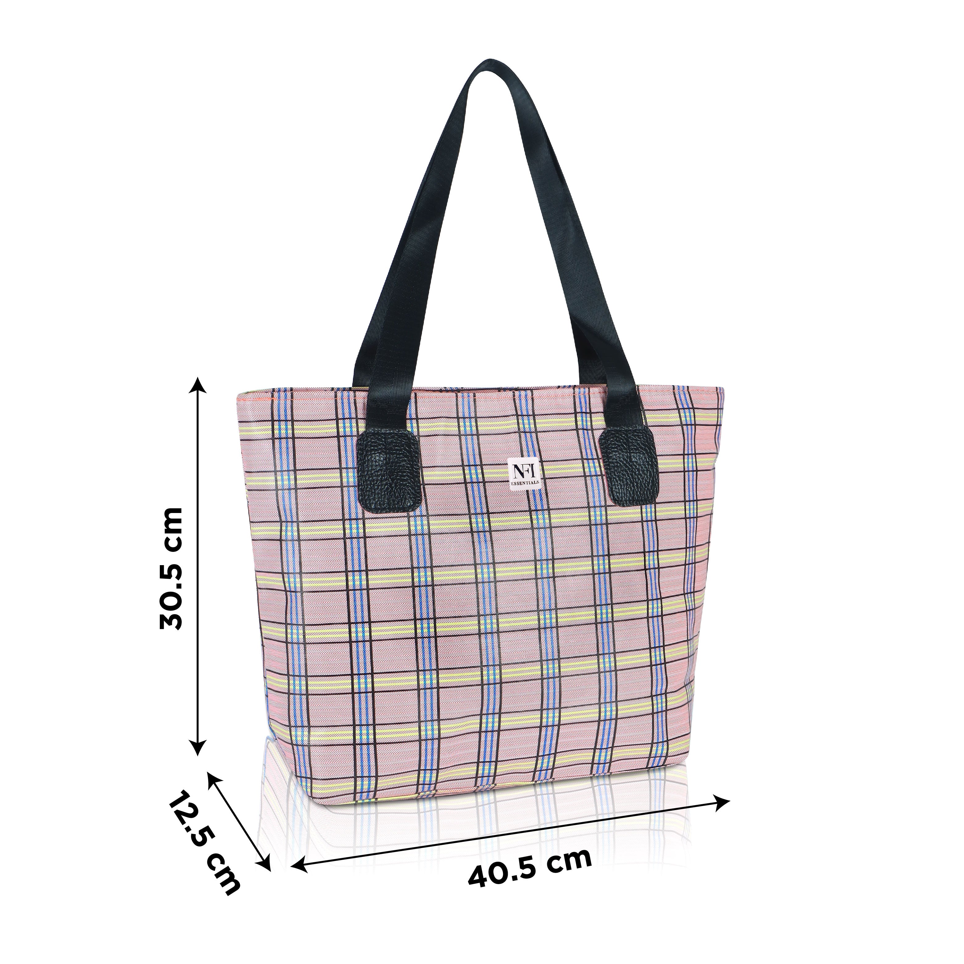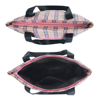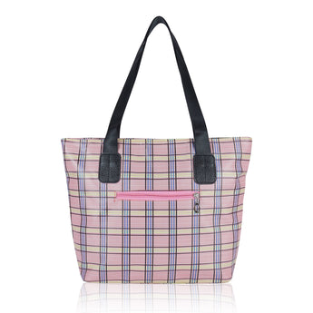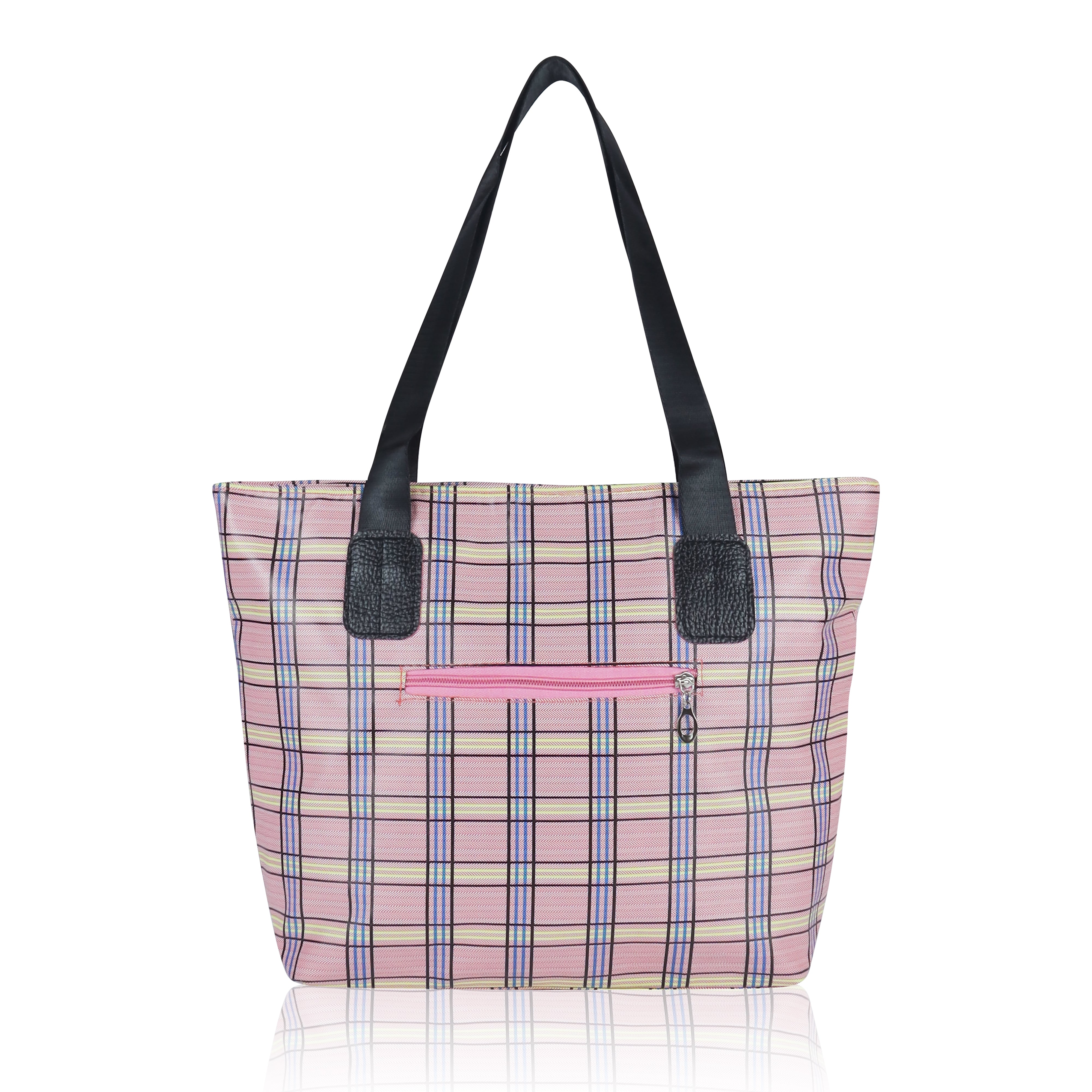 Add a splash of style and practicality to your everyday routine with this charming plaid tote bag, designed for women who value both fashion and functionality. Featuring a beautiful pastel pink checkered pattern with subtle tones of yellow, blue, and black, this bag effortlessly combines classic elegance with a modern twist. Crafted from durable, lightweight, and water-resistant fabric, it’s perfect for daily use whether you’re heading to work, school, the market, or a casual outing. The spacious main compartment offers ample room for your essentials – including books, a tablet, cosmetics, lunch, and more – while the convenient front zipper pocket provides easy access to smaller items like keys, phone, or wallet. The tote is reinforced with sturdy black faux leather shoulder straps and matching trim, ensuring comfortable wear and long-lasting performance. Its soft structure and lightweight feel make it ideal for all-day use without putting strain on your shoulders. Whether you're using it as a shopper tote, beach bag, casual handbag, or carry-on, this versatile bag is a perfect companion for both everyday use and travel. With its stylish plaid design and functional layout, this tote bag makes a thoughtful gift for students, teachers, moms, or anyone looking to add a little flair to their daily carry. Functional, fashionable, and full of personality, this tote bag is ready to keep up with your busy lifestyle while turning heads wherever you go.