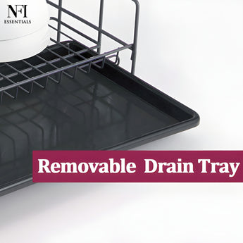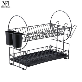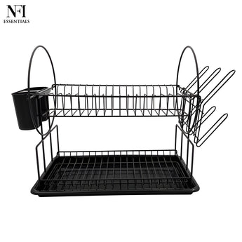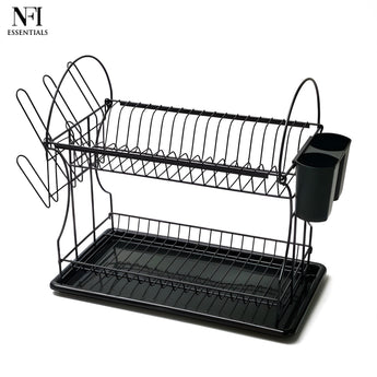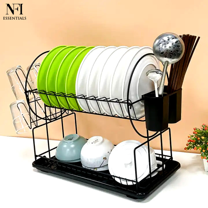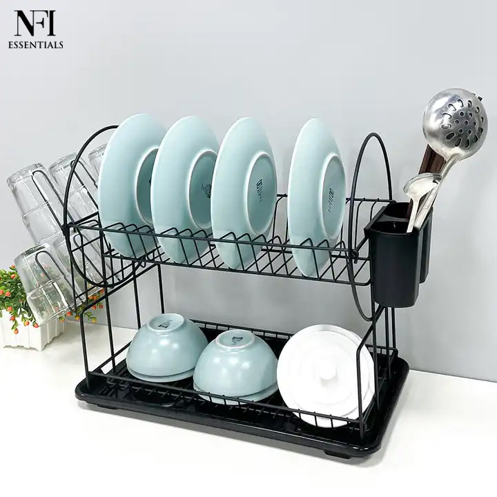 Transform your kitchen into a clean, organized, and efficient space with this beautifully designed 2-Tier Dish Drying Rack with Utensil Holder and Drip Tray. Whether you’re cooking for one or managing a busy family kitchen, this dish rack is built to handle your daily needs while keeping your countertops dry and clutter-free. With its modern black finish and practical multi-tier layout, it’s the perfect blend of form and function—designed for today’s kitchens. Unlike traditional single-level racks, this premium 2-tier dish drying rack maximizes vertical space, giving you double the capacity without taking up extra room on your counter. The upper rack is ideal for neatly organizing plates, dishes, and lids, while the spacious lower rack holds bowls, pots, pans, glasses, or storage containers. No more stacking dishes precariously or drying them on towels. Built from heavy-duty, rust-resistant steel, this rack is made to last. Its black-coated finish protects against moisture, corrosion, and scratches, ensuring it maintains its elegant appearance even with daily use. Whether you're washing a full sink of dishes or just a few items, this dish rack remains sturdy and balanced, with no wobbling or tipping. Convenience is at the heart of the design. The included removable utensil holder allows you to easily store forks, knives, spoons, or kitchen tools in an upright position for fast drying. On the side, you’ll find integrated cup holders that are perfect for hanging mugs, glasses, or reusable bottles. This feature not only saves space but also prevents fragile drinkware from slipping or knocking into heavier items. One of the standout features is the removable, slide-out drip tray. Designed to collect water runoff from both tiers, it keeps your kitchen counter clean and dry—no puddles or leaking. Simply slide it out, pour out the excess water, rinse, and it’s ready to go again. It’s a small detail that makes a big difference in everyday kitchen cleanup. Assembly is quick and tool-free. All parts simply snap into place, so you can start using it within minutes of unboxing. Despite its generous capacity, the rack has a compact footprint that fits well on most kitchen counters, making it ideal for apartments, small homes, RVs, or anyone with limited space.