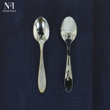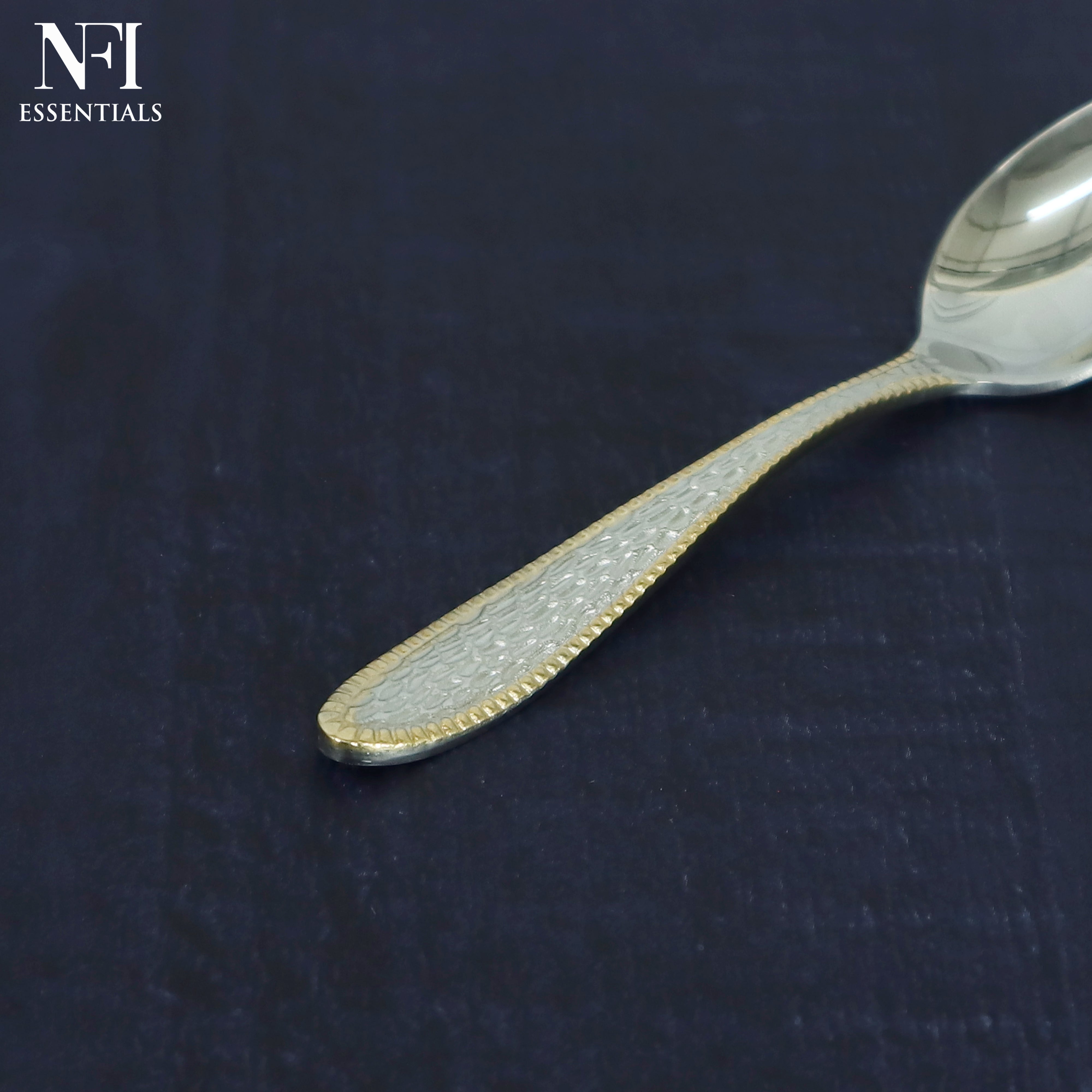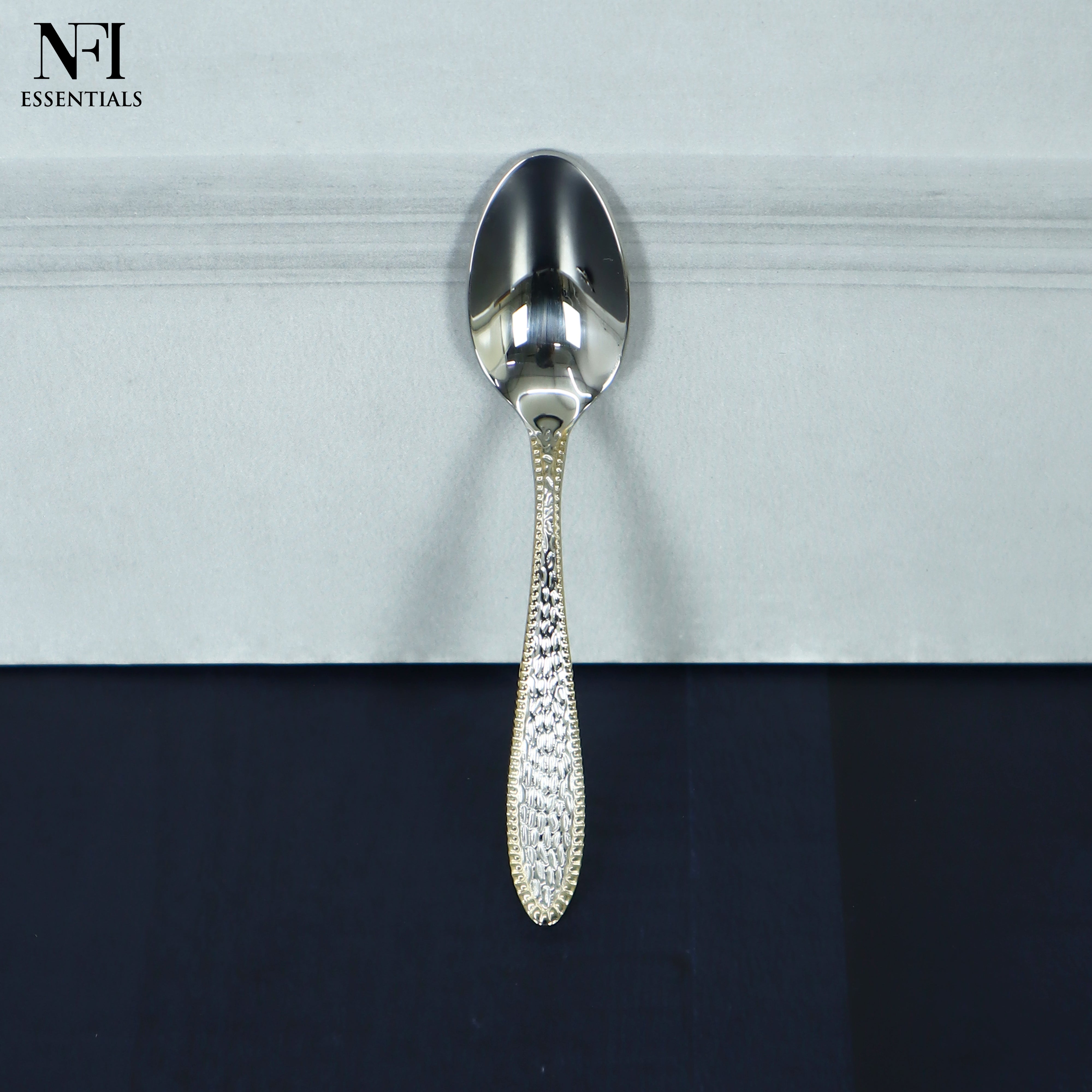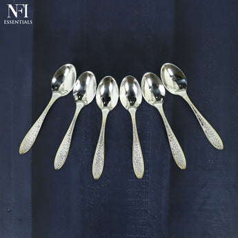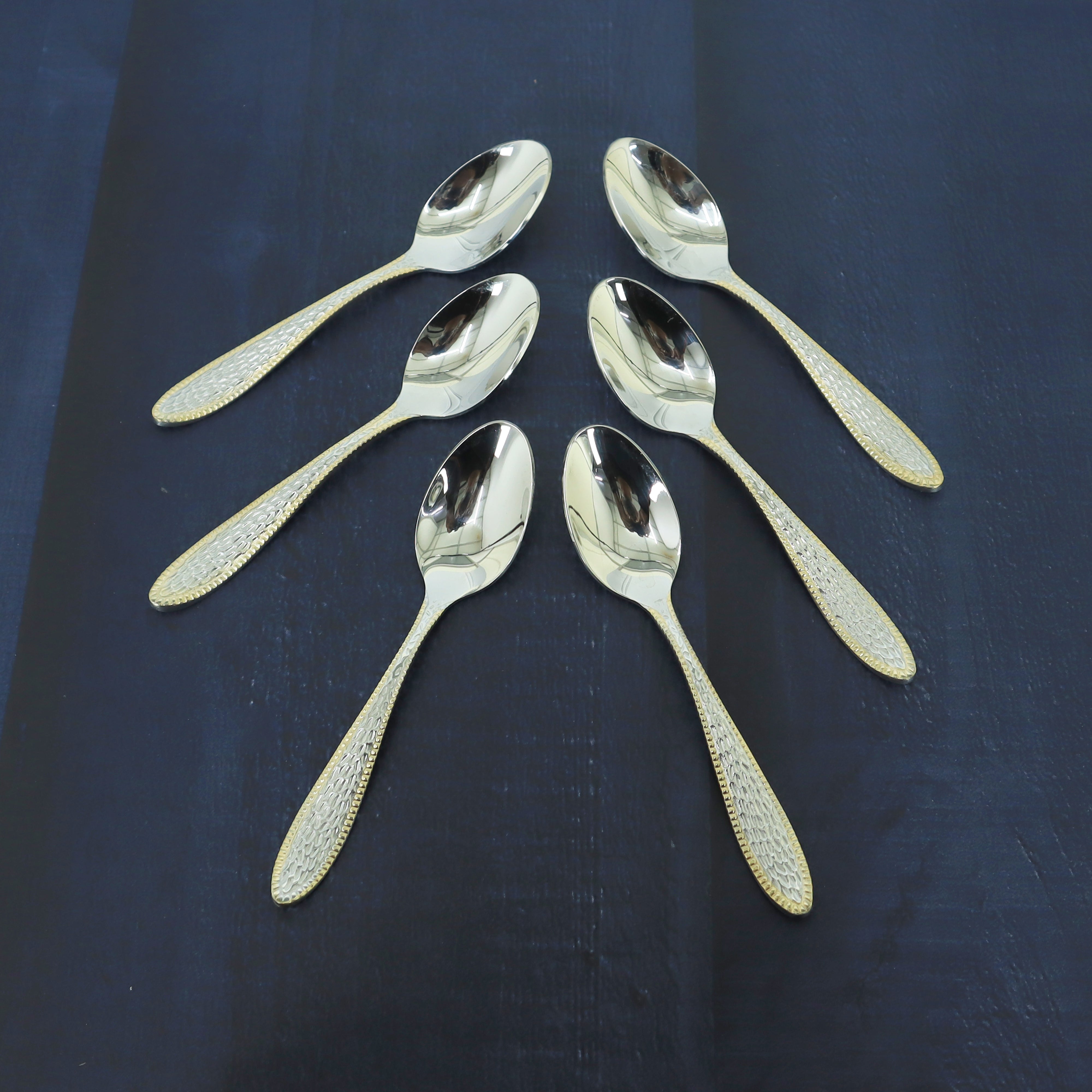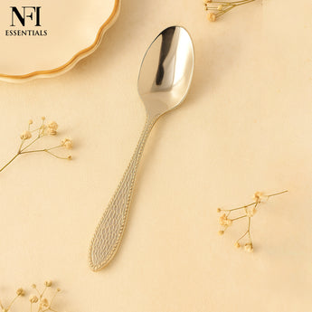 Elevate your dining experience with this premium set of stainless steel spoons, designed for both everyday use and special occasions. Expertly crafted from high-quality stainless steel, these spoons combine durability, elegance, and practicality into one timeless piece of cutlery. Each spoon features a beautifully textured handle with an intricate embossed pattern that enhances both the look and grip, making them not only visually appealing but also comfortable to hold. With a total weight of approximately 355 grams for the set of six (around 59 grams each), these spoons offer a well-balanced feel in the hand, ideal for those who appreciate solid, well-made utensils. The sturdy construction ensures resistance to rust, corrosion, and daily wear, while the polished finish adds a refined touch to your dining table. Designed with versatility in mind, these spoons are suitable for a variety of uses—from serving rice, soup, and desserts to enjoying everyday meals with family and guests. Whether you are upgrading your kitchen essentials or looking for a stylish gift, this spoon set is a perfect choice. Maintenance is effortless—simply rinse and place them in the dishwasher to retain their shine and quality over time. This set brings together elegance, functionality, and long-lasting performance, making it a valuable addition to any modern kitchen.