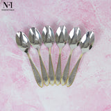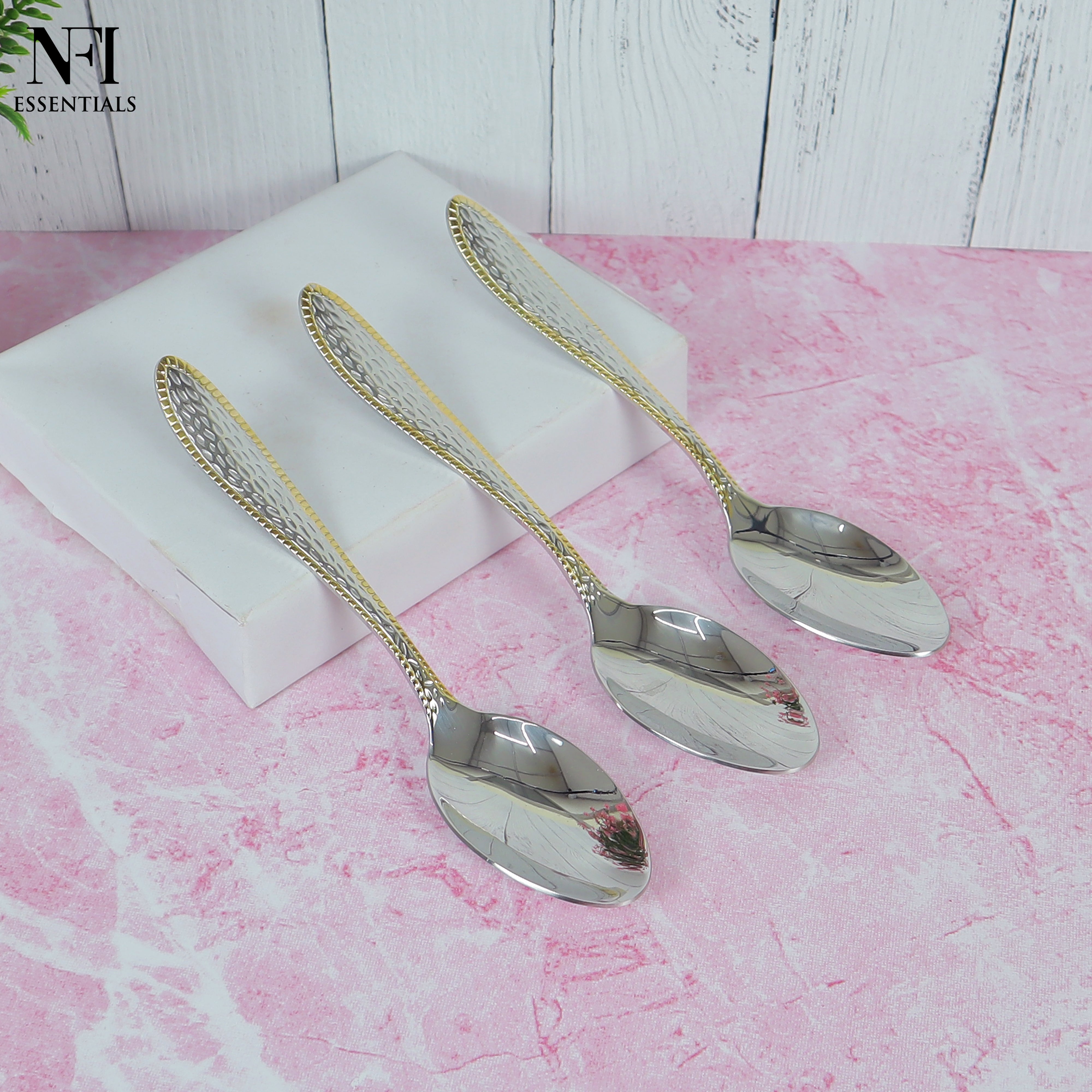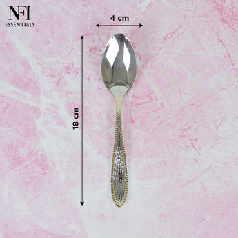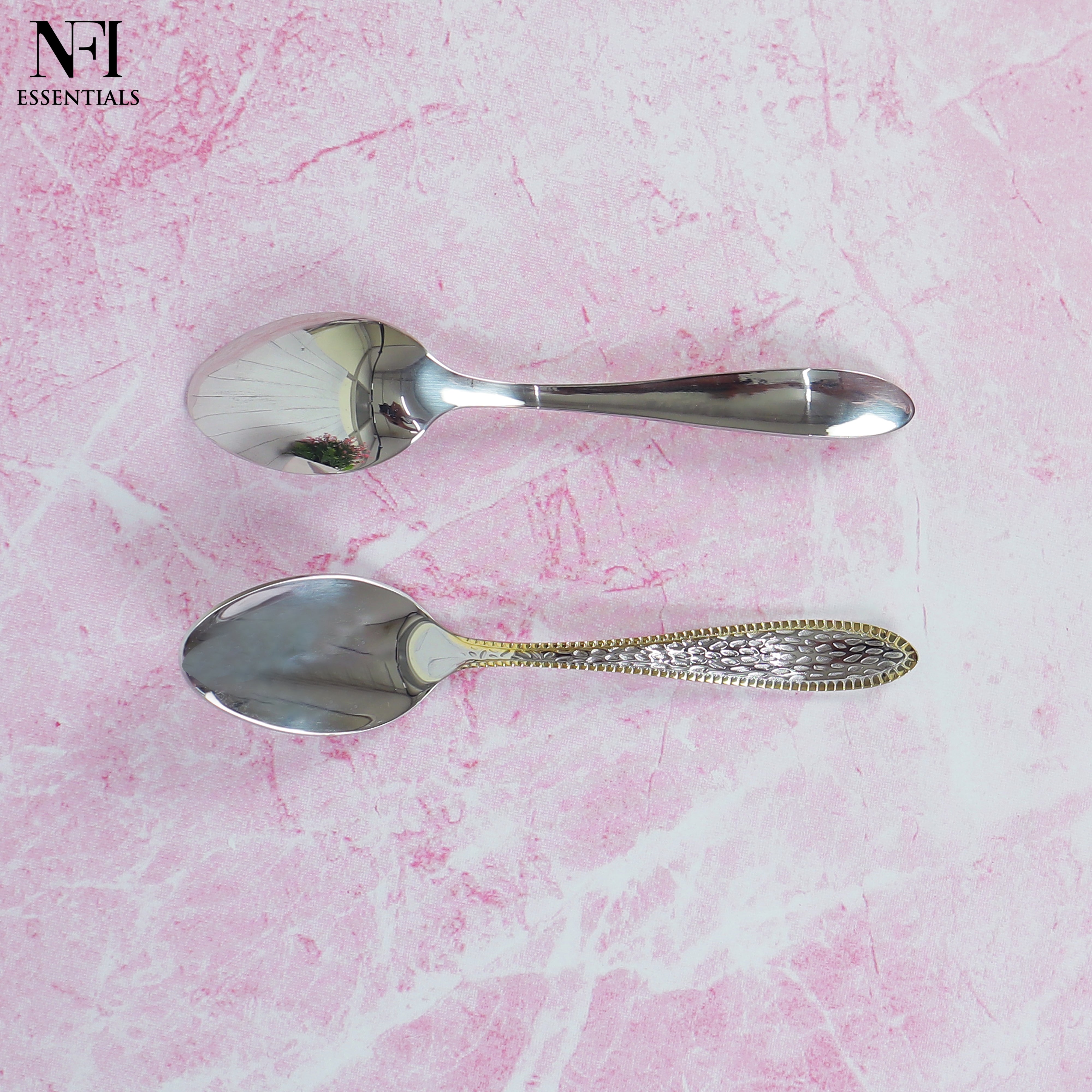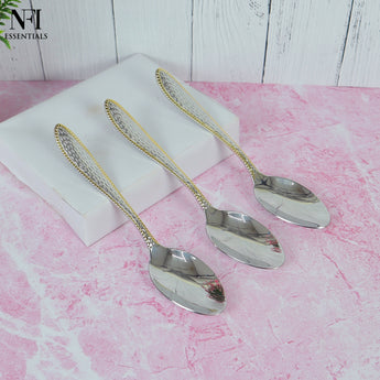 Elevate your dining experience with this premium set of stainless steel spoons, designed for both everyday use and special occasions. Expertly crafted from high-quality stainless steel, these spoons combine durability, elegance, and practicality into one timeless piece of cutlery. Each spoon features a beautifully textured handle with an intricate embossed pattern that enhances both the look and grip, making them not only visually appealing but also comfortable to hold. With a total weight of approximately 355 grams for the set of six (around 59 grams each), these spoons offer a well-balanced feel in the hand, ideal for those who appreciate solid, well-made utensils. The sturdy construction ensures resistance to rust, corrosion, and daily wear, while the polished finish adds a refined touch to your dining table. Designed with versatility in mind, these spoons are suitable for a variety of uses—from serving rice, soup, and desserts to enjoying everyday meals with family and guests. Whether you are upgrading your kitchen essentials or looking for a stylish gift, this spoon set is a perfect choice. Maintenance is effortless—simply rinse and place them in the dishwasher to retain their shine and quality over time. This set brings together elegance, functionality, and long-lasting performance, making it a valuable addition to any modern kitchen.