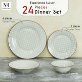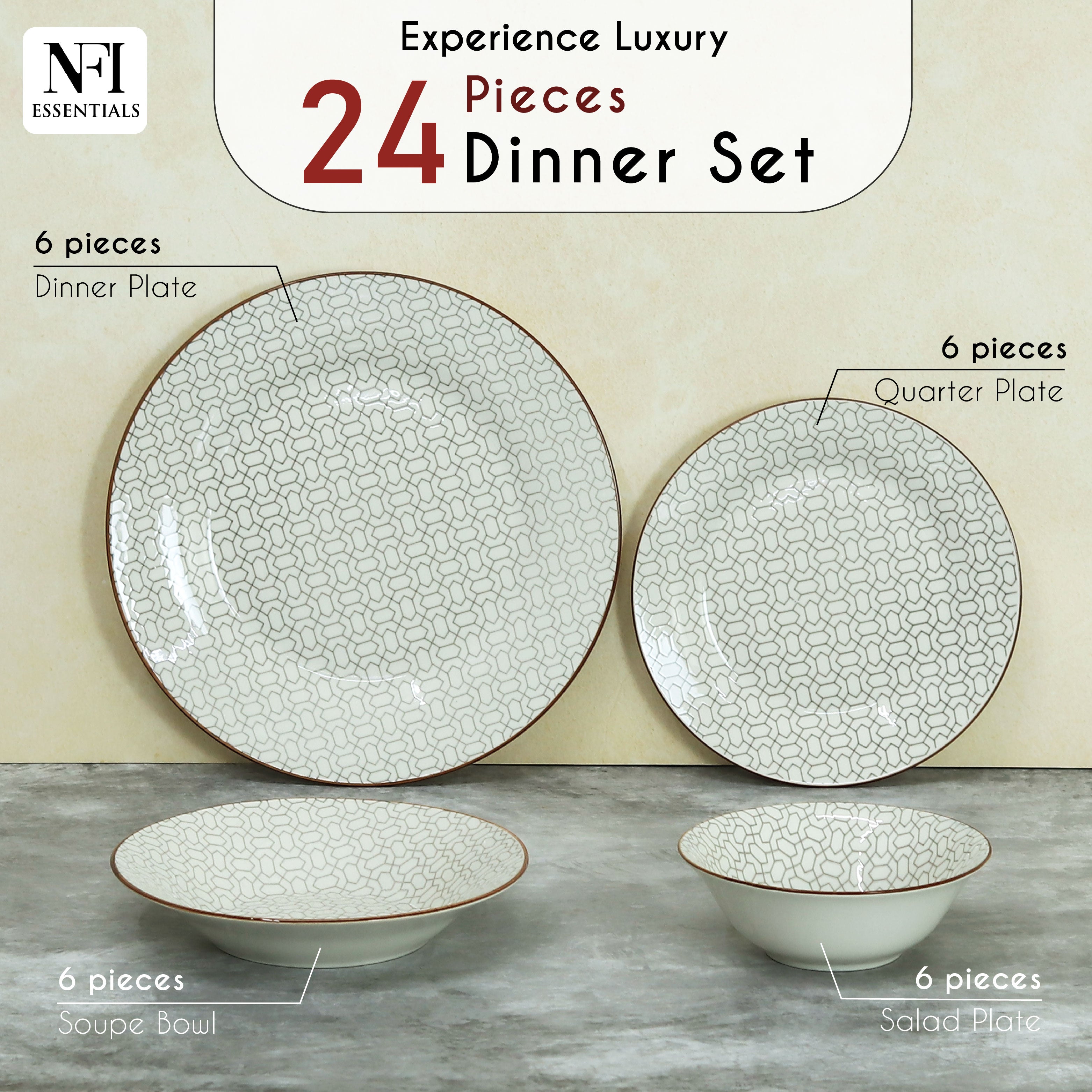 NFI essentials 24 pcs Ceramic Dinner Set for Dining Interlocking Pattern Microwave and Dishwasher Safe Crockery Set Quality Porcelain 6 Dinner Plates, 6 Quarter Plate, 6 Salad Plate & 6 Set Of Bowls