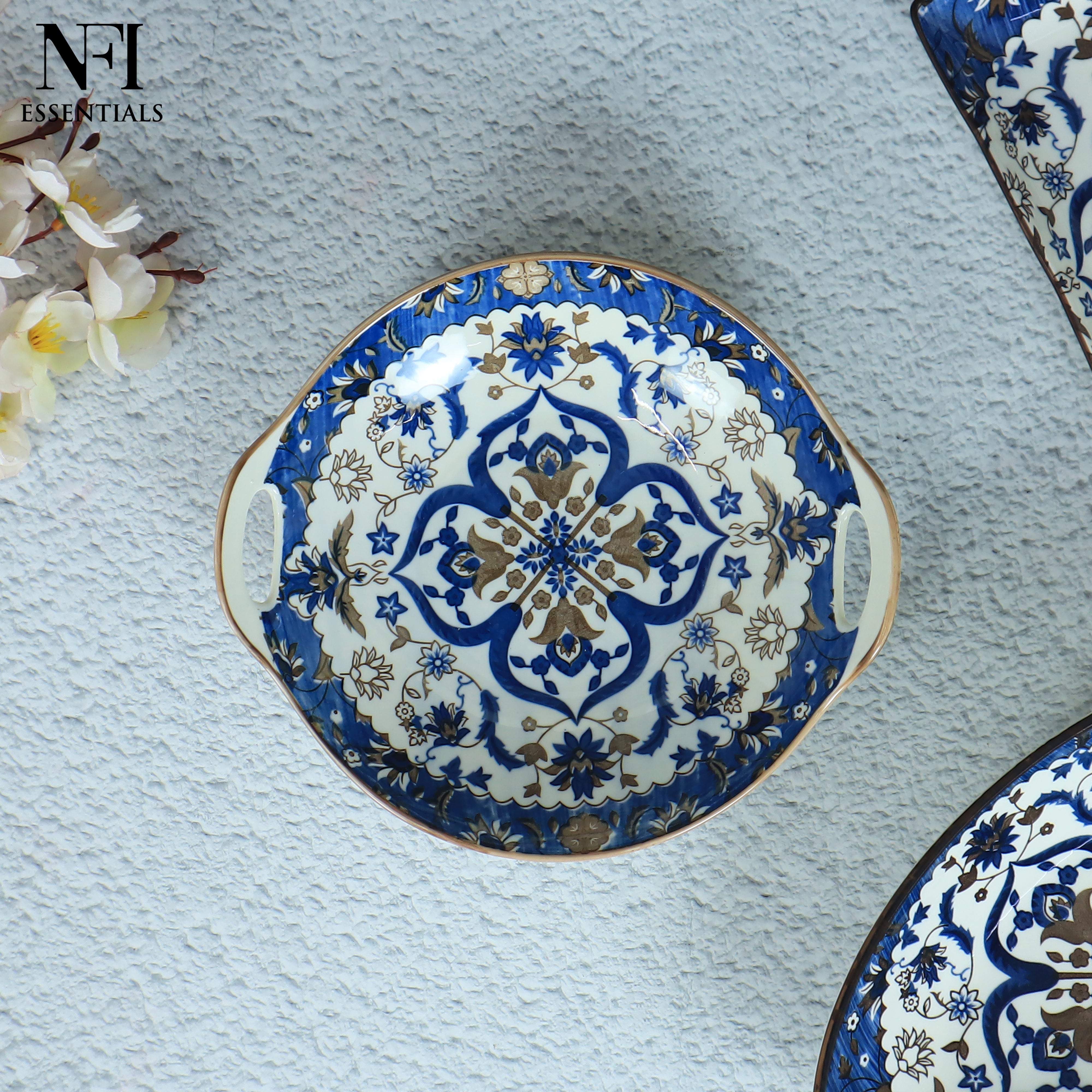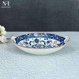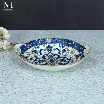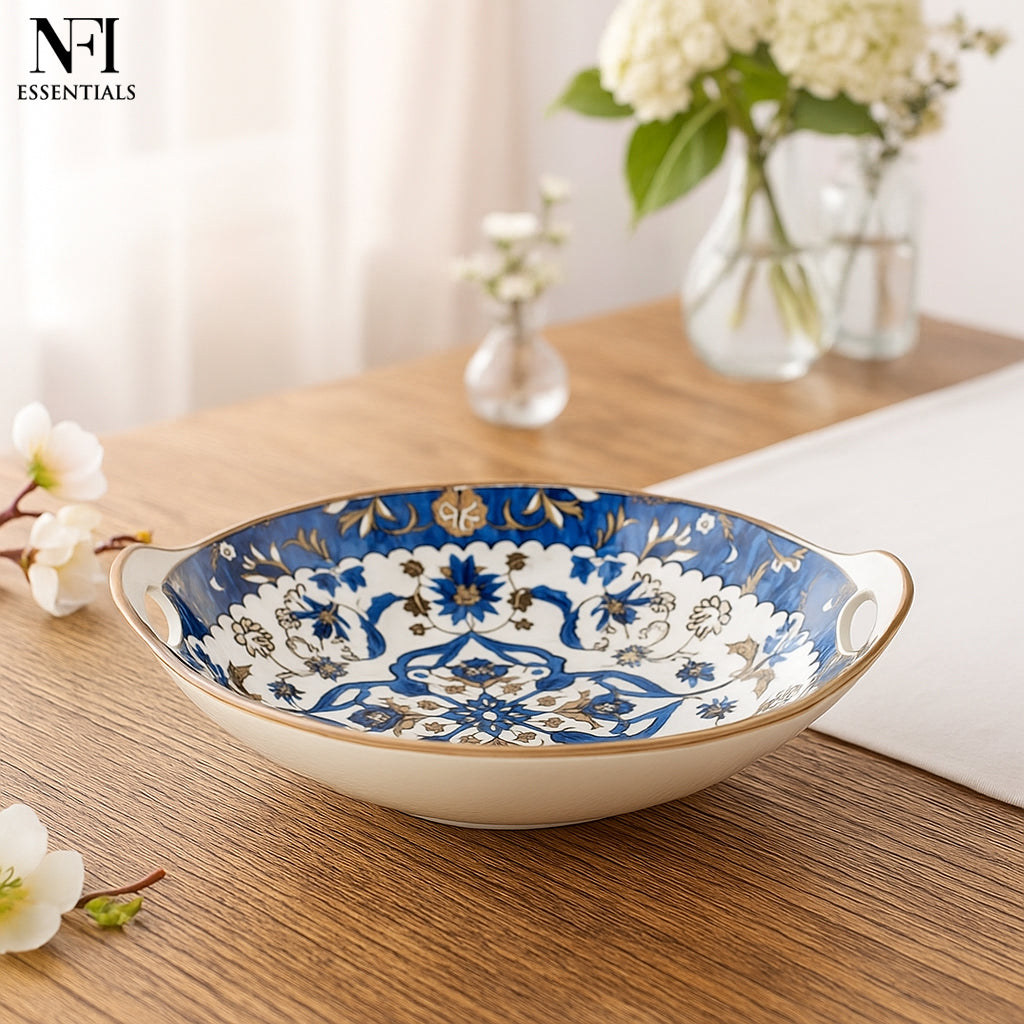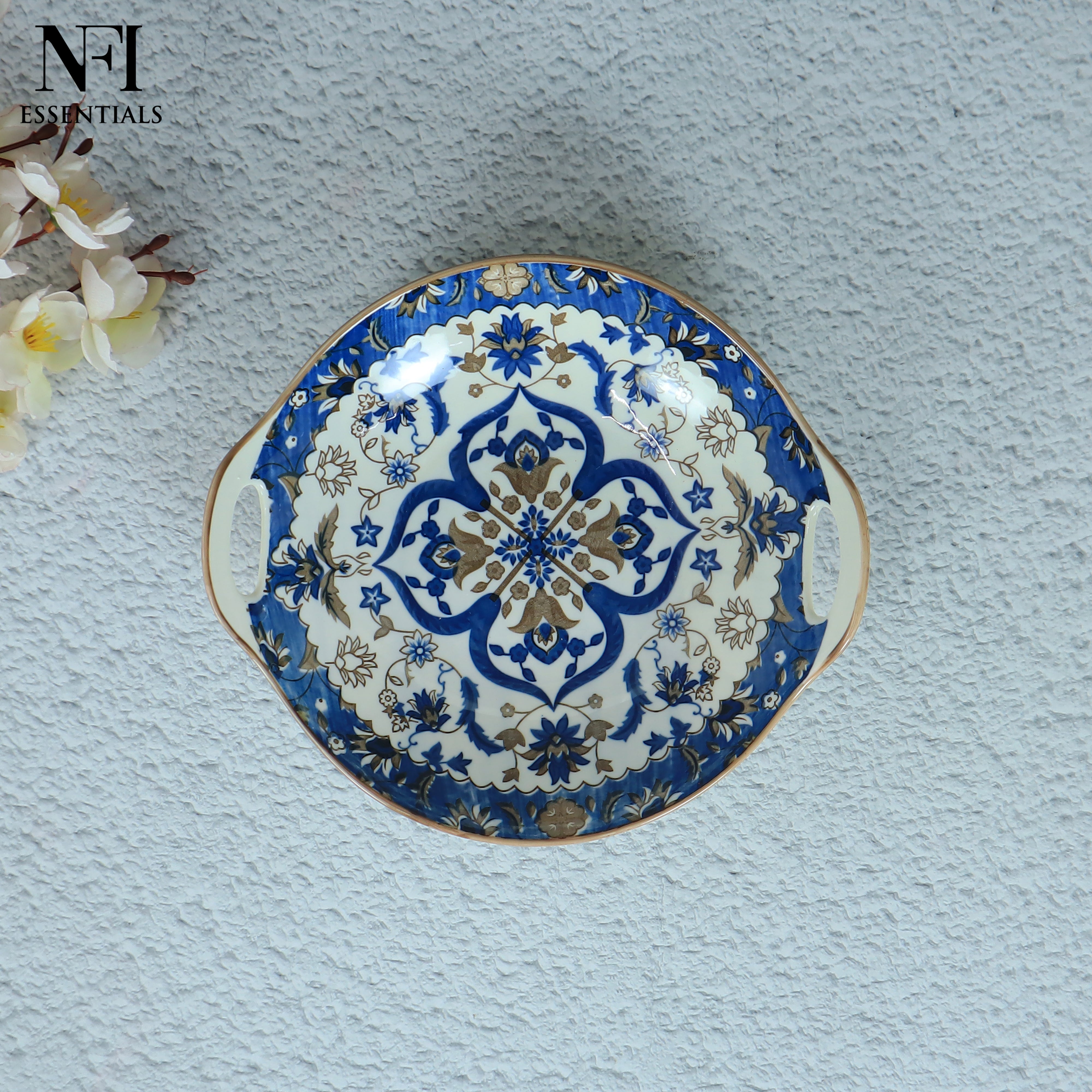 NFI essentials Ceramic Serving Platter with with Handles Blue Mandala Design for Snacks, Appetizers, Salads, and Noodles | Safe for the Microwave and Dishwasher (8.5 inch)