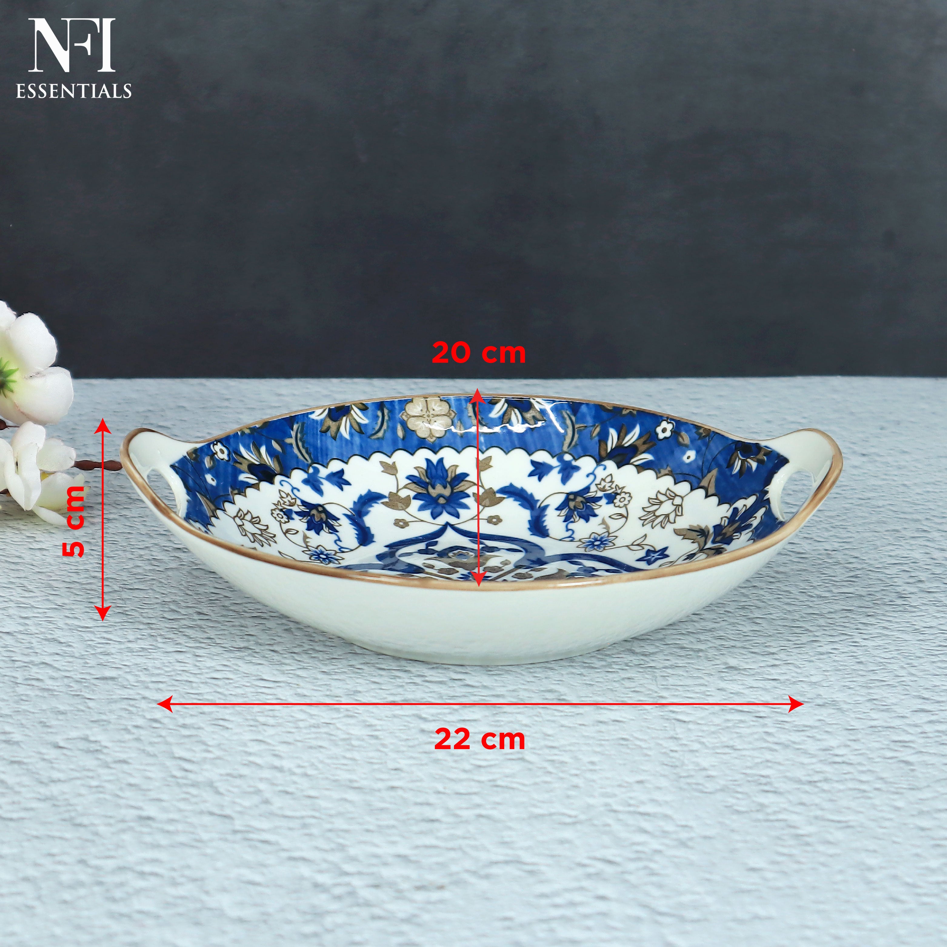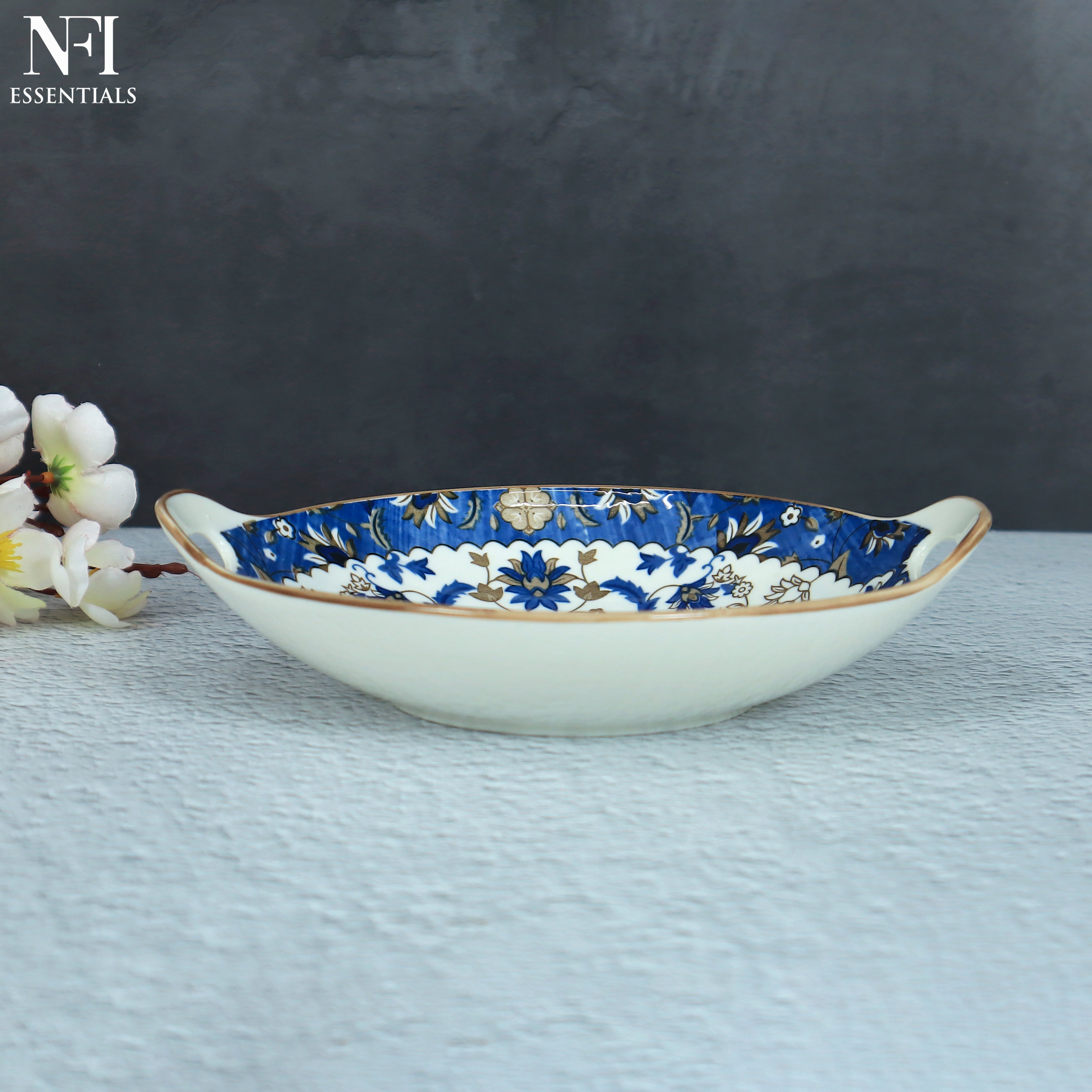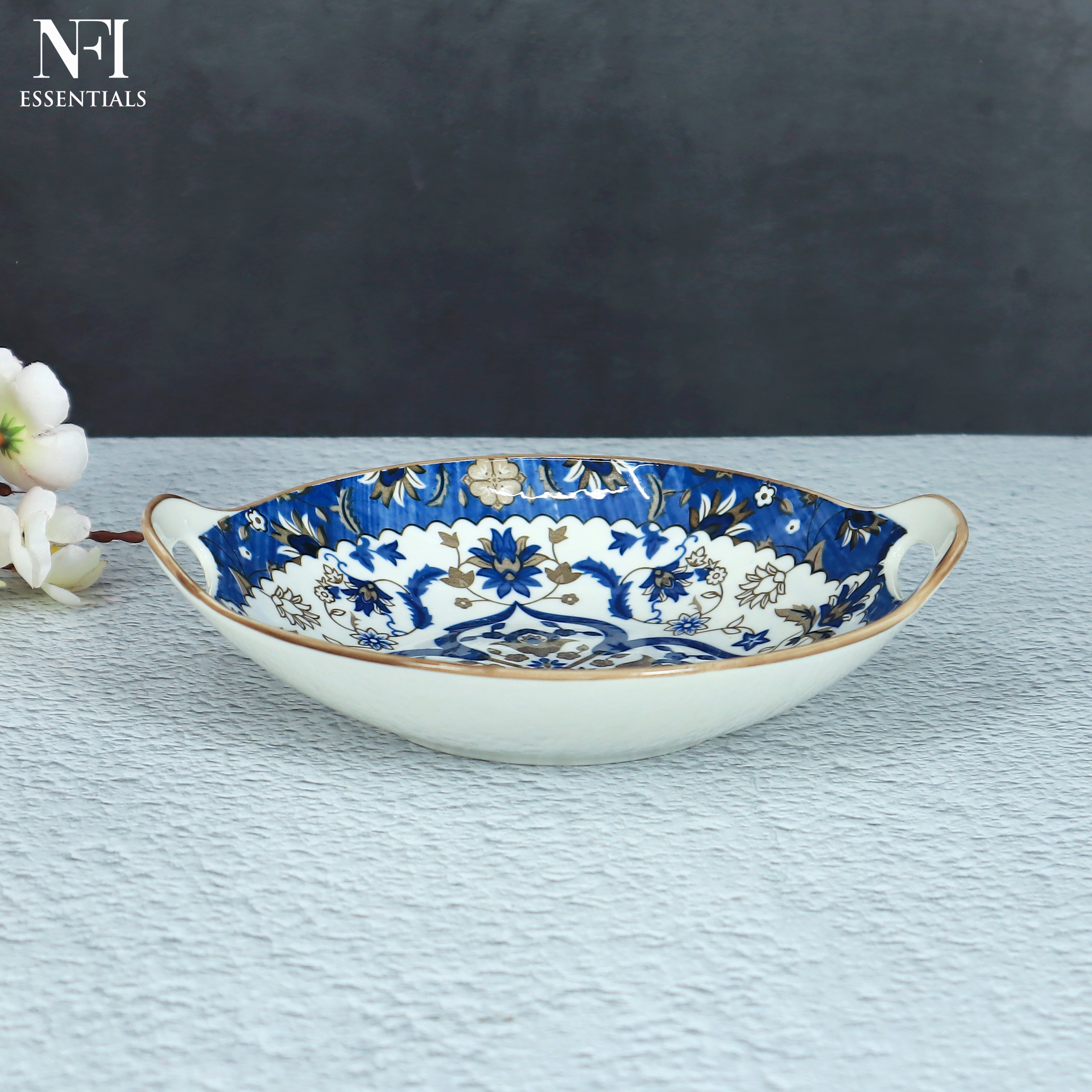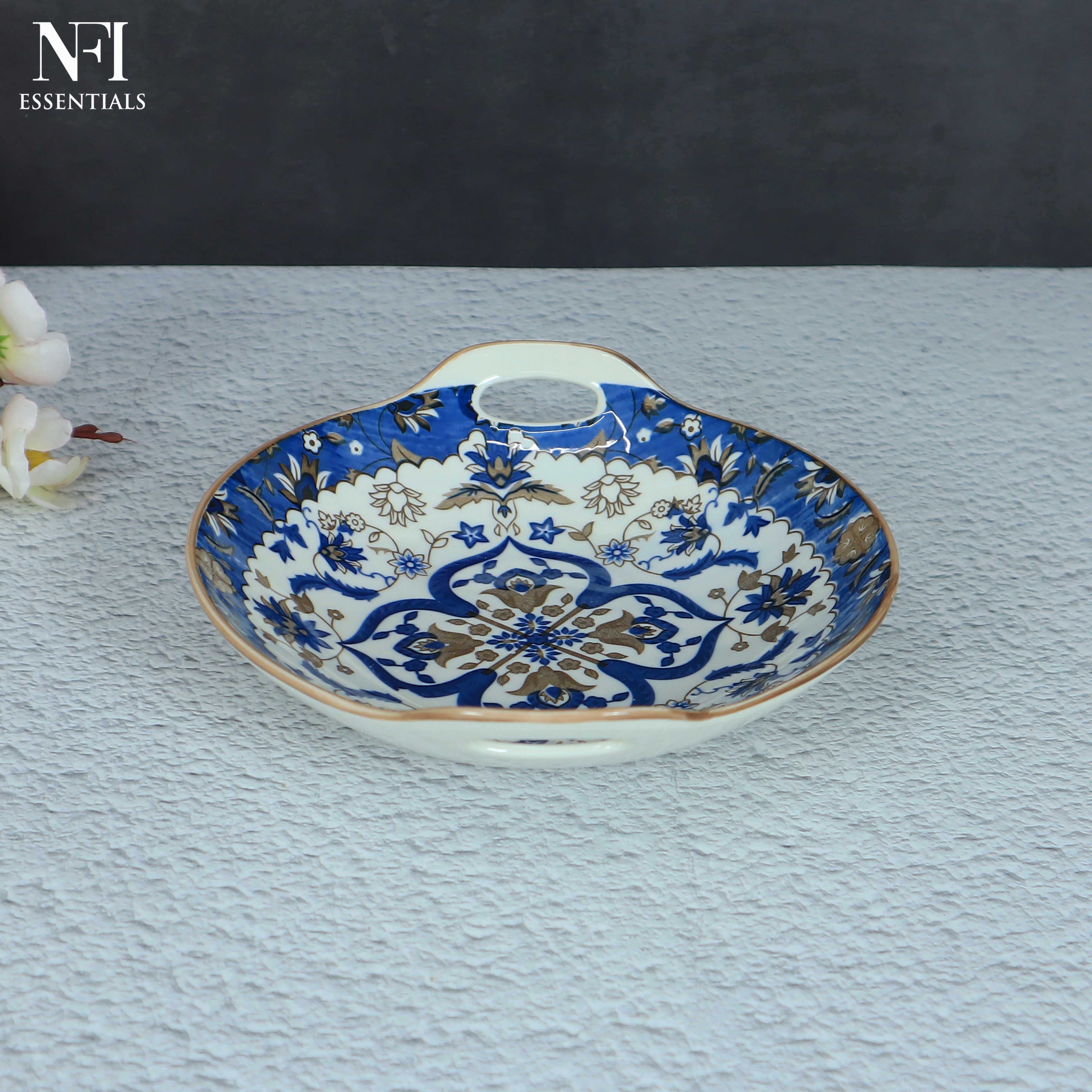 NFI essentials Ceramic Serving Platter with with Handles Blue Mandala Design for Snacks, Appetizers, Salads, and Noodles | Safe for the Microwave and Dishwasher (8.5 inch)