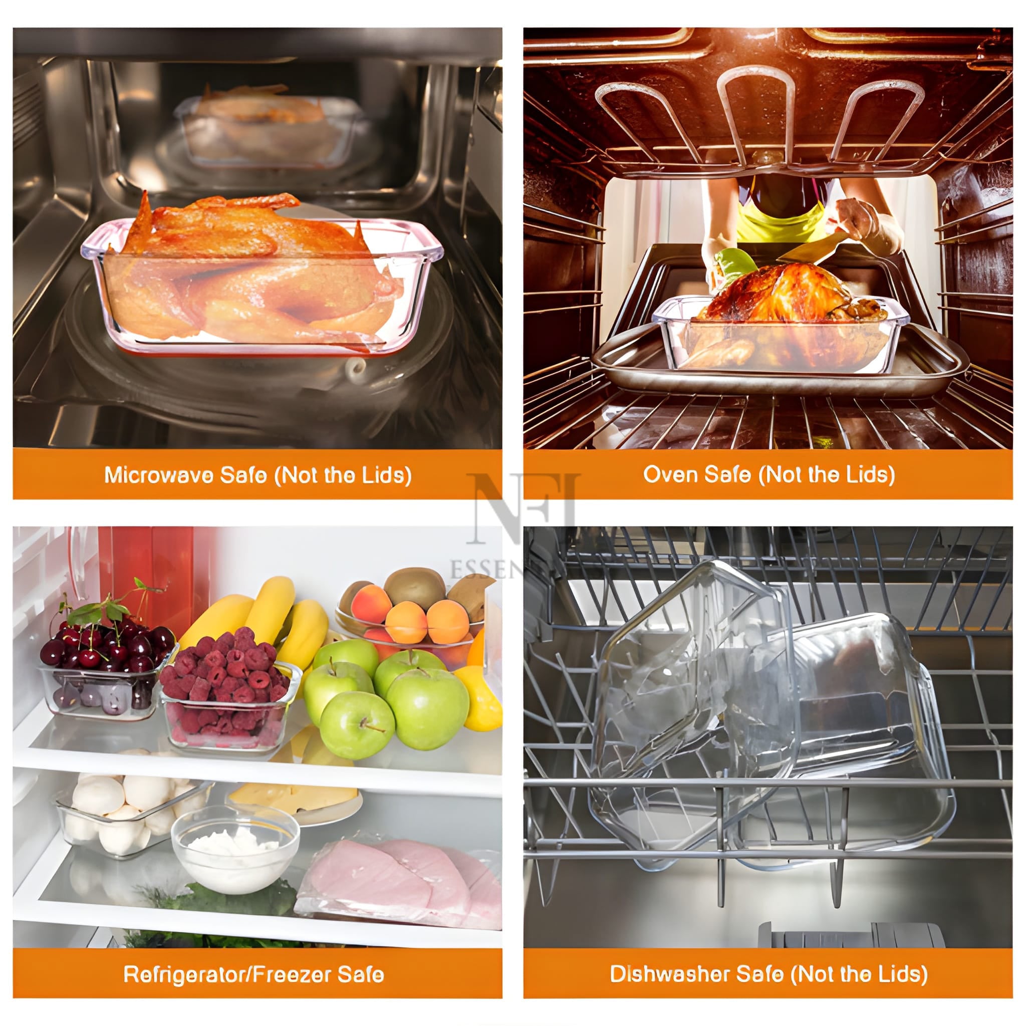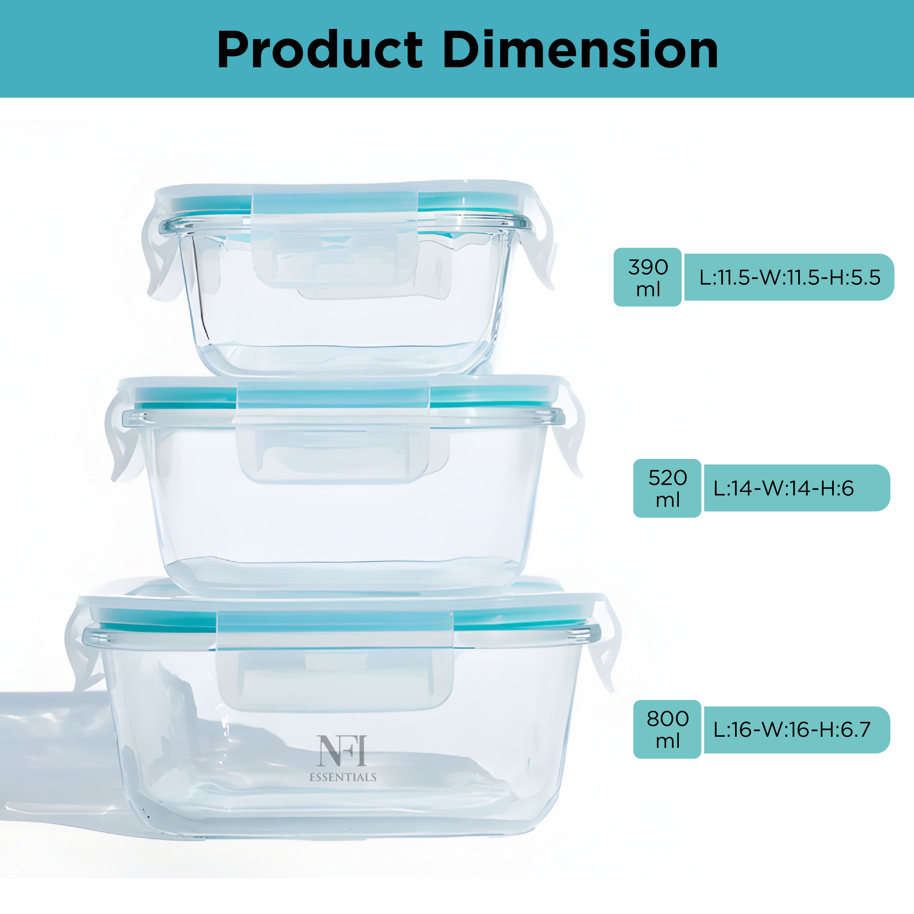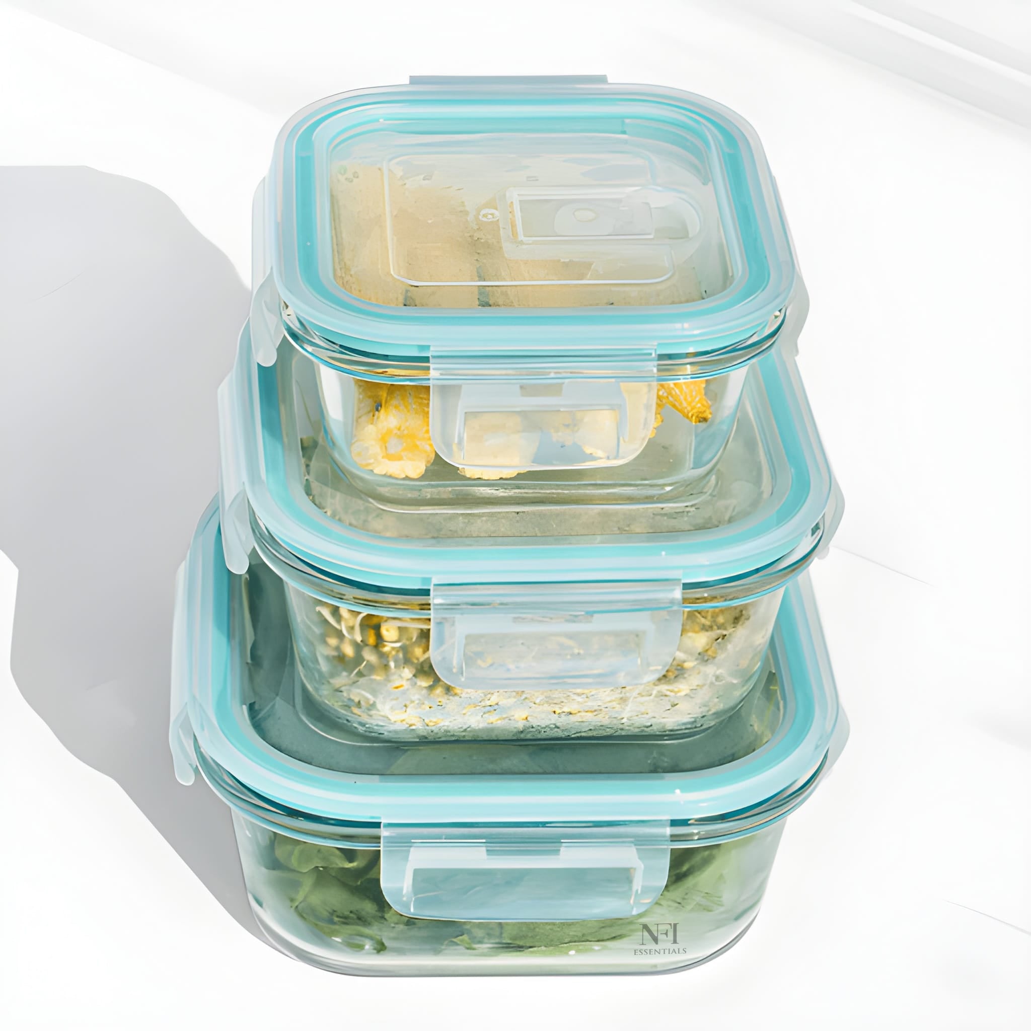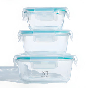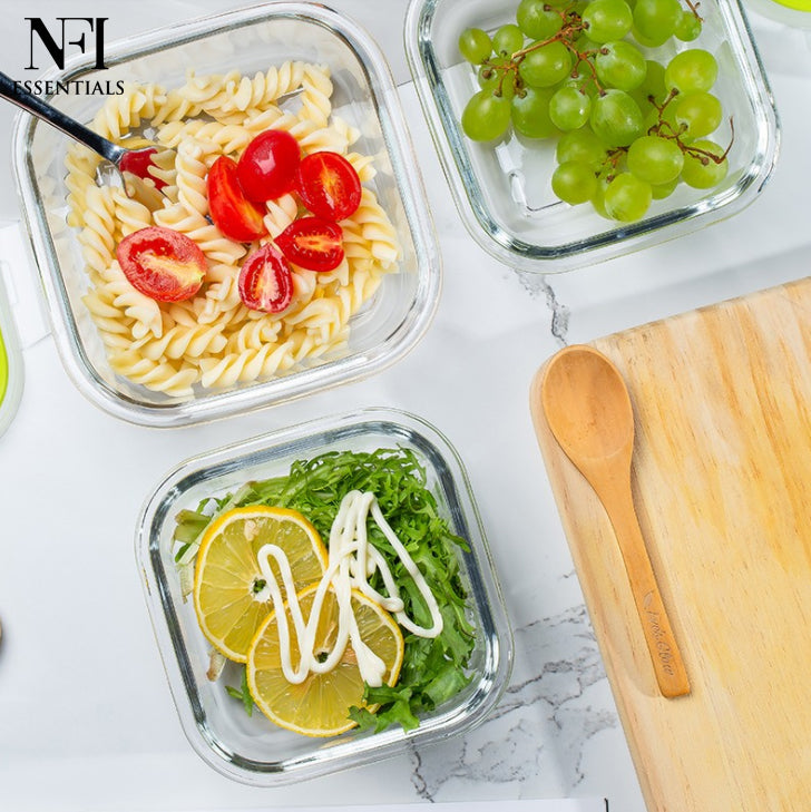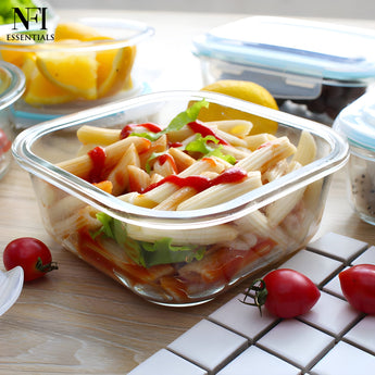 Upgrade your kitchen storage with NFI essentials Premium Food Safe Glass Containers A perfect combination of safety, versatility, and modern design. Made from durable, high-quality borosilicate glass, these containers a healthier alternative to plastic for storing, baking, and reheating food. Whether you're meal prepping for the week, saving leftovers, or baking your favorite dishes, these containers are designed to handle it all. Each container features a secure, airtight, and leak-proof lid that locks in freshness and prevents spills, making them ideal for storing soups, sauces, fruits, vegetables, or full meals. Designed for multi-purpose use, these containers transition seamlessly from fridge to freezer, oven to microwave, and even straight to the dining table