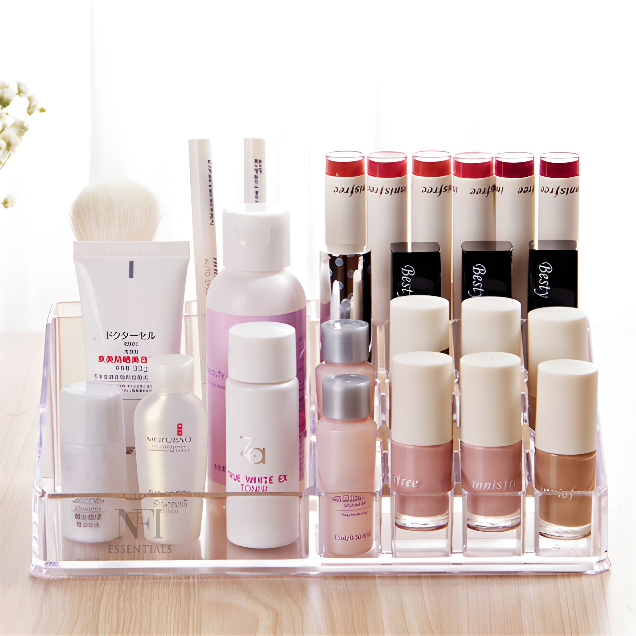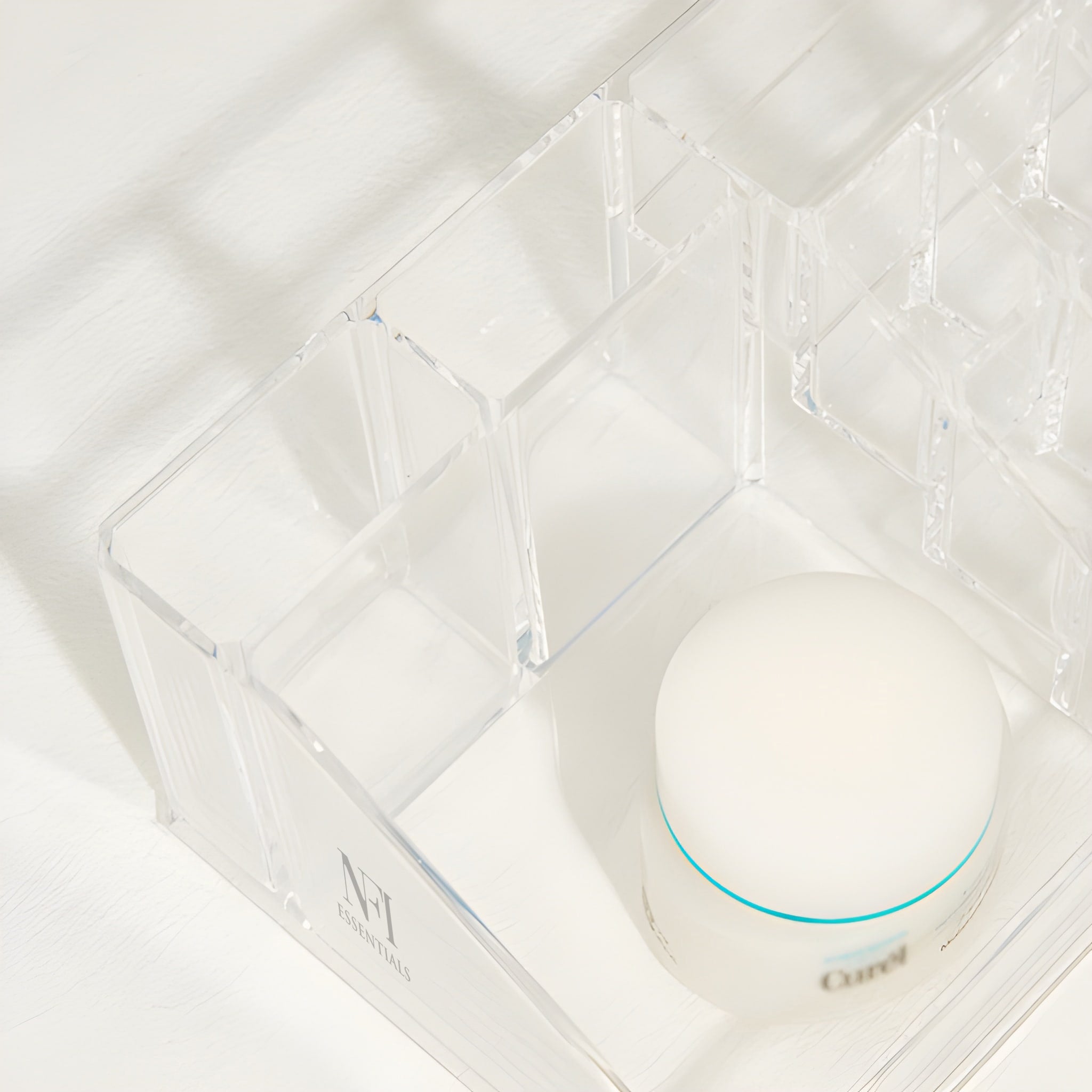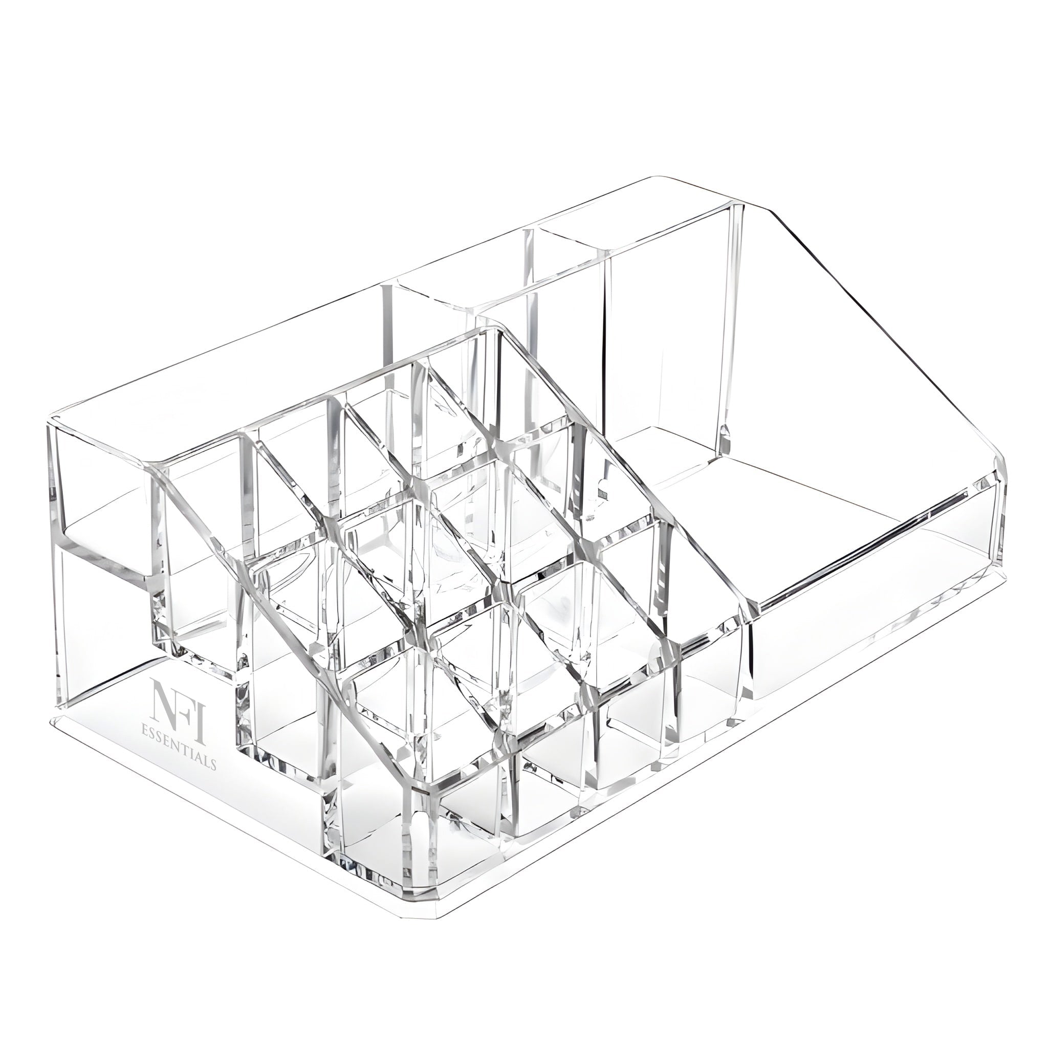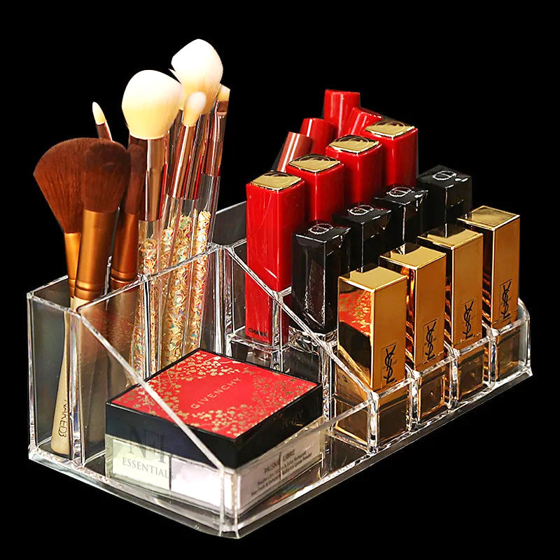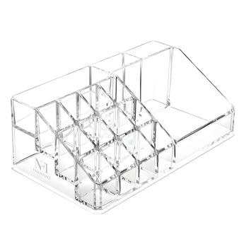 This sturdy, clear acrylic makeup organiser includes 16 slots to fit variously sized cosmetics. The slots are great for keeping brushes, lipsticks, eye pencils, and perfume bottles protected, upright, and in place. The drawers are perfect for storing palettes, foundations, bronzers, blushes, primers, powders, jewellery, accessories, keepsakes, and more. This storage case can be stored in bathrooms, closets, vanity counters, dressers, and most tabletops.