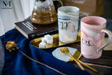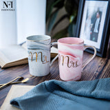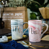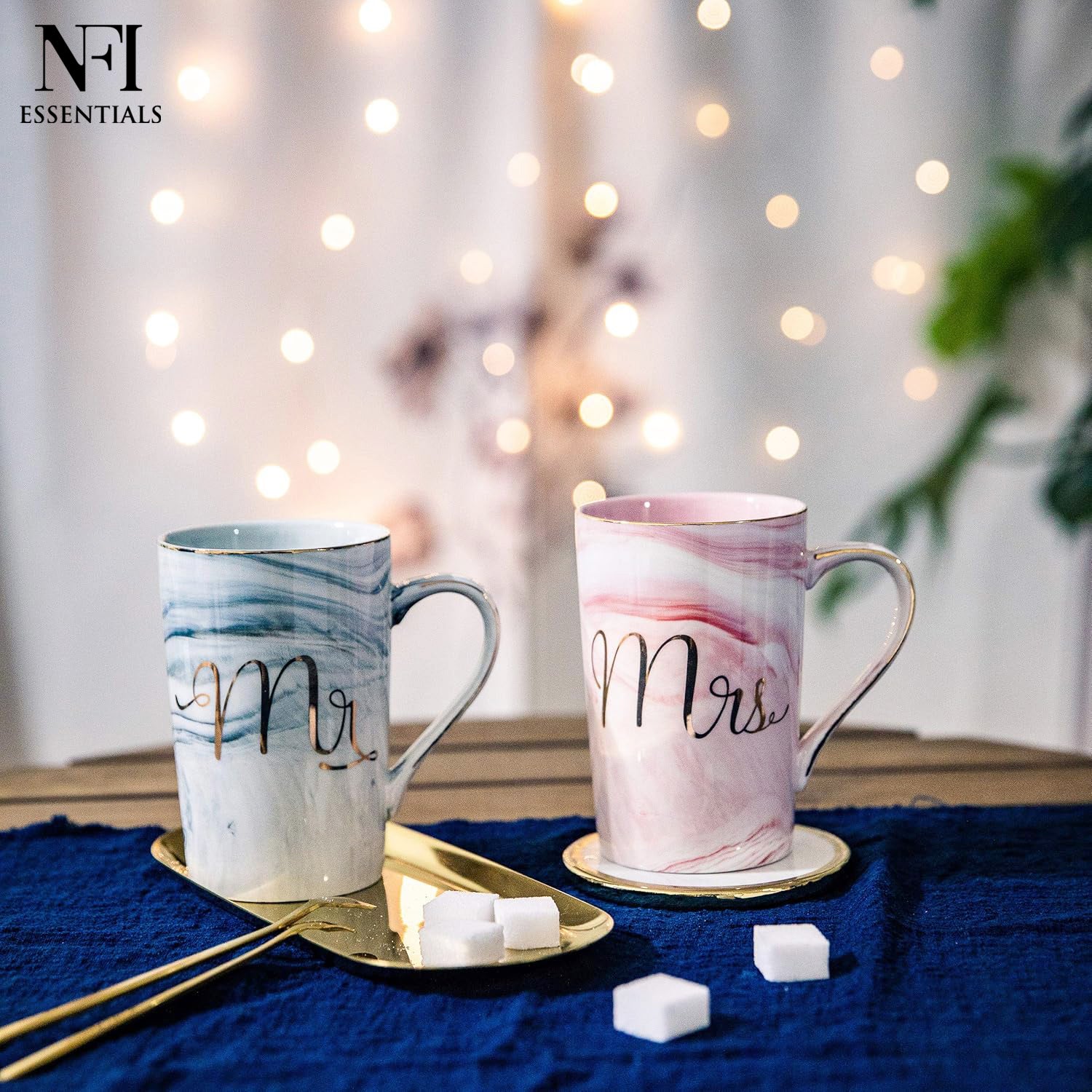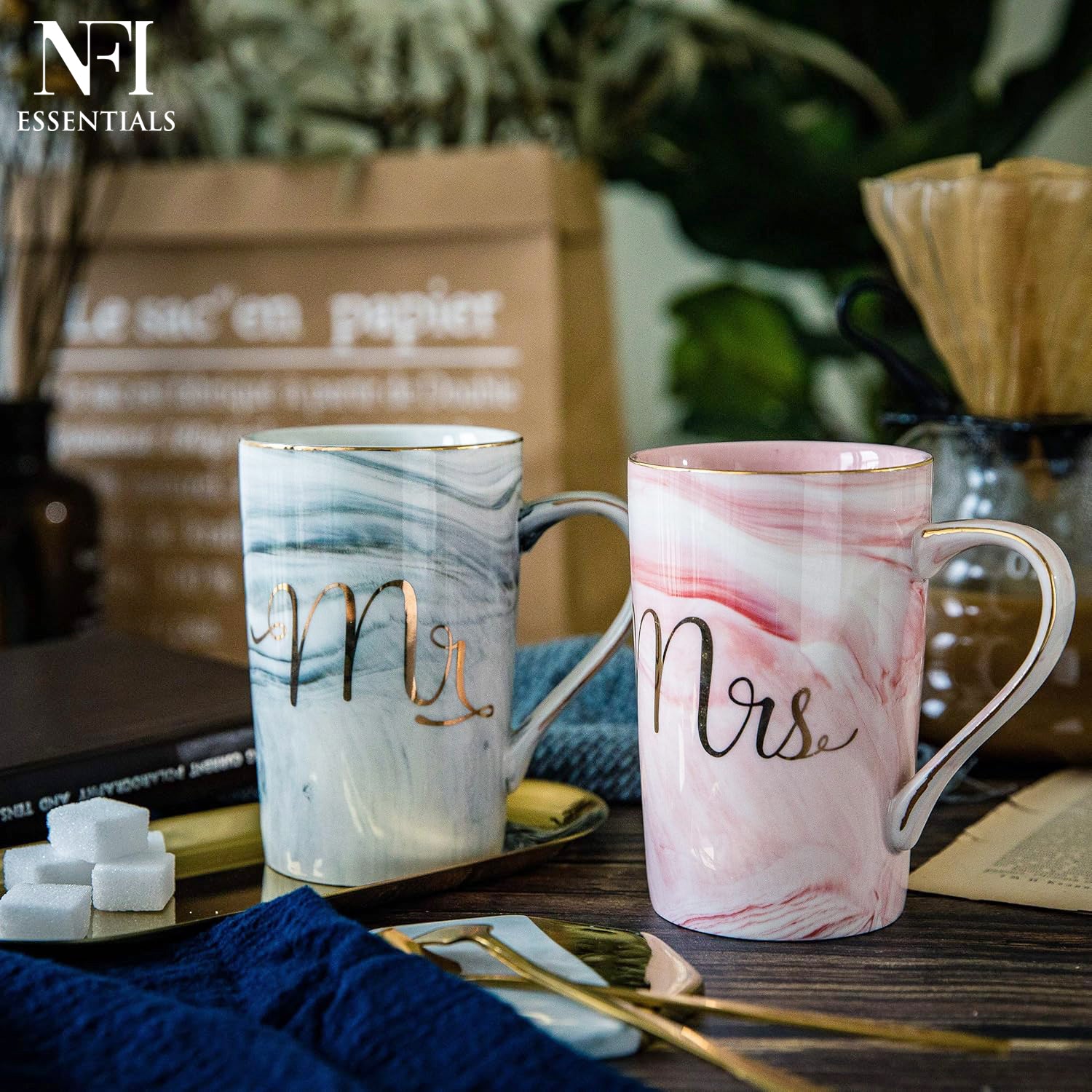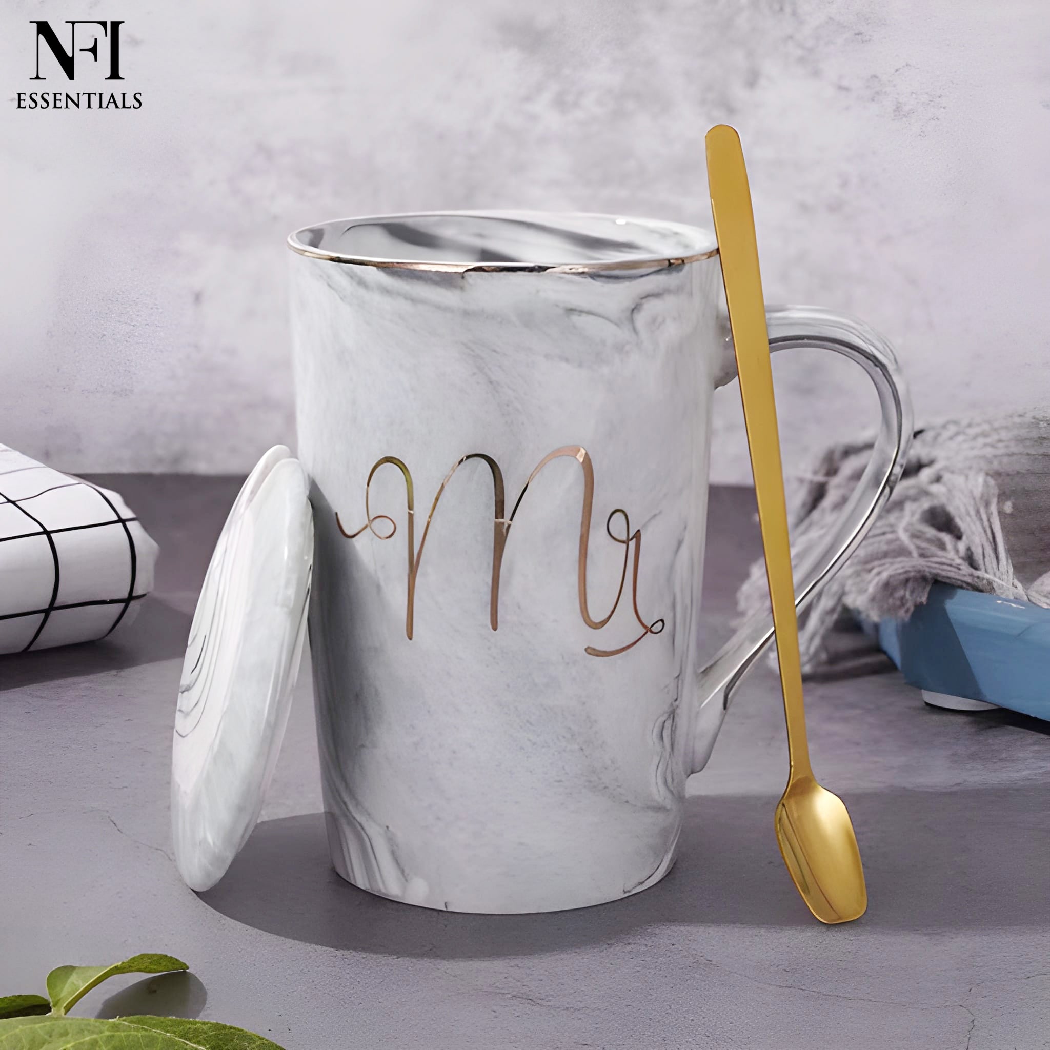 NFI essentials Set of 2 Mr & Mrs Ceramic Marble finish Coffee Mug Set with Lids and Golden Spoons Perfect Couple Gift for Anniversary, Wedding, Engagement Tea & Coffee Lovers (350 ml)