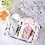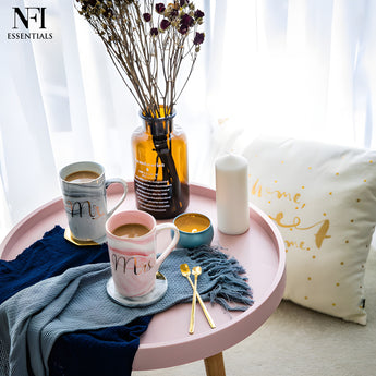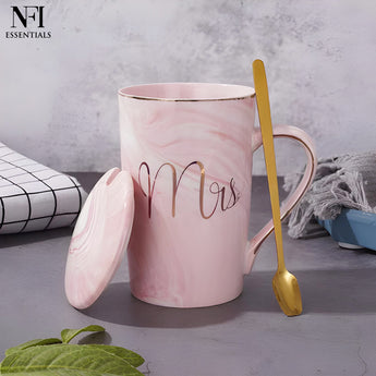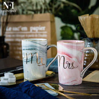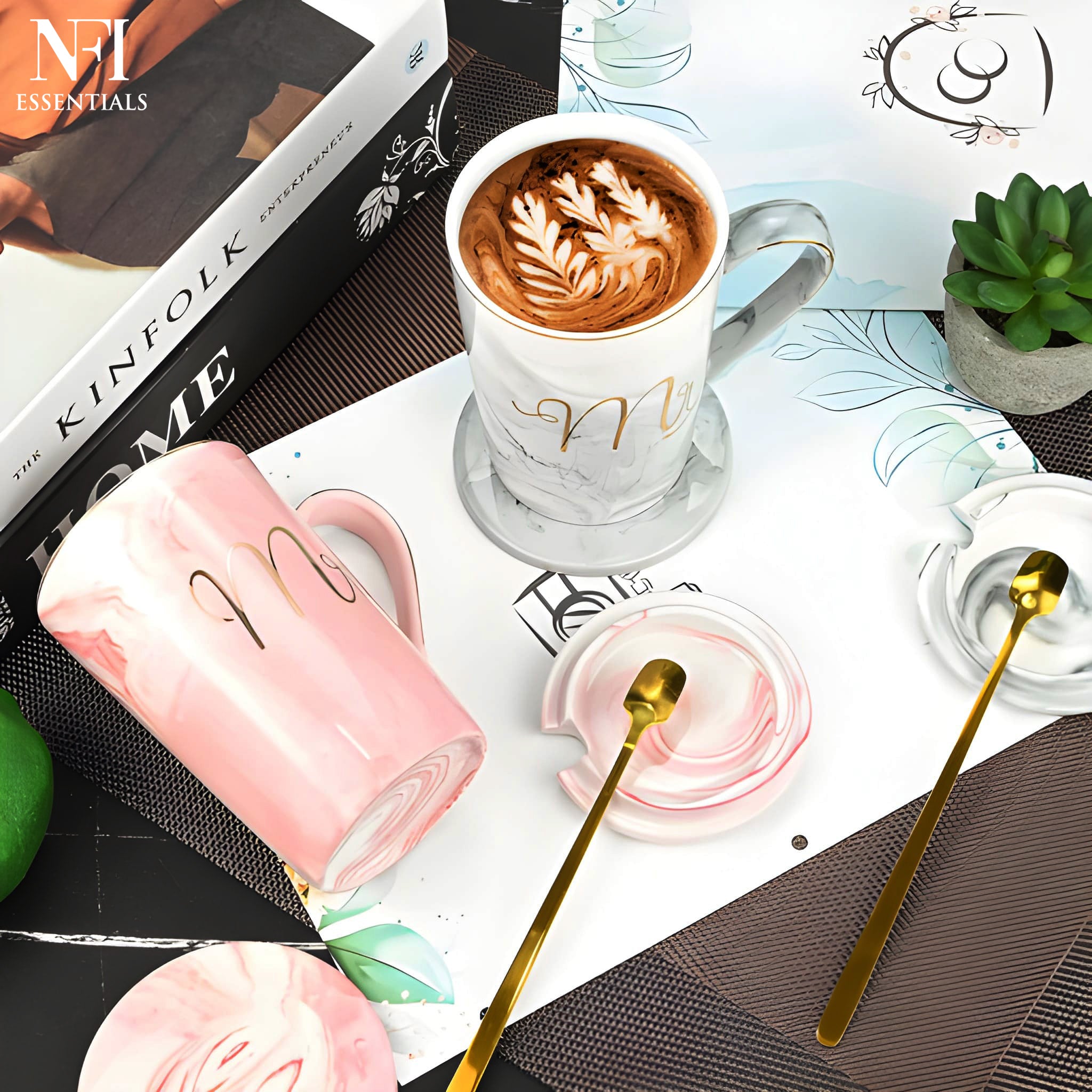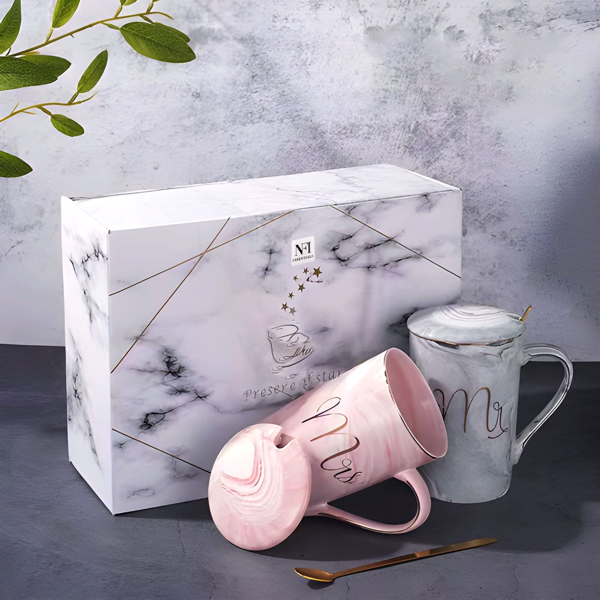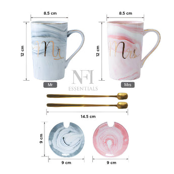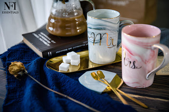 Celebrate love, togetherness, and the joy of sharing every sip with NFI essentials elegantly crafted Mr and Mrs Ceramic Mug Gift Set. Designed with both beauty and practicality in mind, this premium set includes two beautifully marbled ceramic mugs, Each mug is made from high-quality, durable ceramic that keeps beverages warmer for longer, while the smooth glazed finish gives it a luxurious feel in the hand. With a generous 14 oz (414 ml) capacity, these mugs are perfect for coffee, tea, hot chocolate, lattes, or any favorite beverage.The set also includes two matching ceramic lids to keep drinks warm and prevent spills, and two gold-plated stainless steel spoons with a modern, elegant design perfect for stirring or adding a touch of class to your table setting.