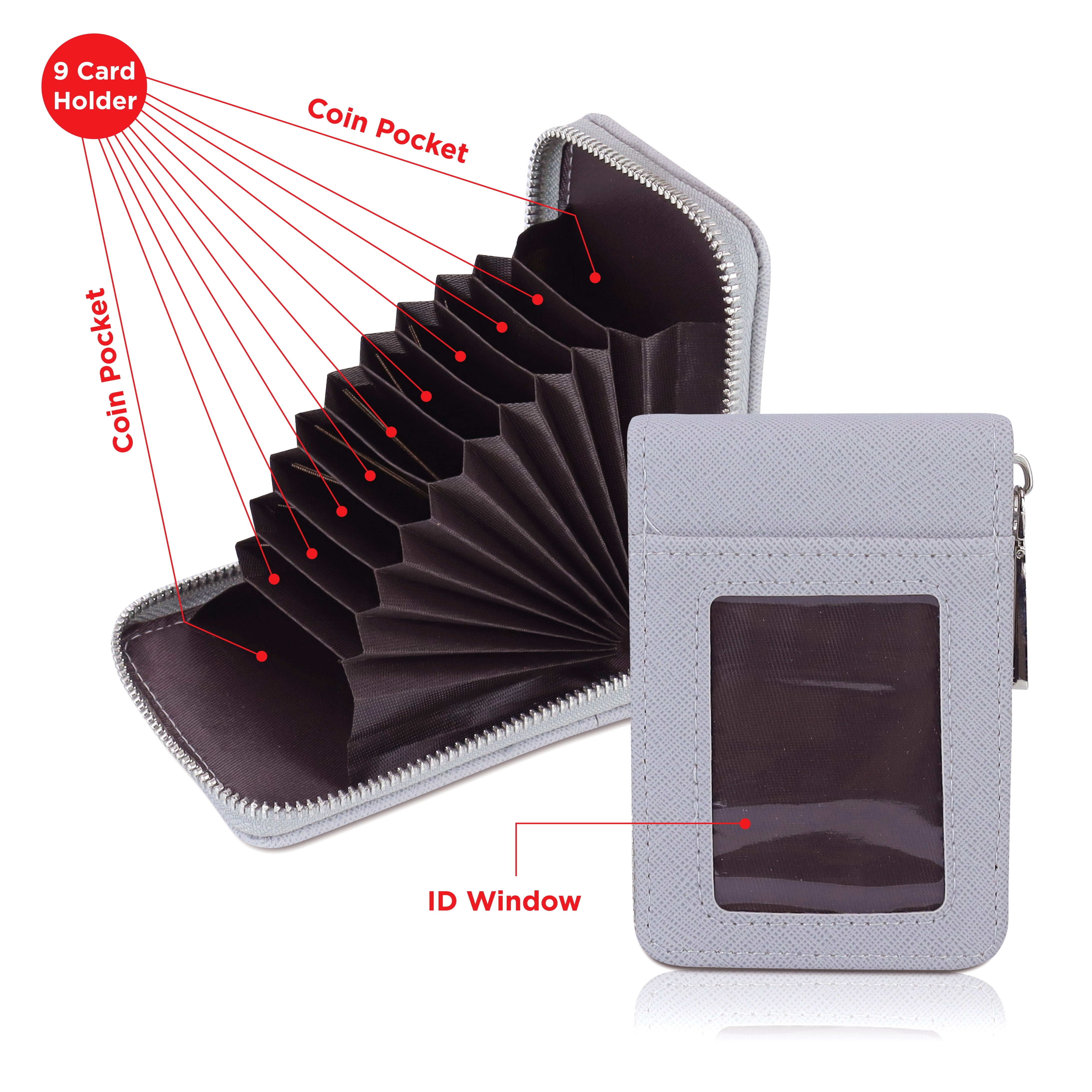 Compact design allows this small card holder wallet with plenty of space to fit in your handbag or pocket.zippered sections on this spacious accordion-style credit card holder: one for credit cards and the other for coins or folded cash. Lots of room, with 9 spaces available. With the use of a zipper, you may safely hold your cash or coins so they won't fall out. Two cash and ninedit card slots. Its large capacity is ideal for holding coins, cash, and cards. Equipped with advanced RFID blocking technology which aims to protect your credit cards, debit cards, driver license and ID cards from unauthorized scanning.