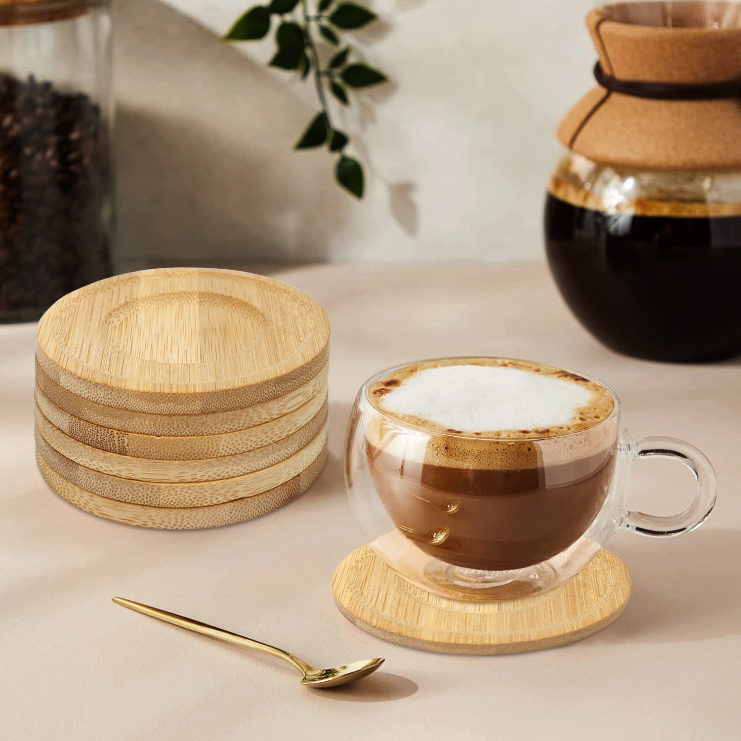 This round wooden coasters Set of 6 with holder is made from high quality Bamboo Wood. It receives moisture flowing from the glass to prevent the table from getting wet and protect it from damage. Perfect for teacups, drinks glasses, bottles, coffee, bear, beverages and cans. Use it as a great place to keep your coasters for drinks, as well as your workstation, neat and organized and a unique gift idea too!